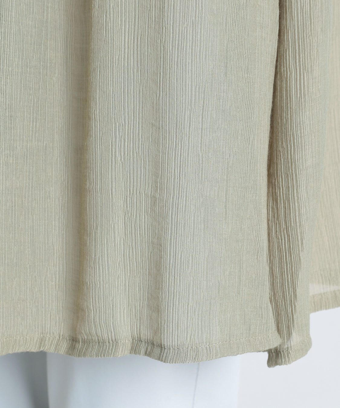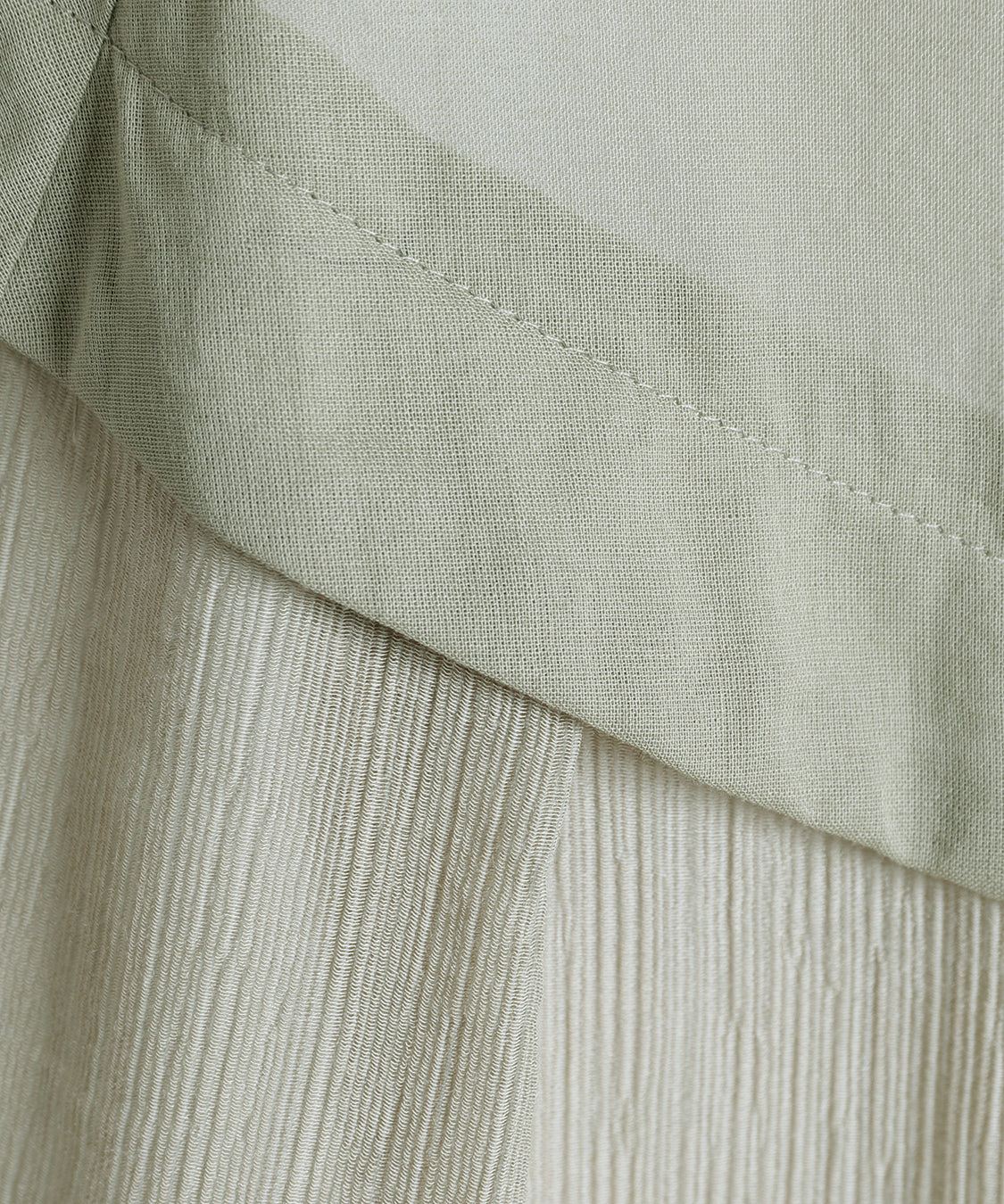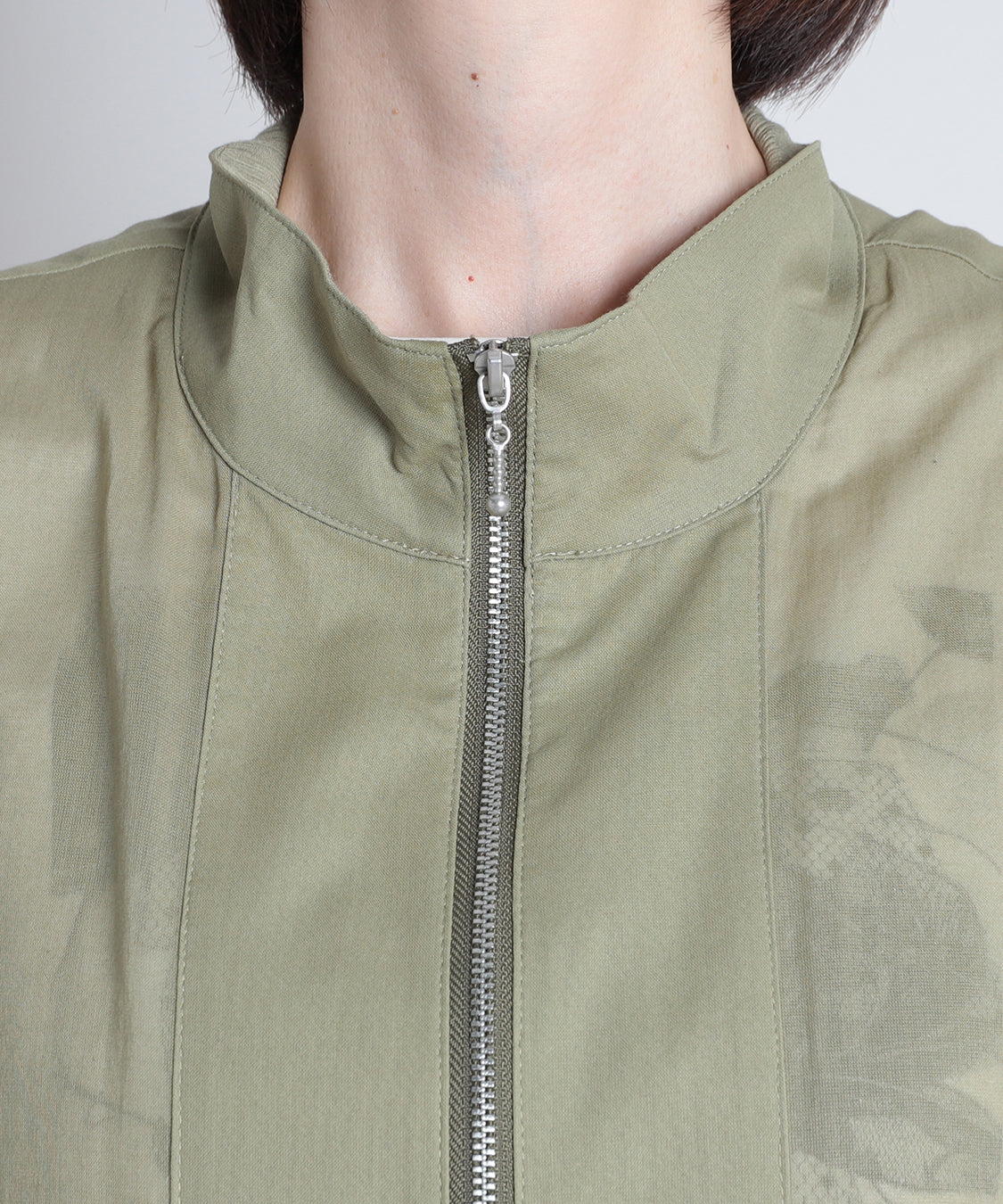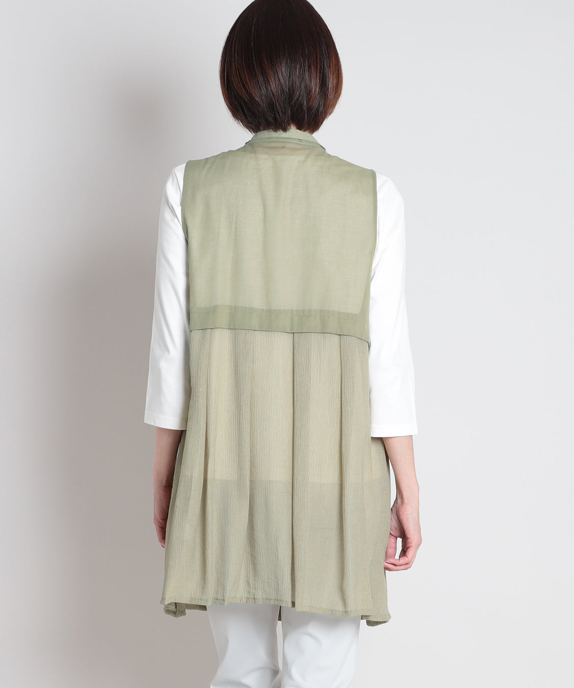 ジップアップのロング丈にショート丈ベストを重ねたような個性あるデザイン。レーヨンとナイロンを合わせた独特のシワ感と清涼感のある軽やかなシアー素材でライトに合わせられるお仕立てです。