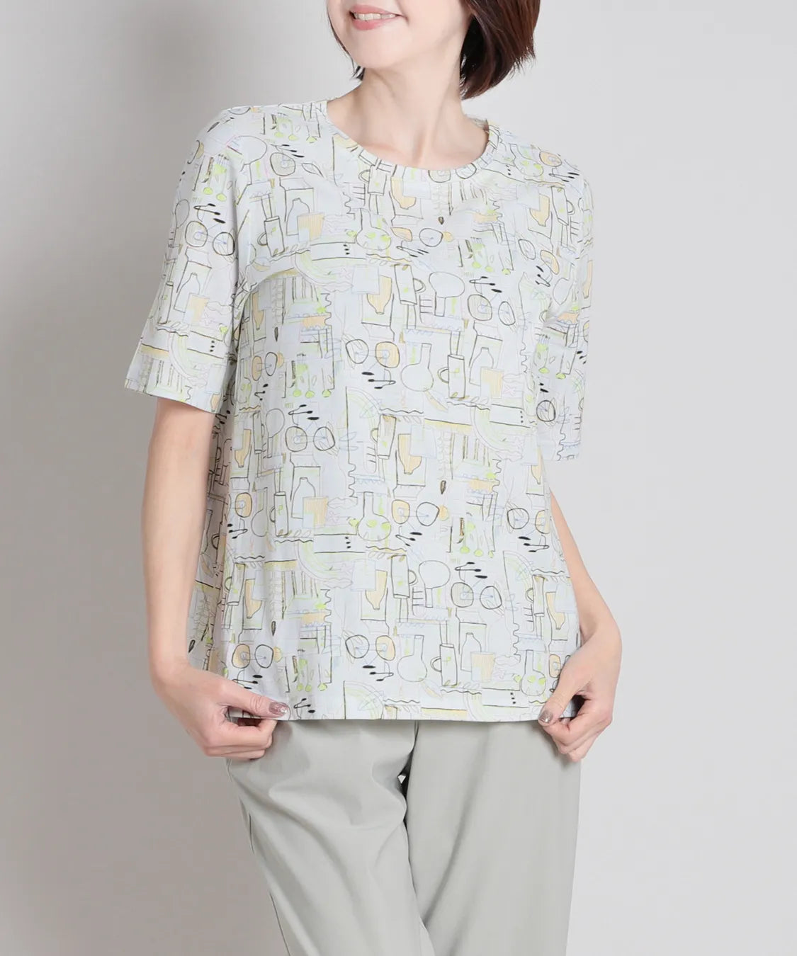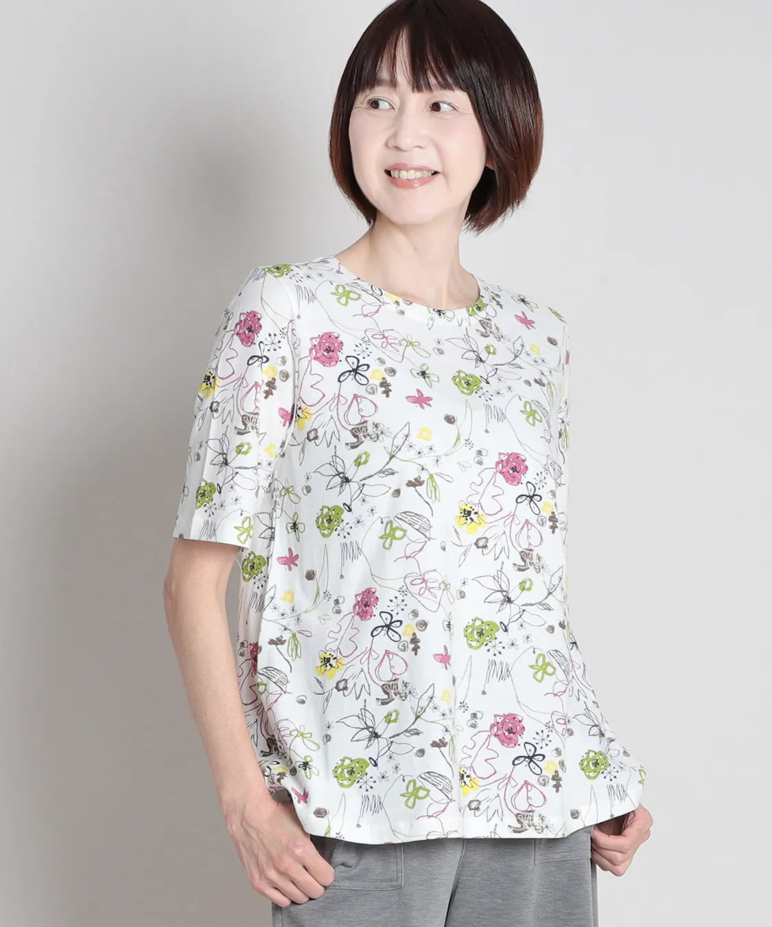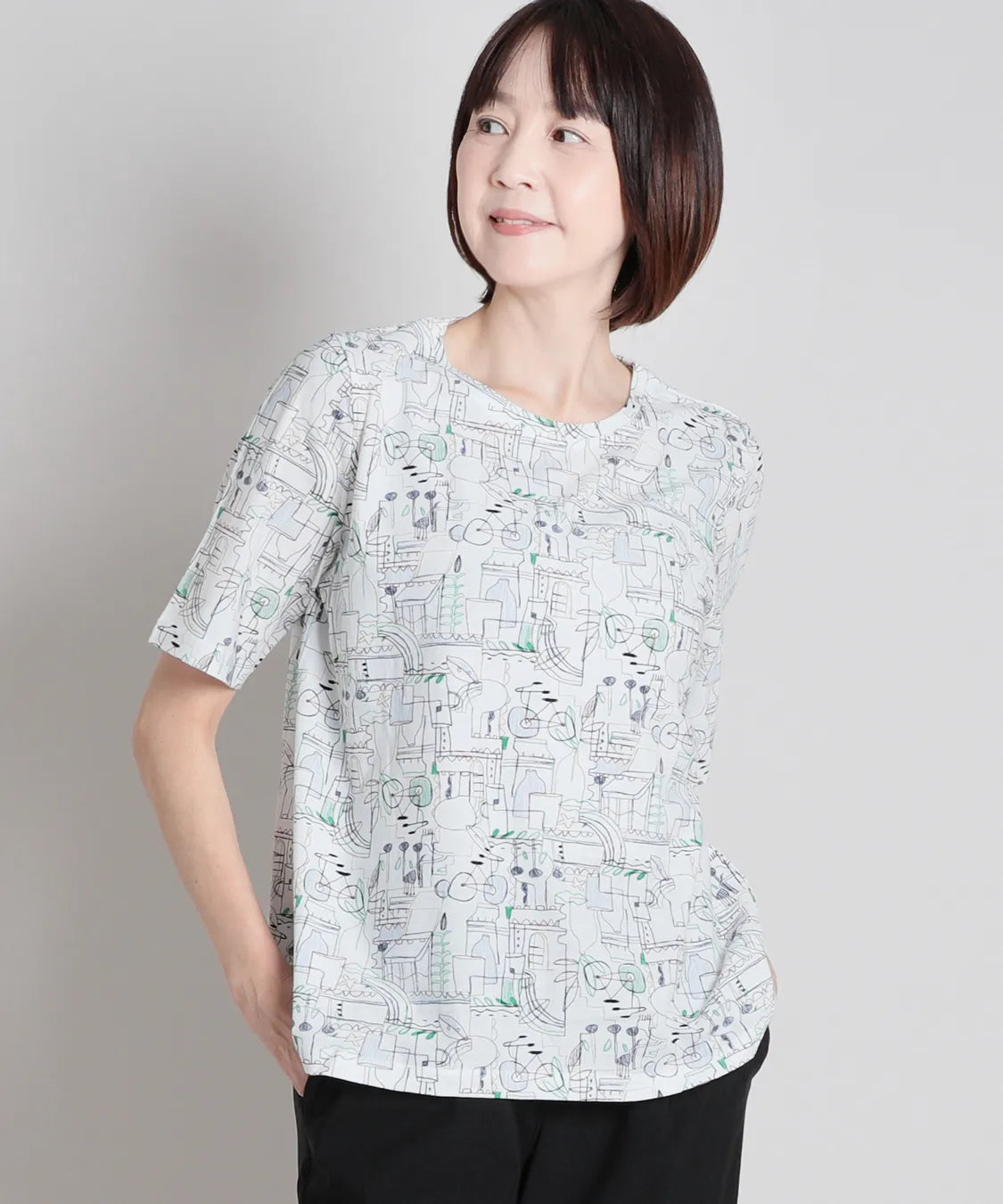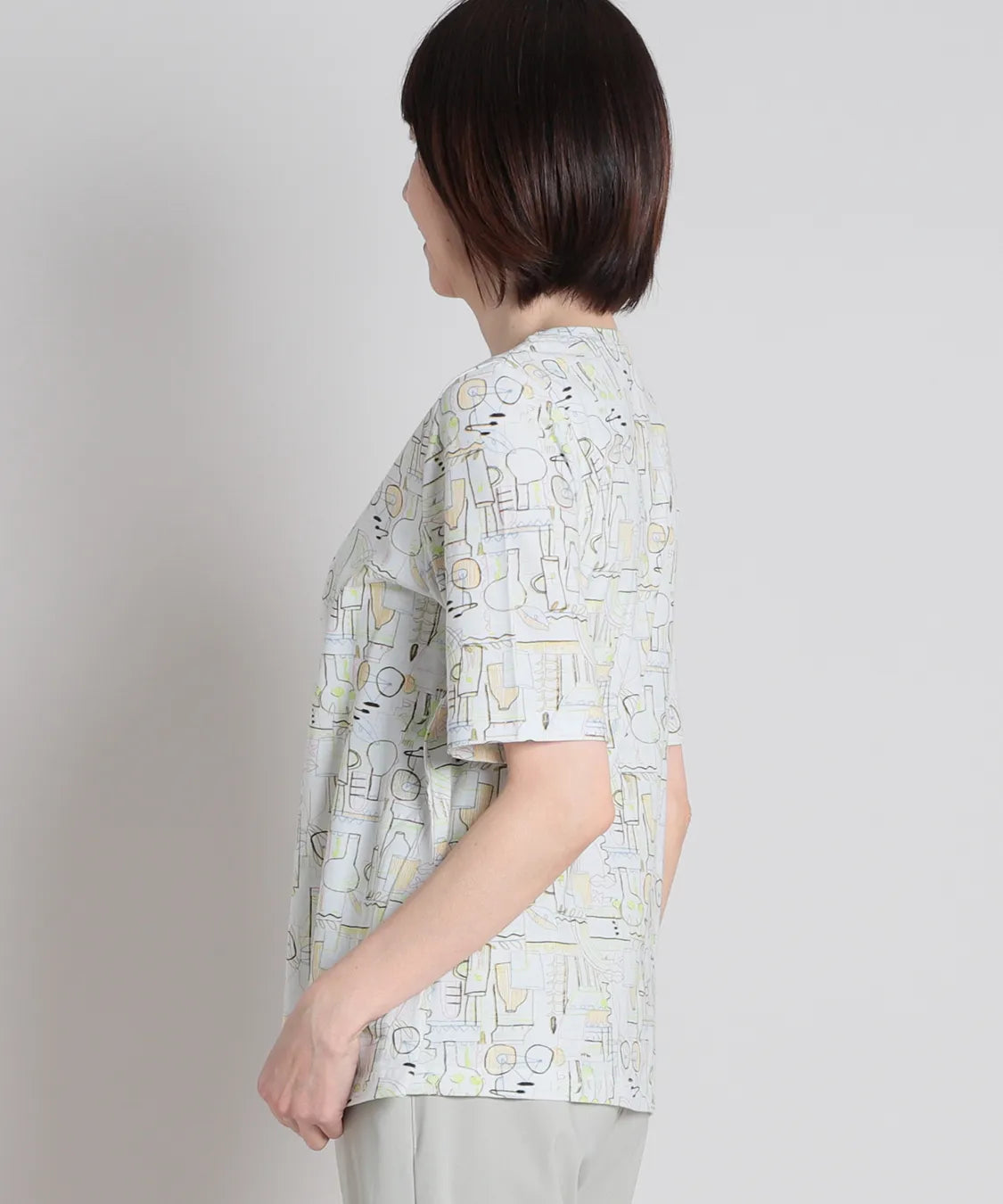 手描きタッチのアート柄や華やかなプリントが魅力のプリントカットソーシリーズ。さらりとした肌ざわりの素材を使用し、暑い季節でも心地よく着られる軽やかな仕上がりです。