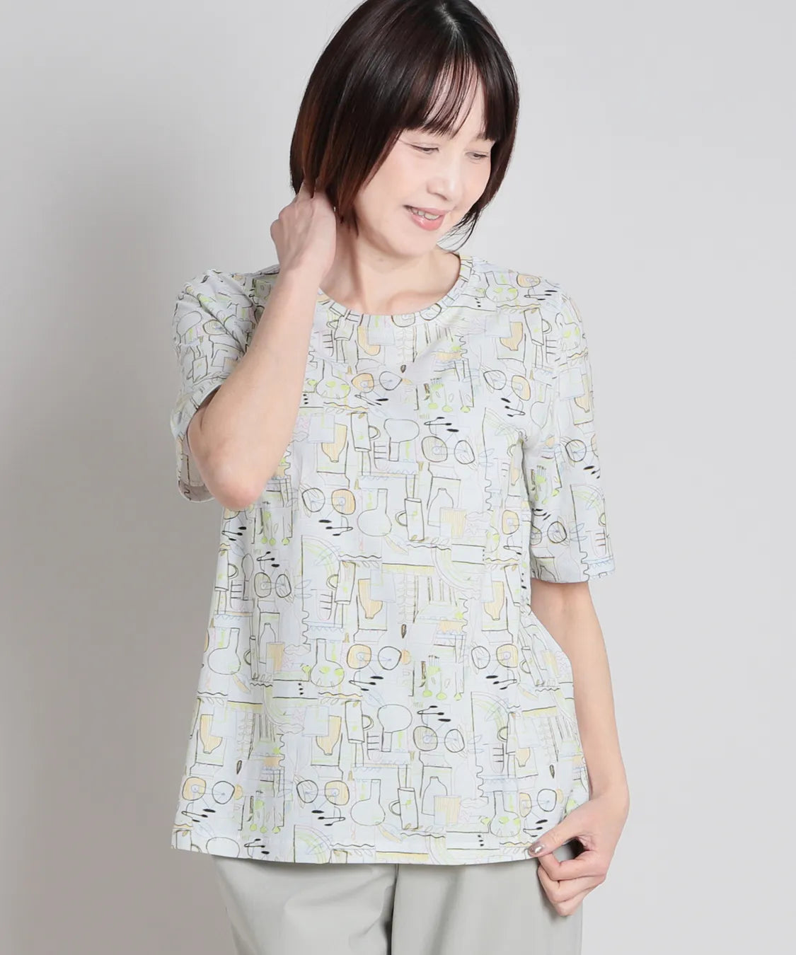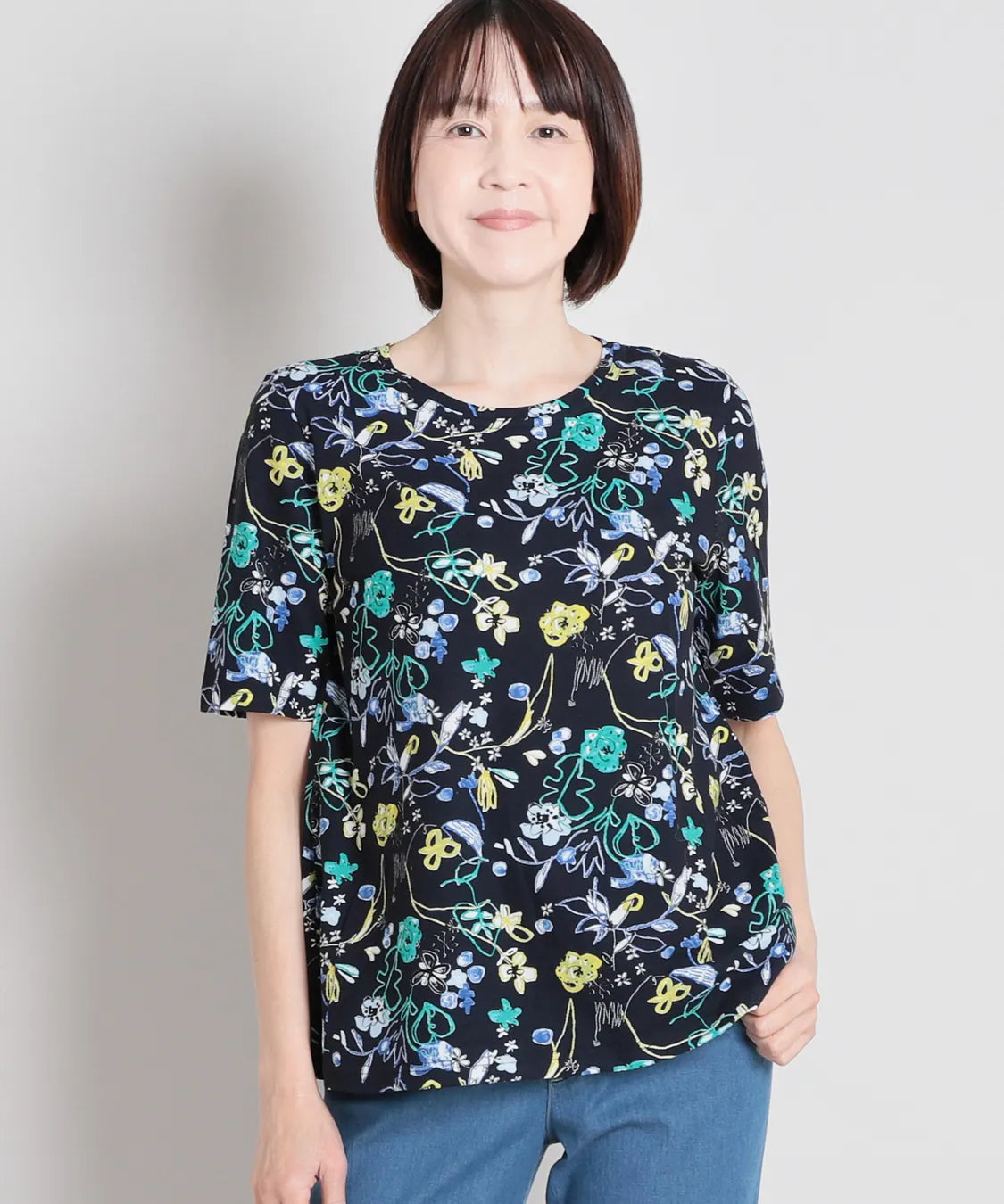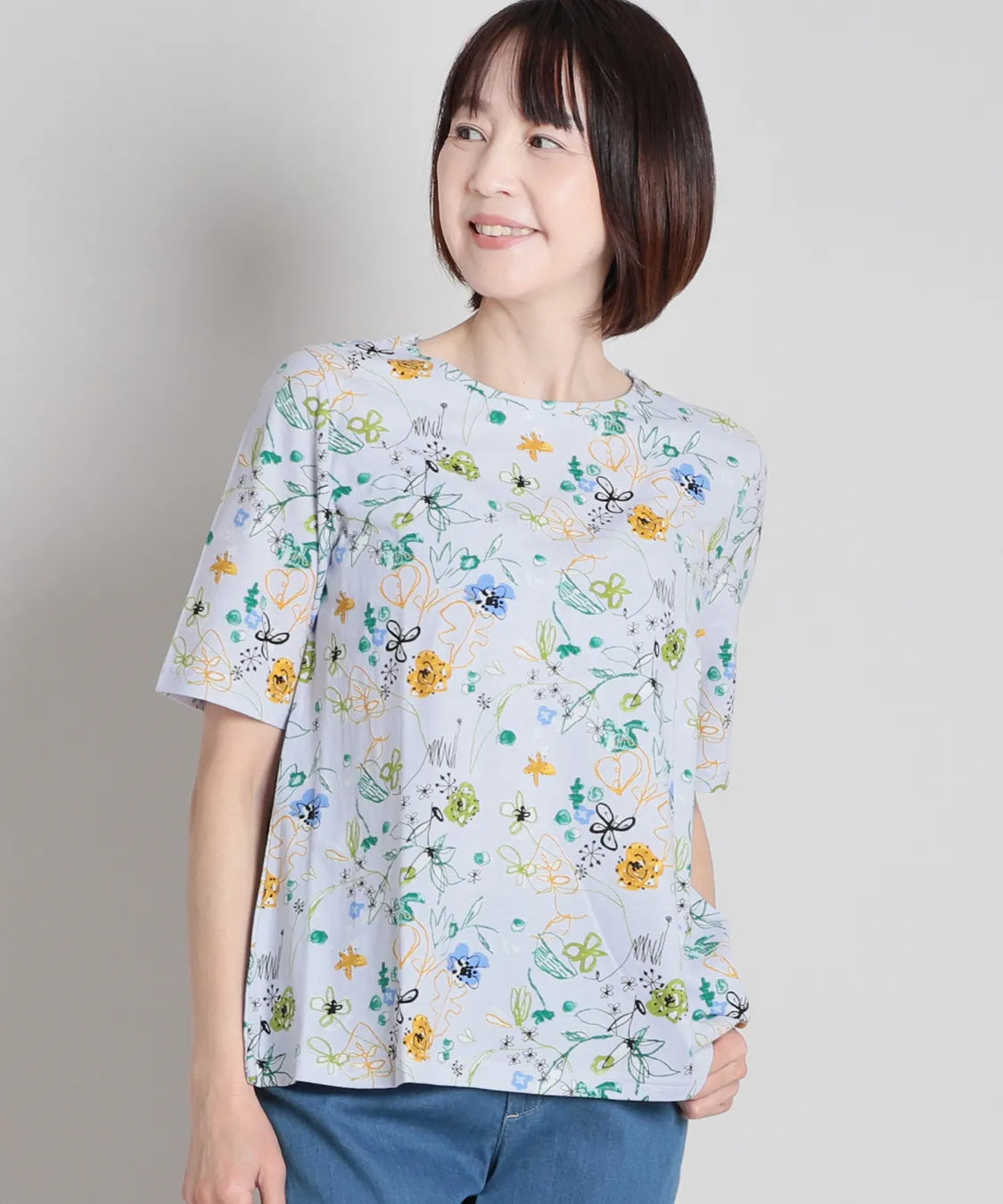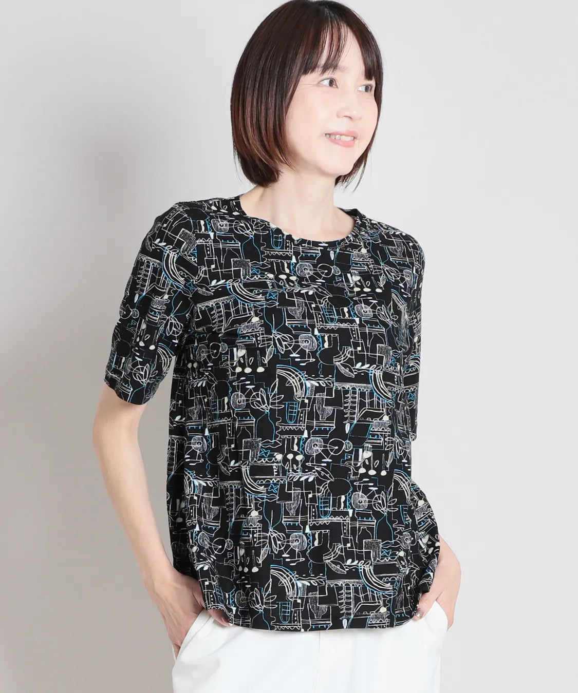 手描きタッチのアート柄や華やかなプリントが魅力のプリントカットソーシリーズ。さらりとした肌ざわりの素材を使用し、暑い季節でも心地よく着られる軽やかな仕上がりです。
