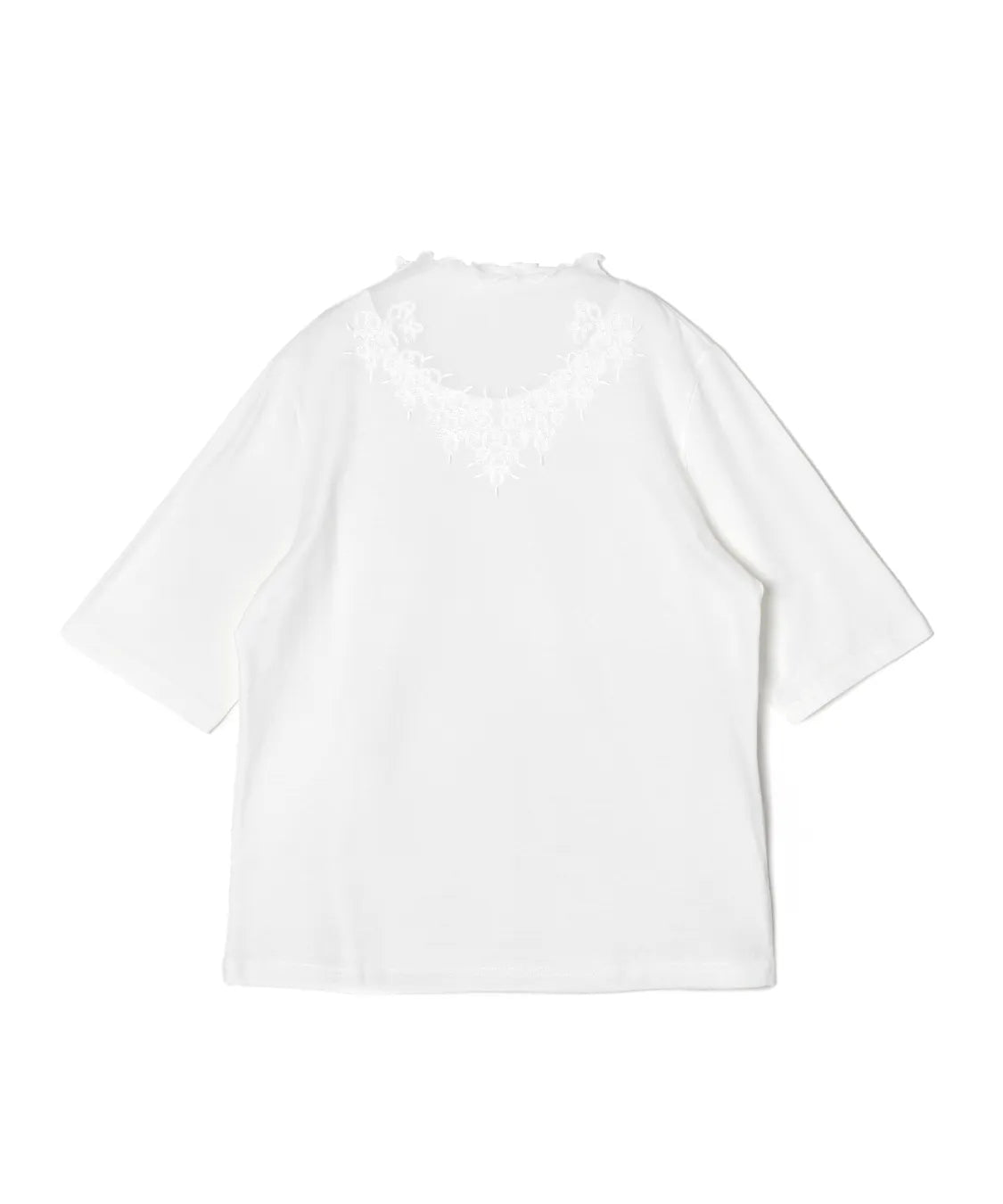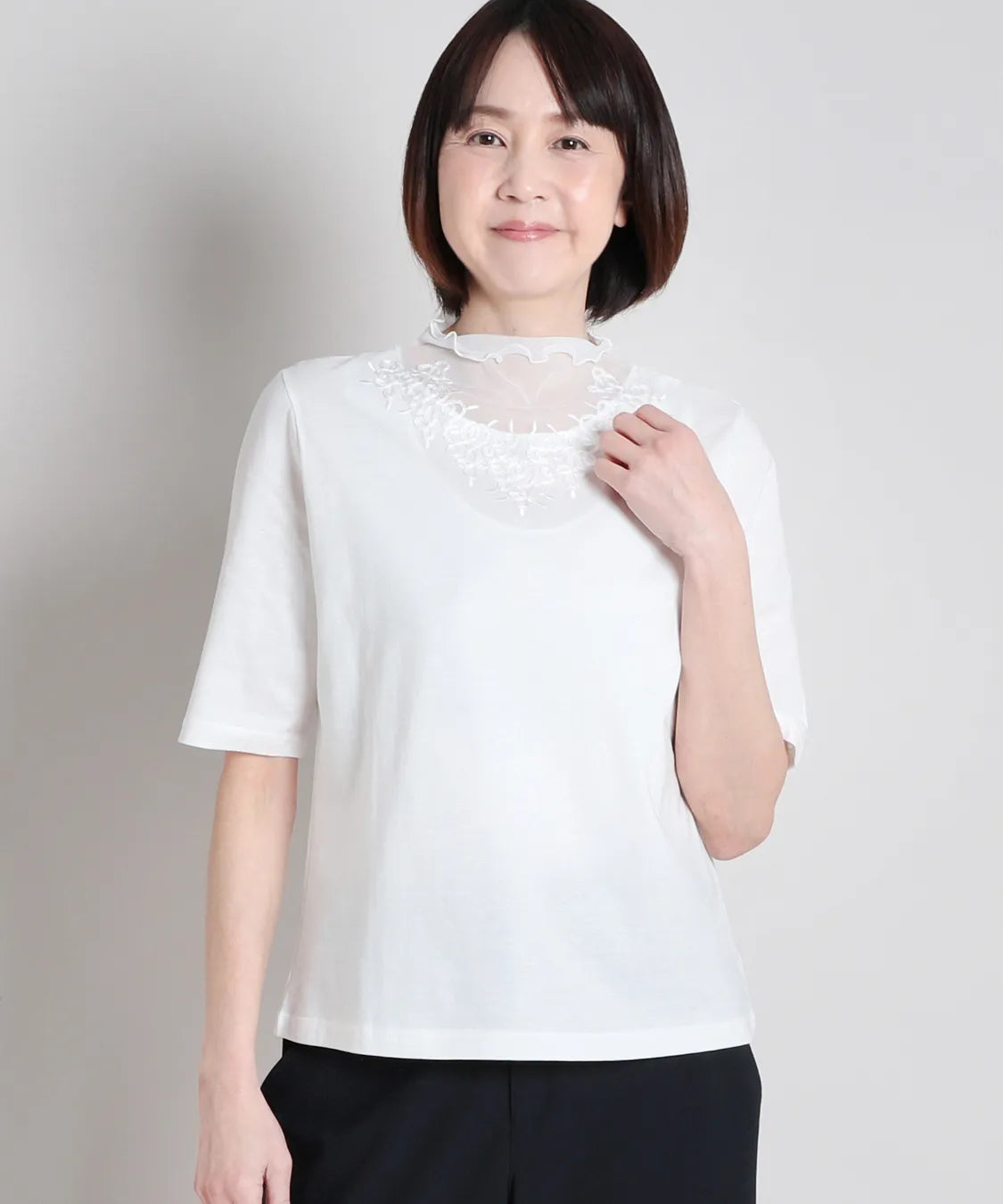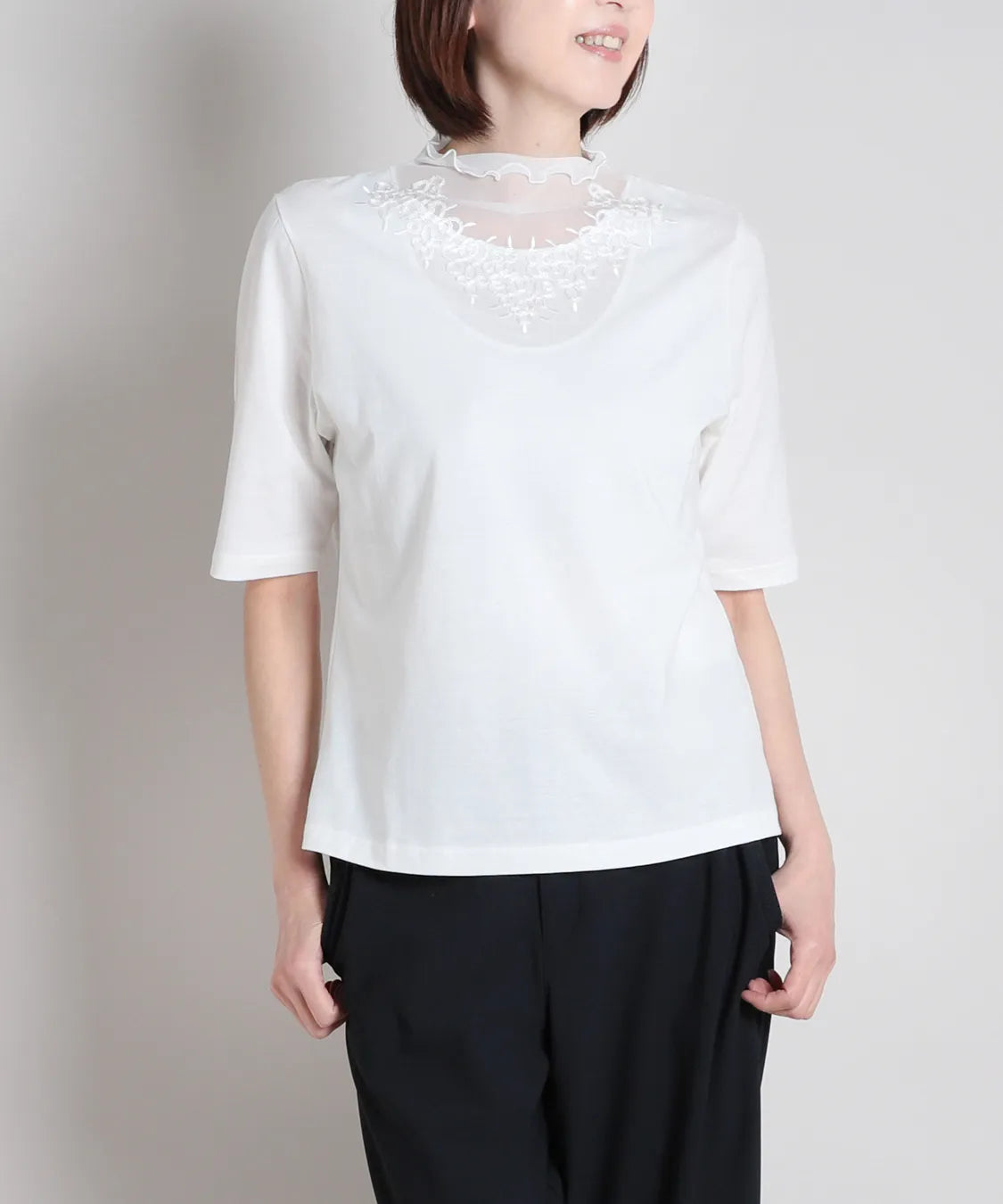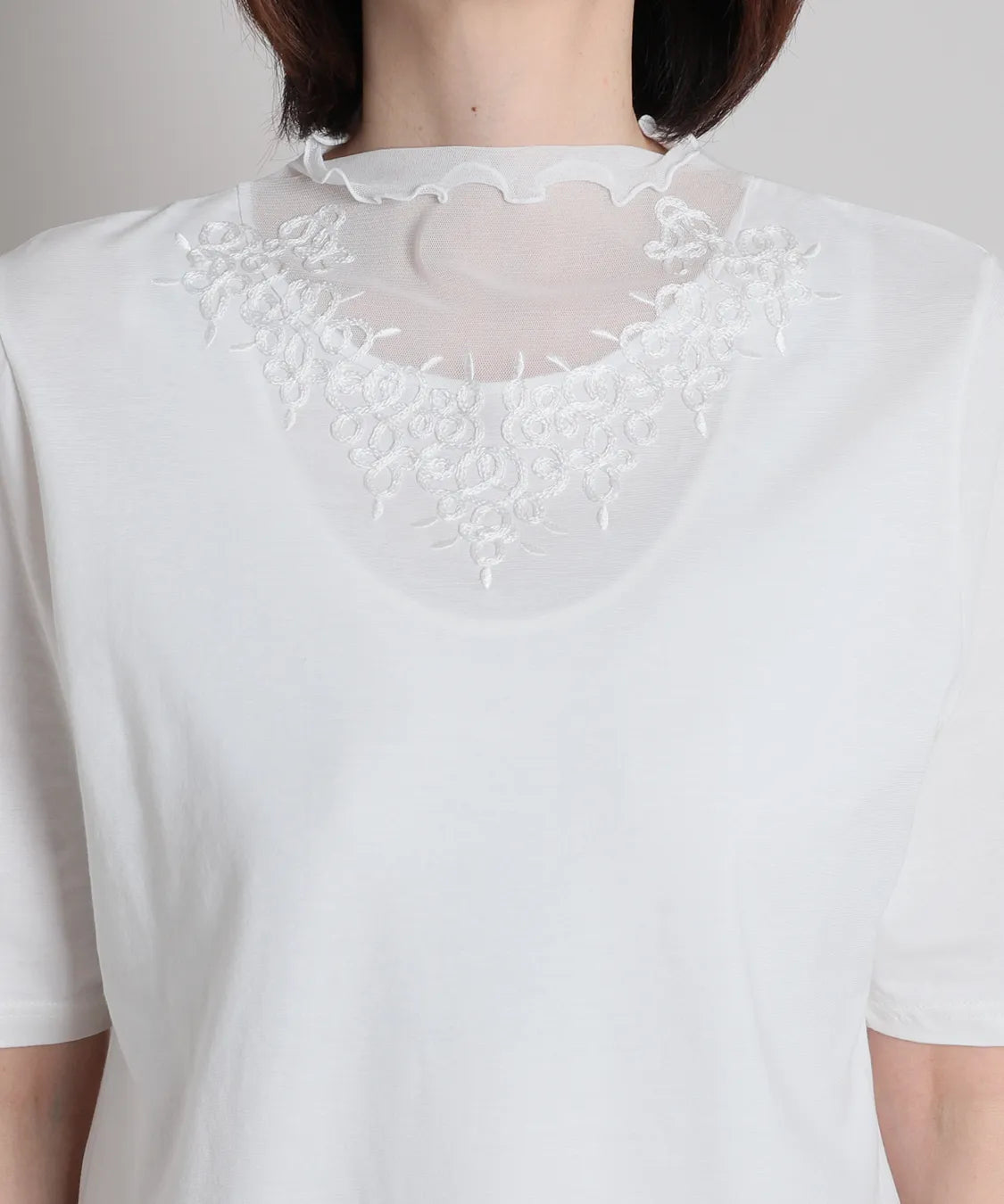 デコルテをふんわり包むシアー素材に、繊細な刺繍レースをあしらった上品なハーフスリーブTシャツ。