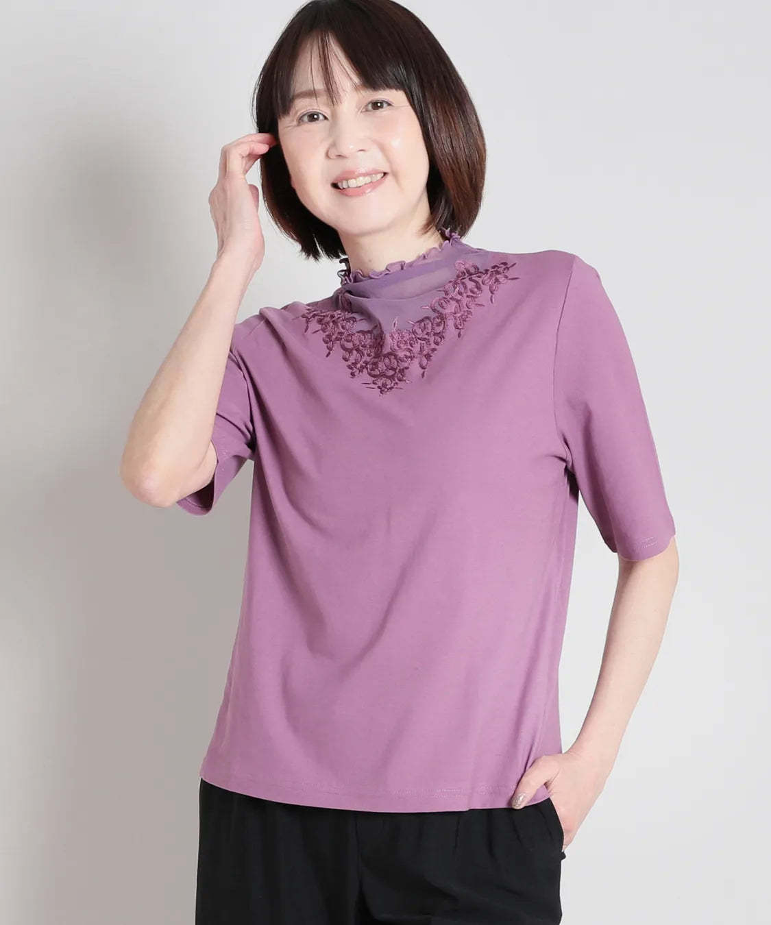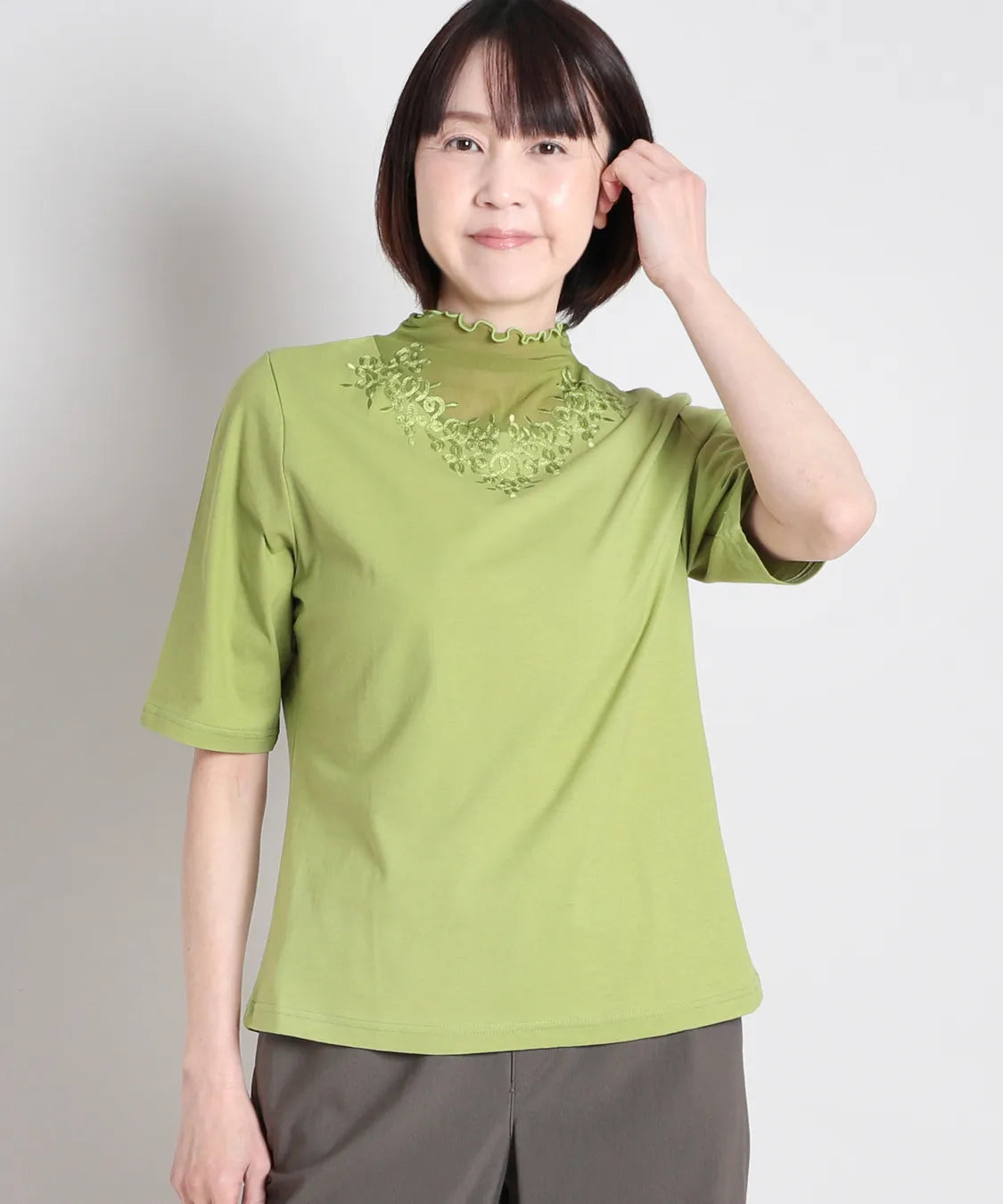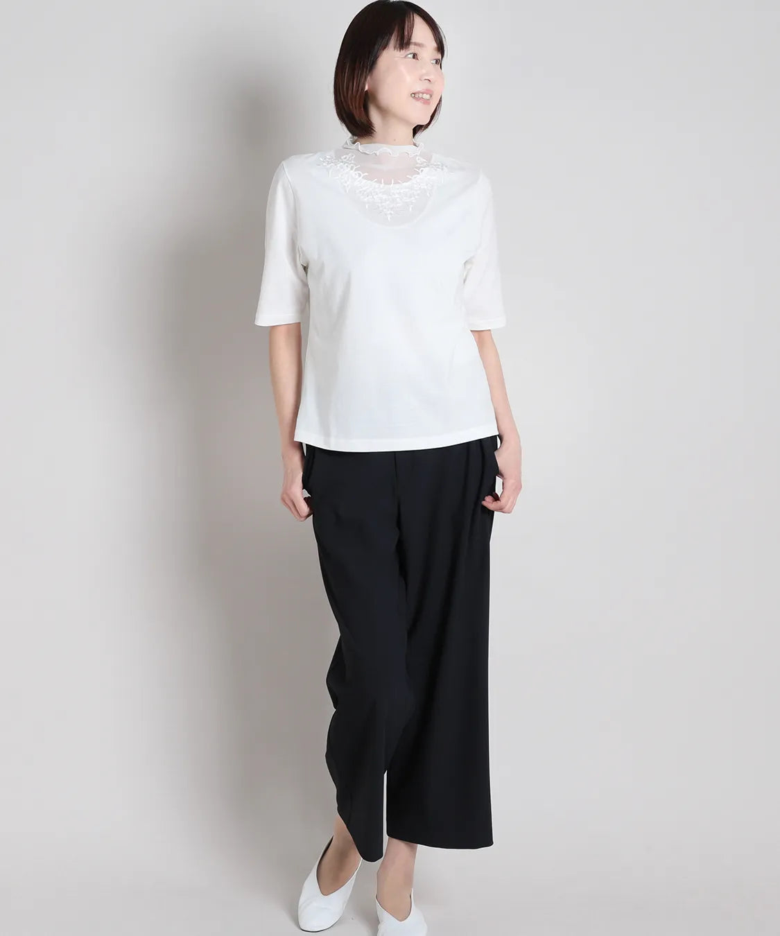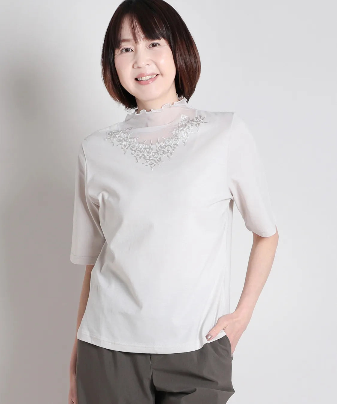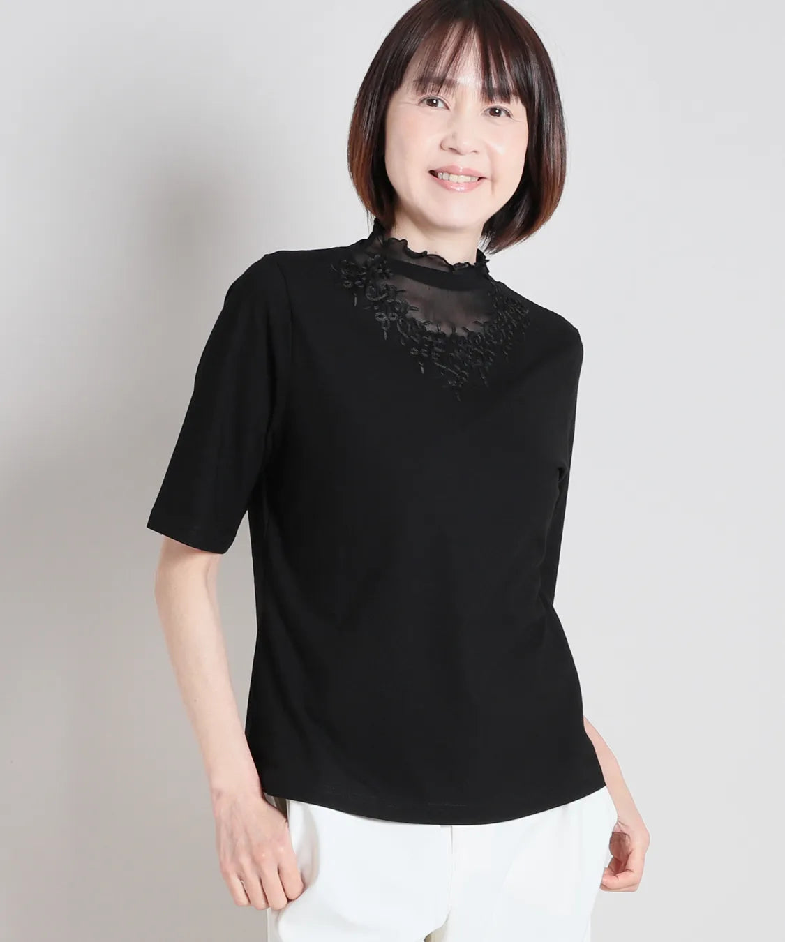 デコルテをふんわり包むシアー素材に、繊細な刺繍レースをあしらった上品なハーフスリーブTシャツ。