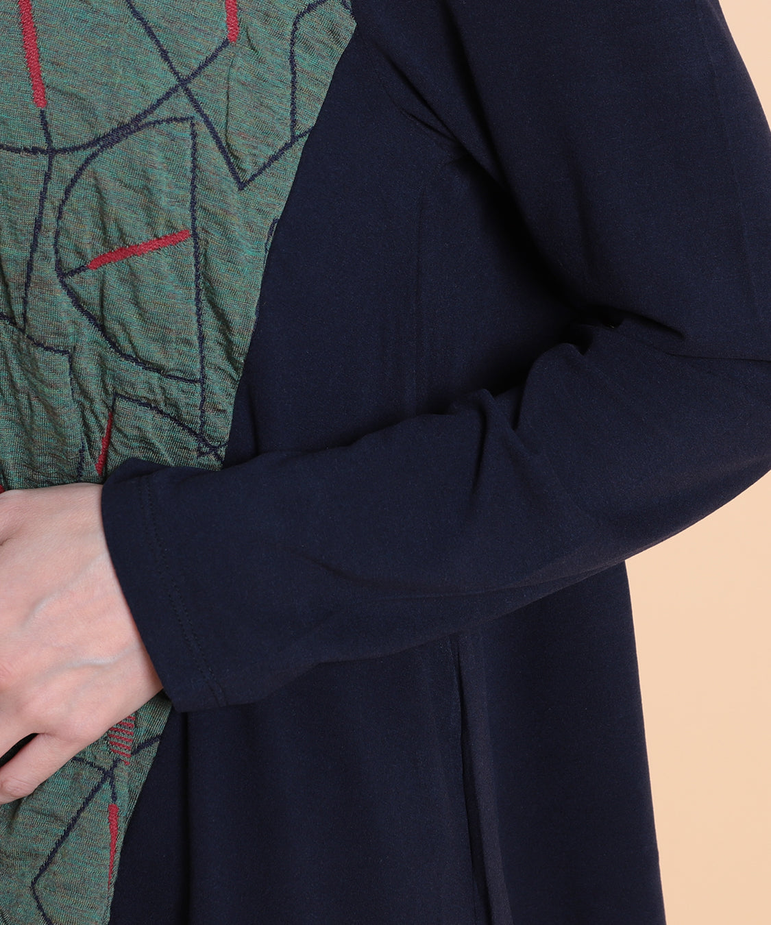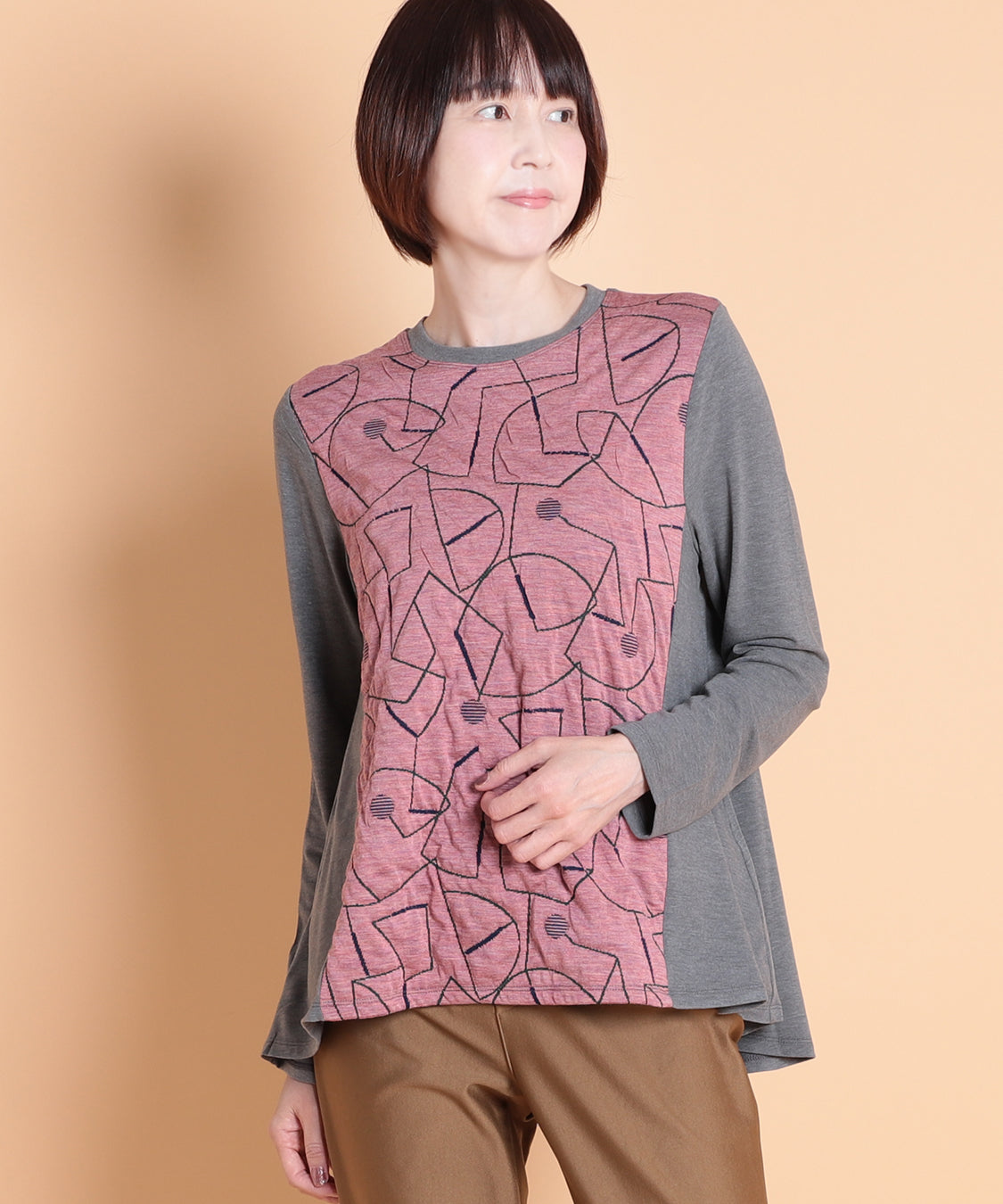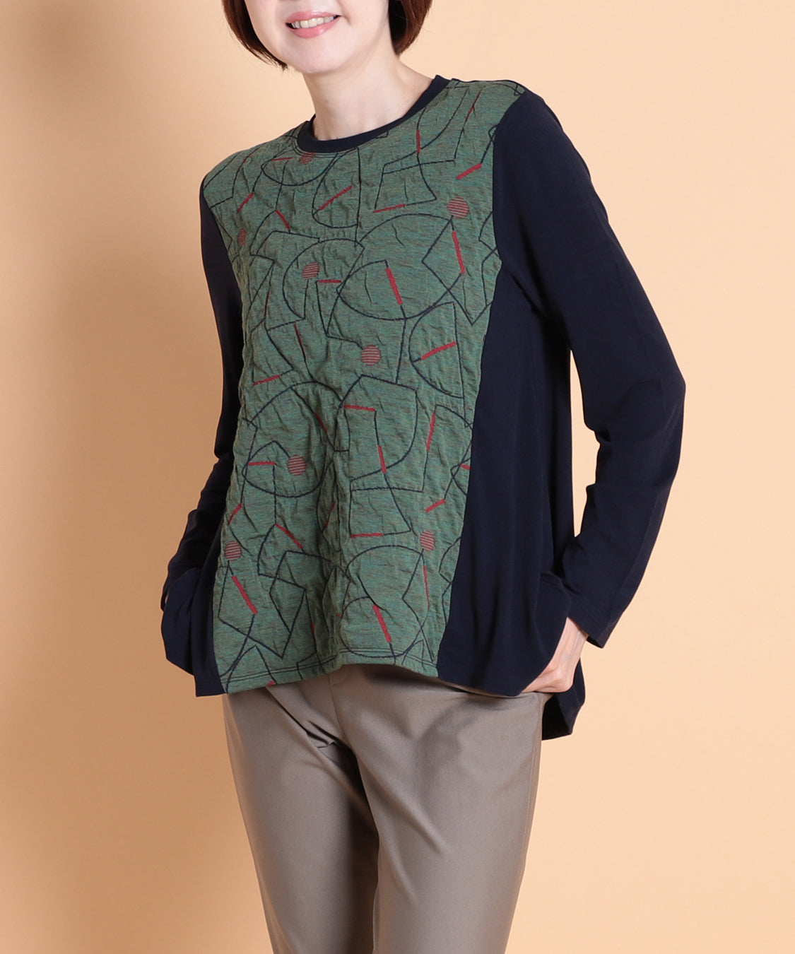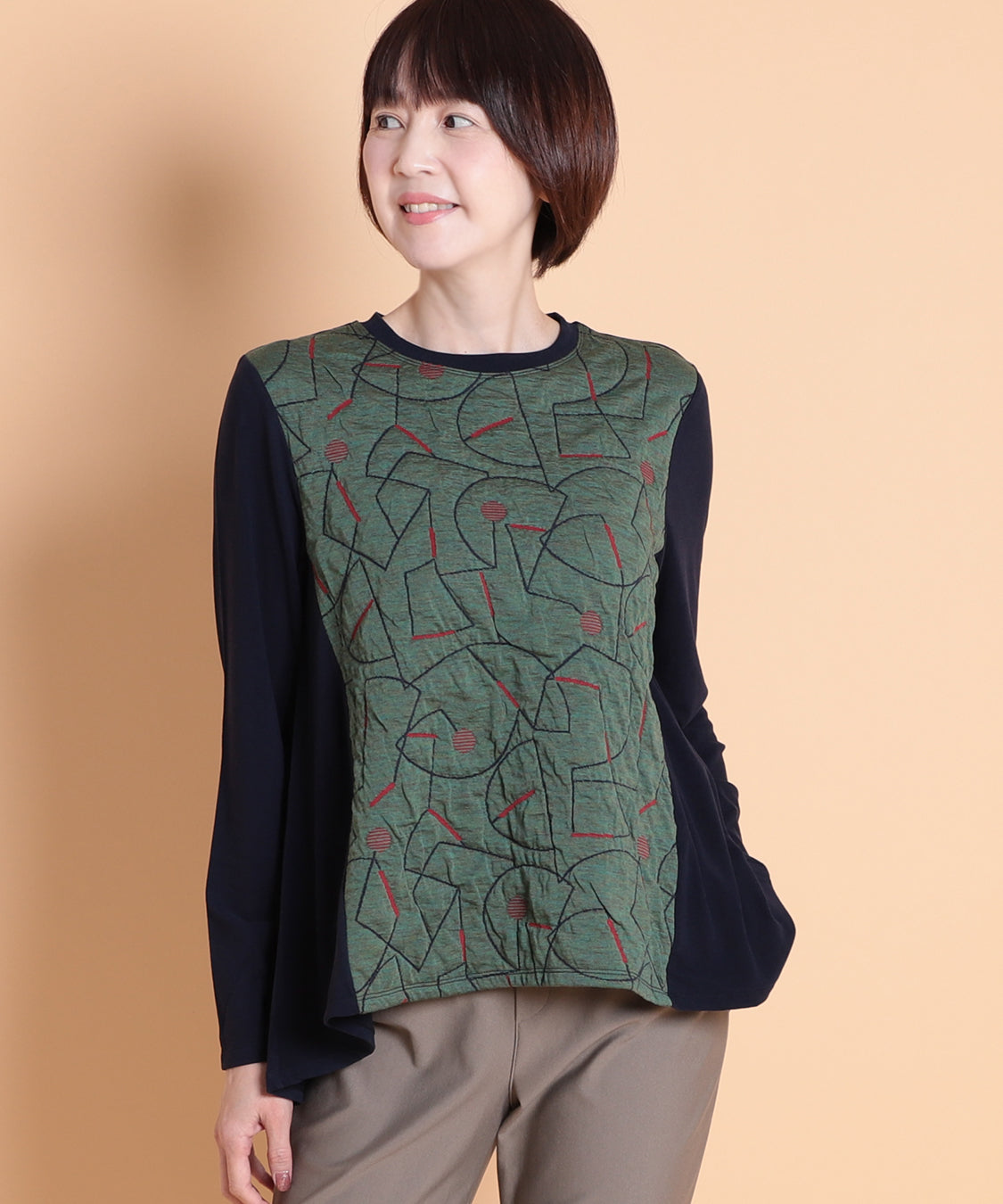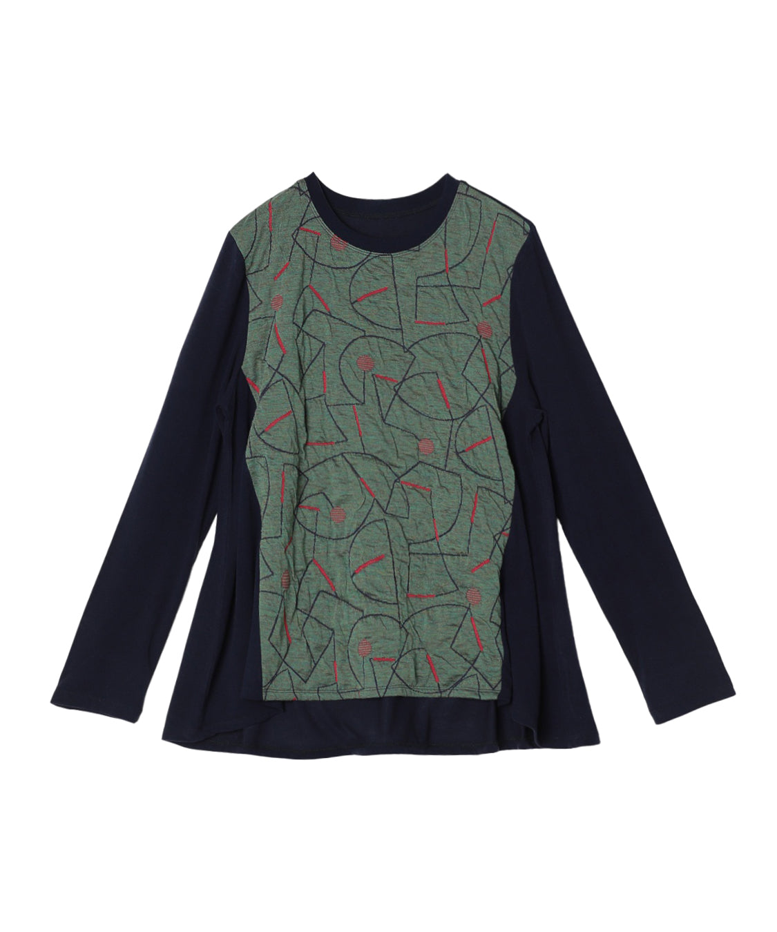 前身頃は目を惹く幾何学柄で、袖と後ろ身頃は無地で切り替えたプルオーバー。Tシャツのようにさらっと着ることができるアイテムです。動きやすい伸縮性も魅力的です。