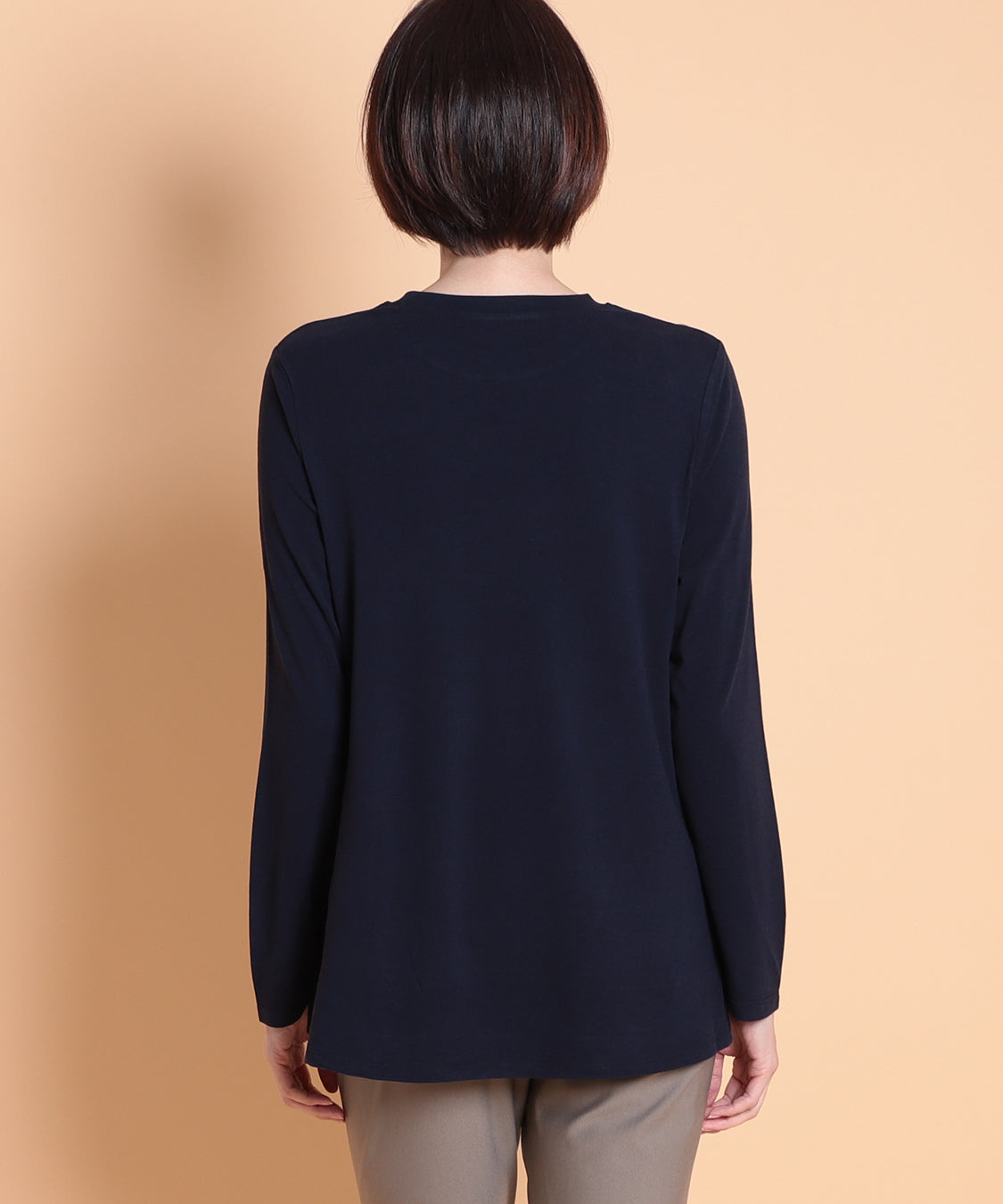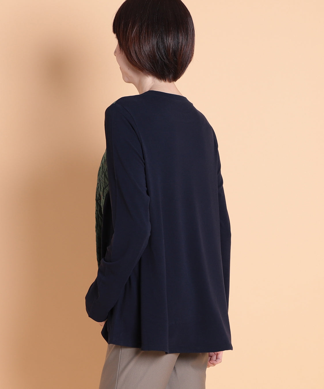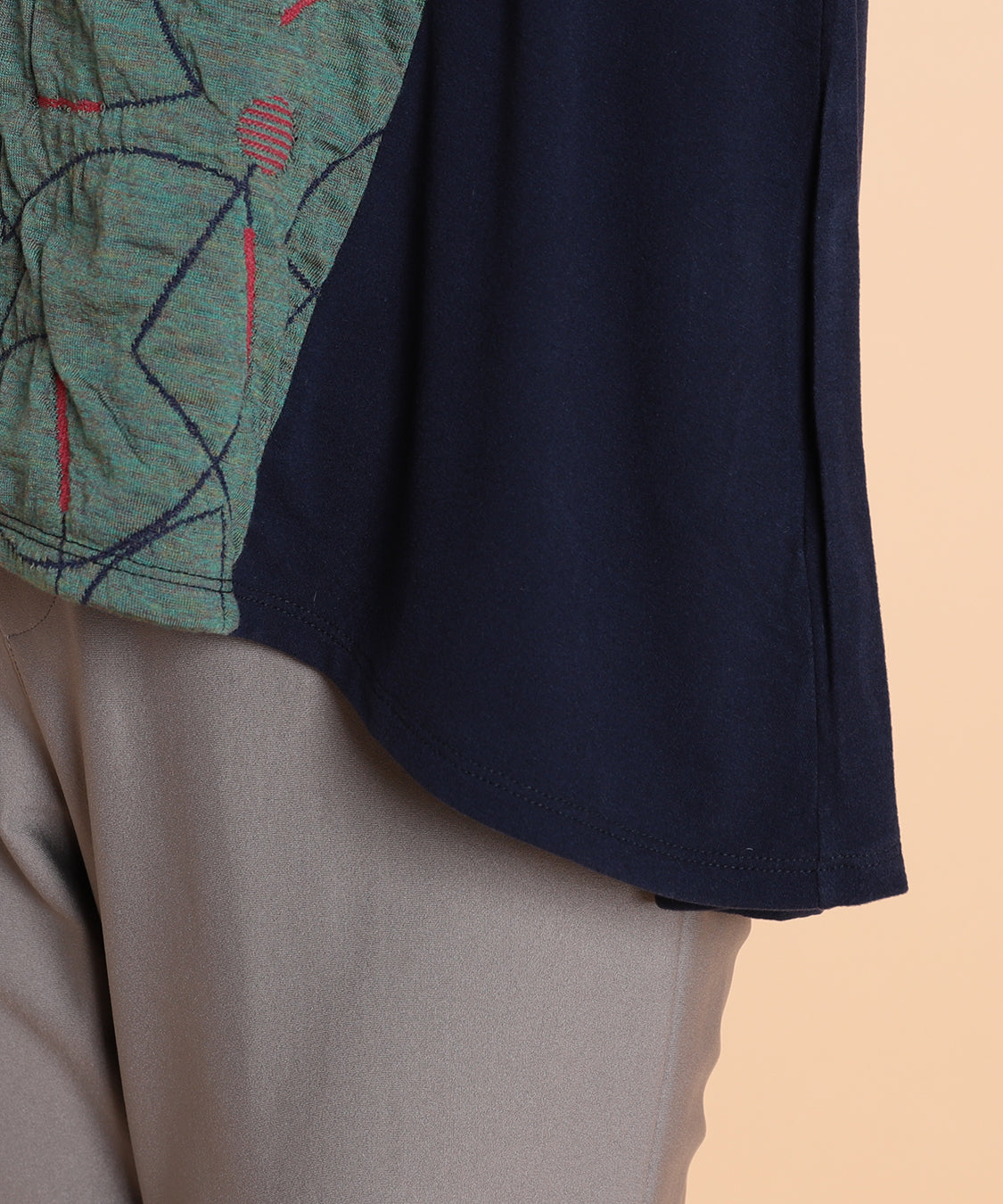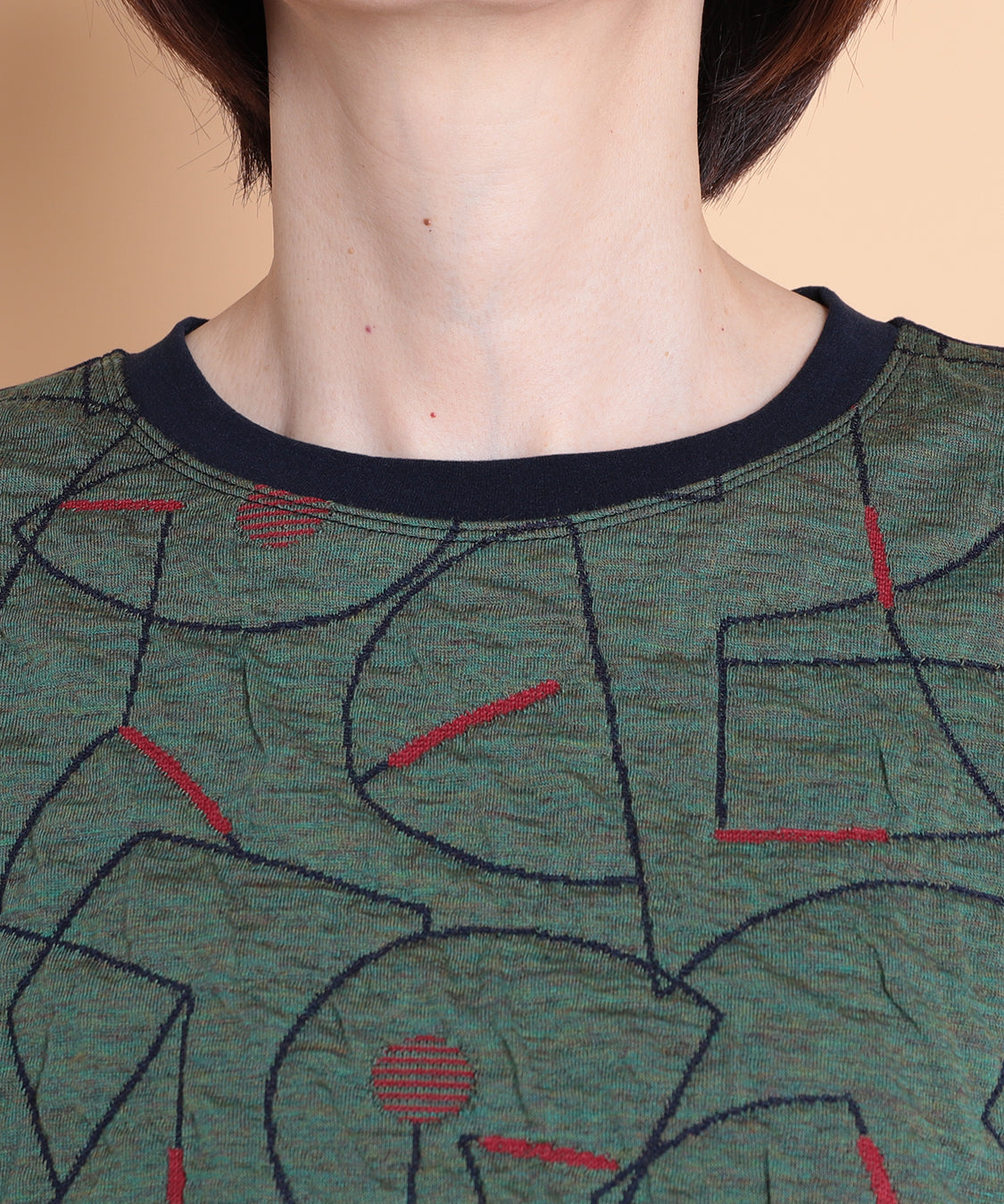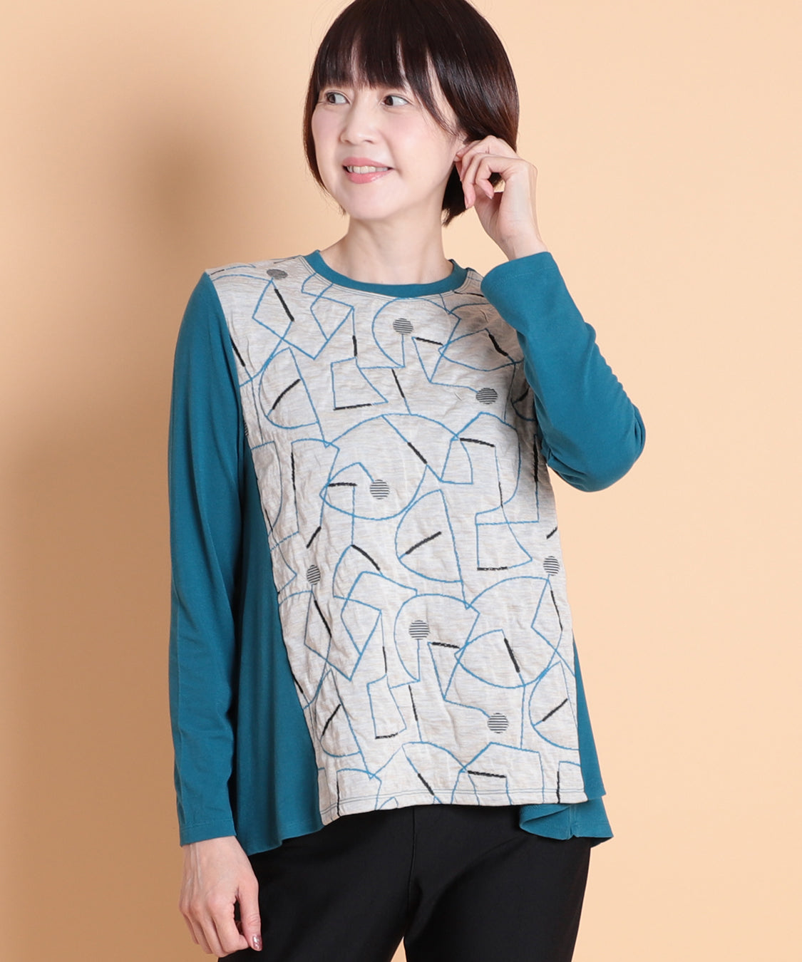前身頃は目を惹く幾何学柄で、袖と後ろ身頃は無地で切り替えたプルオーバー。Tシャツのようにさらっと着ることができるアイテムです。動きやすい伸縮性も魅力的です。