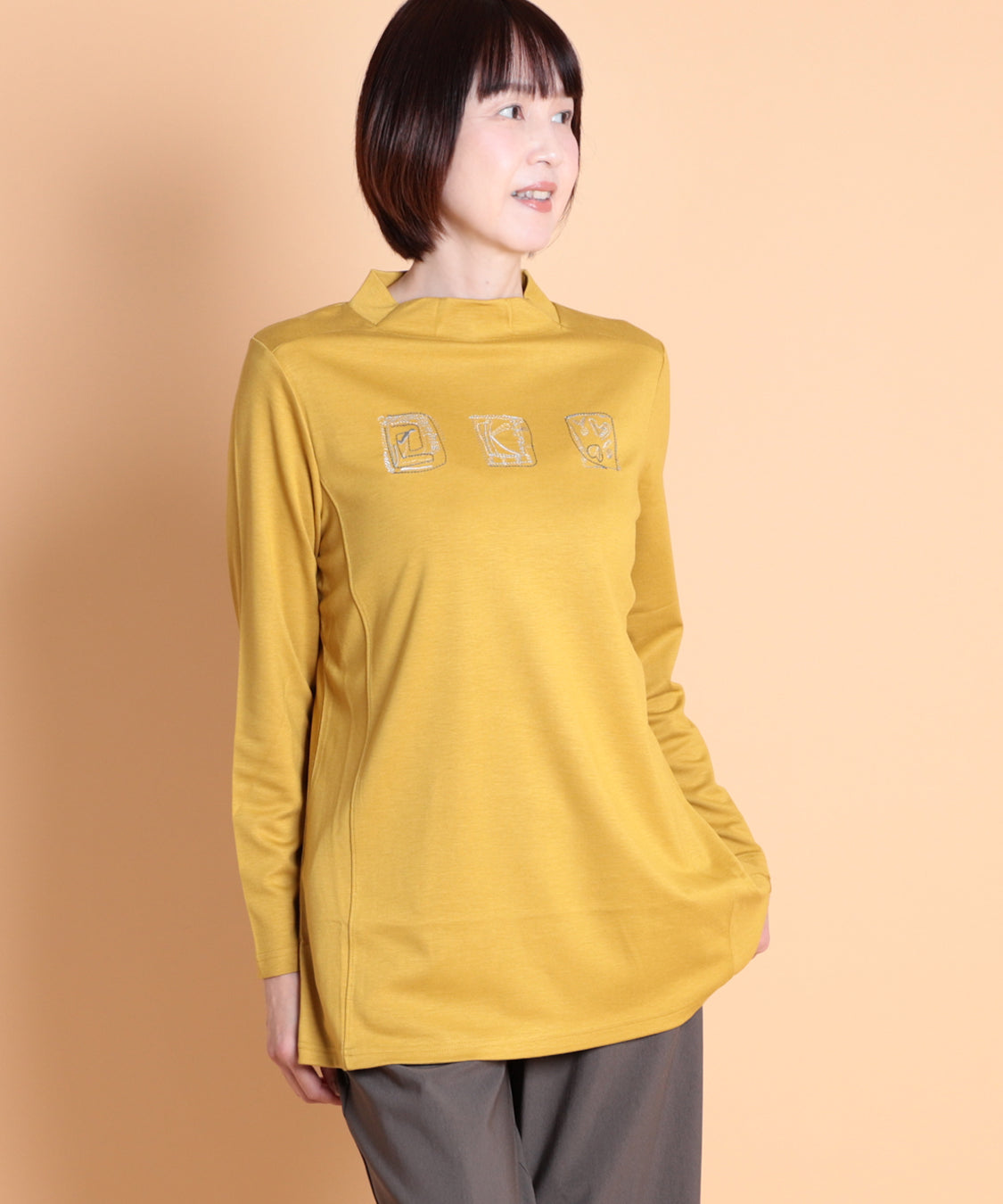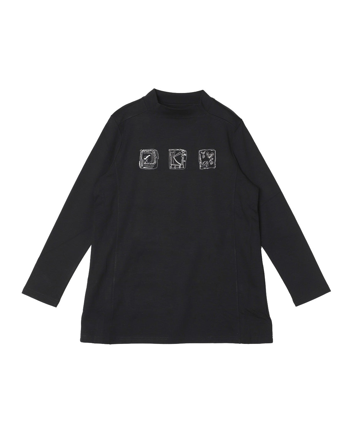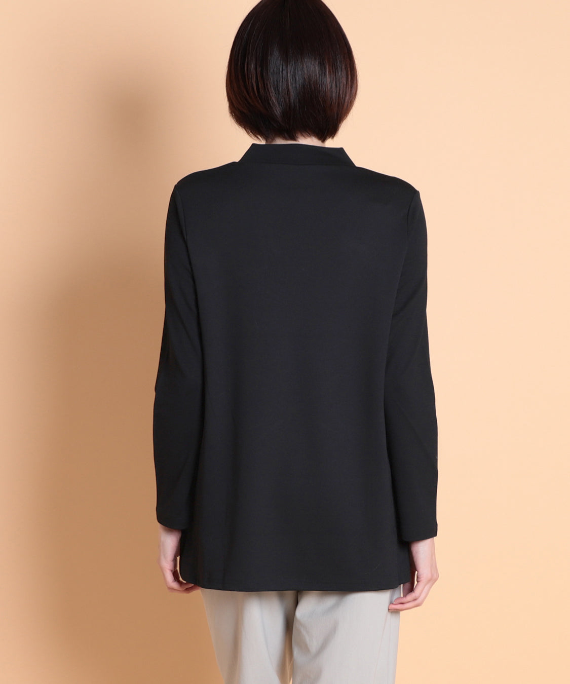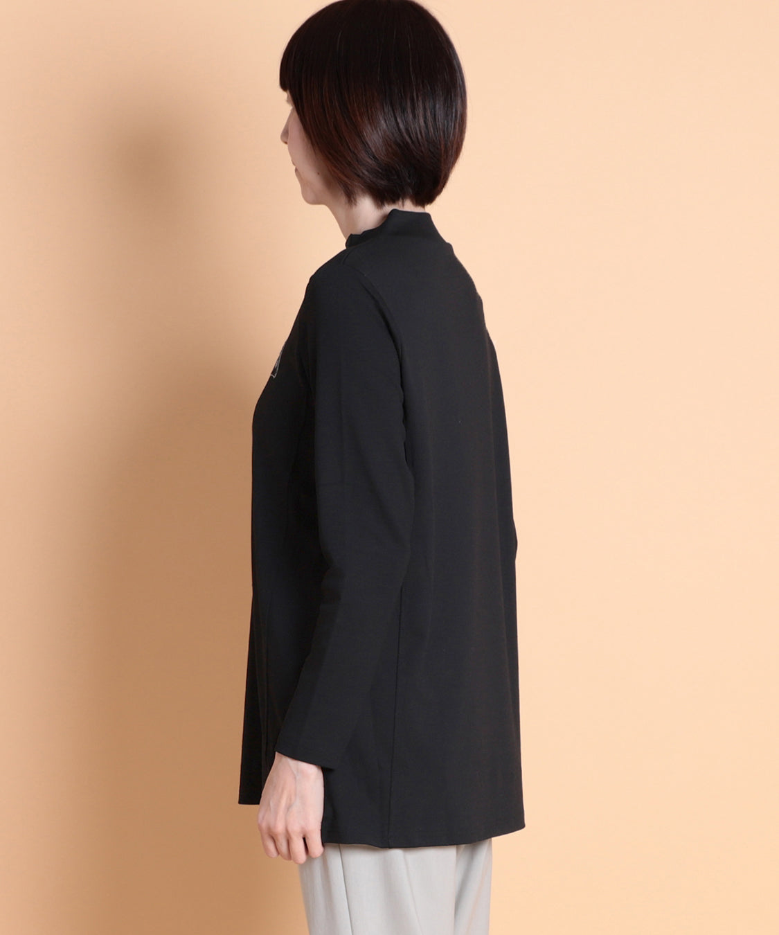 遊び心のあるデザインと快適な着心地が魅力の一枚です。ジャケットやカーディガンのインナーに便利なハイネックプルオーバーですが、一枚着でも着やすいように少し身巾にゆとりを出し、着丈も長くしました。適度に薄くほどよい肉感は、軽い着心地で、定評高いポンチ素材です。