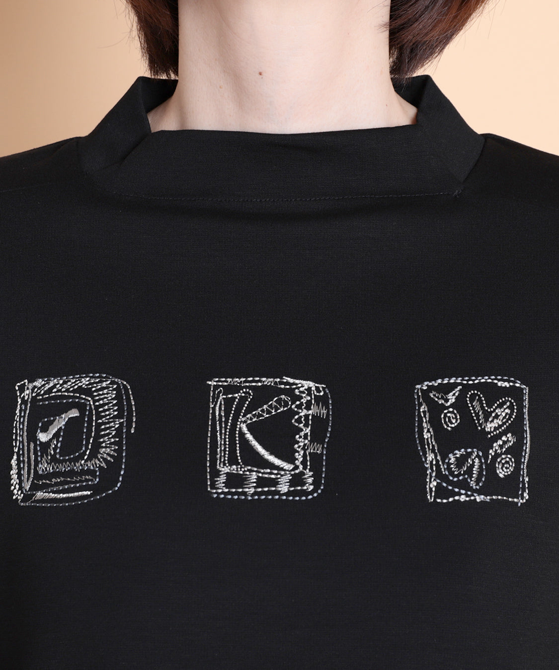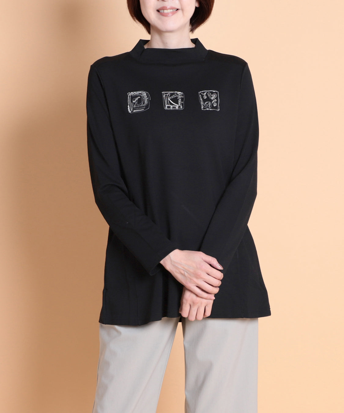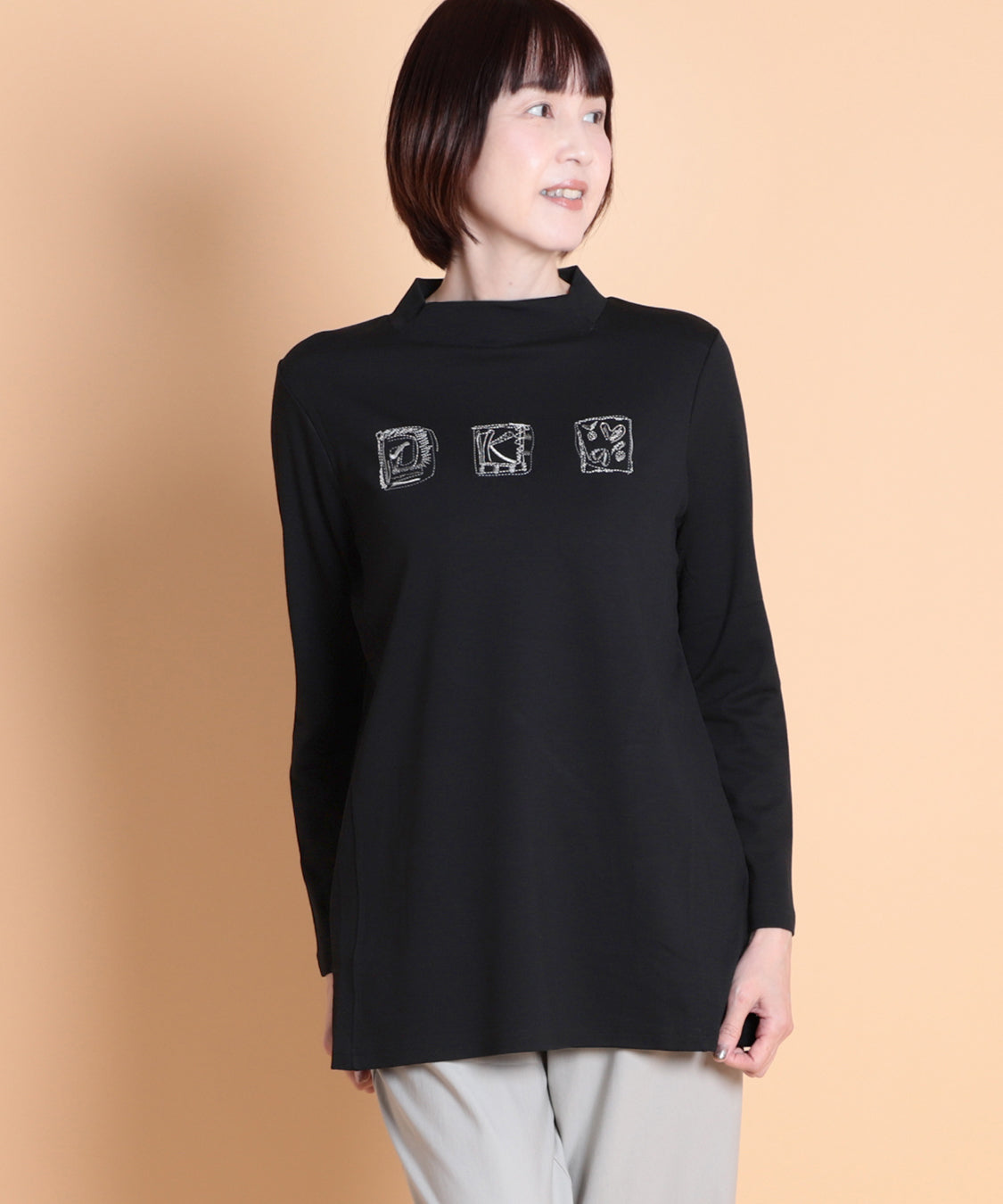 遊び心のあるデザインと快適な着心地が魅力の一枚です。ジャケットやカーディガンのインナーに便利なハイネックプルオーバーですが、一枚着でも着やすいように少し身巾にゆとりを出し、着丈も長くしました。適度に薄くほどよい肉感は、軽い着心地で、定評高いポンチ素材です。