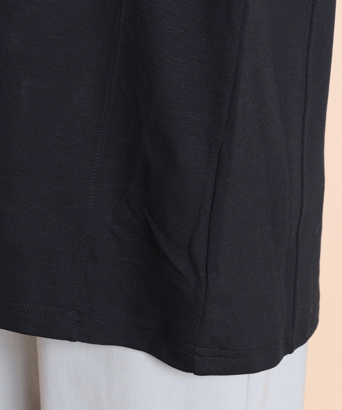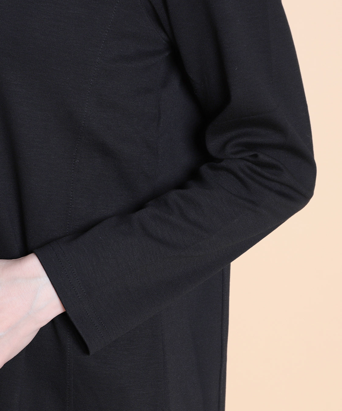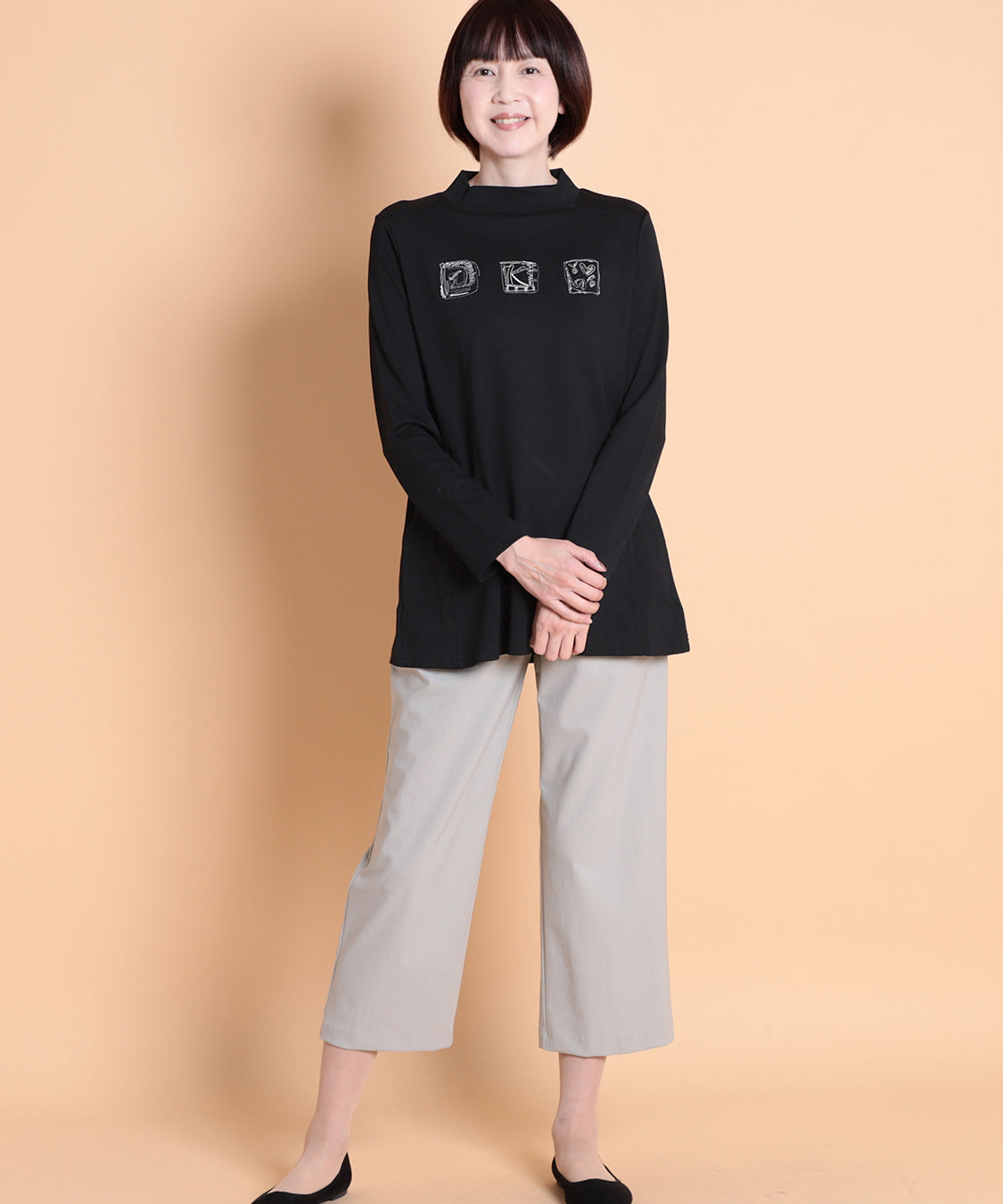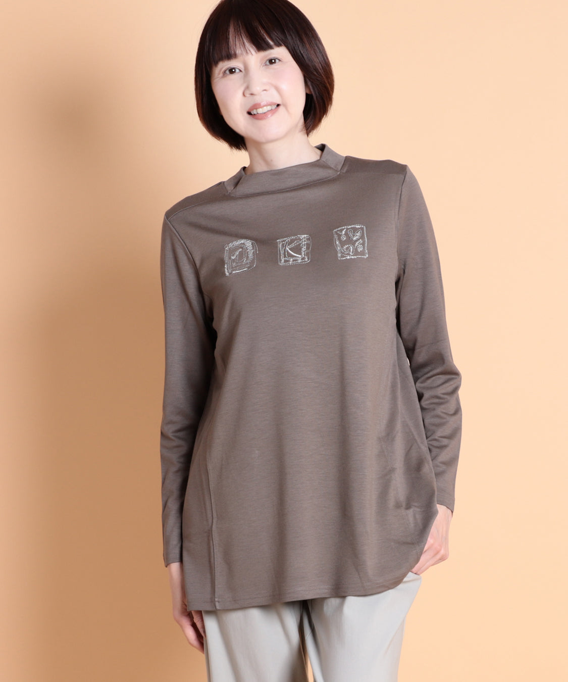 遊び心のあるデザインと快適な着心地が魅力の一枚です。ジャケットやカーディガンのインナーに便利なハイネックプルオーバーですが、一枚着でも着やすいように少し身巾にゆとりを出し、着丈も長くしました。適度に薄くほどよい肉感は、軽い着心地で、定評高いポンチ素材です。