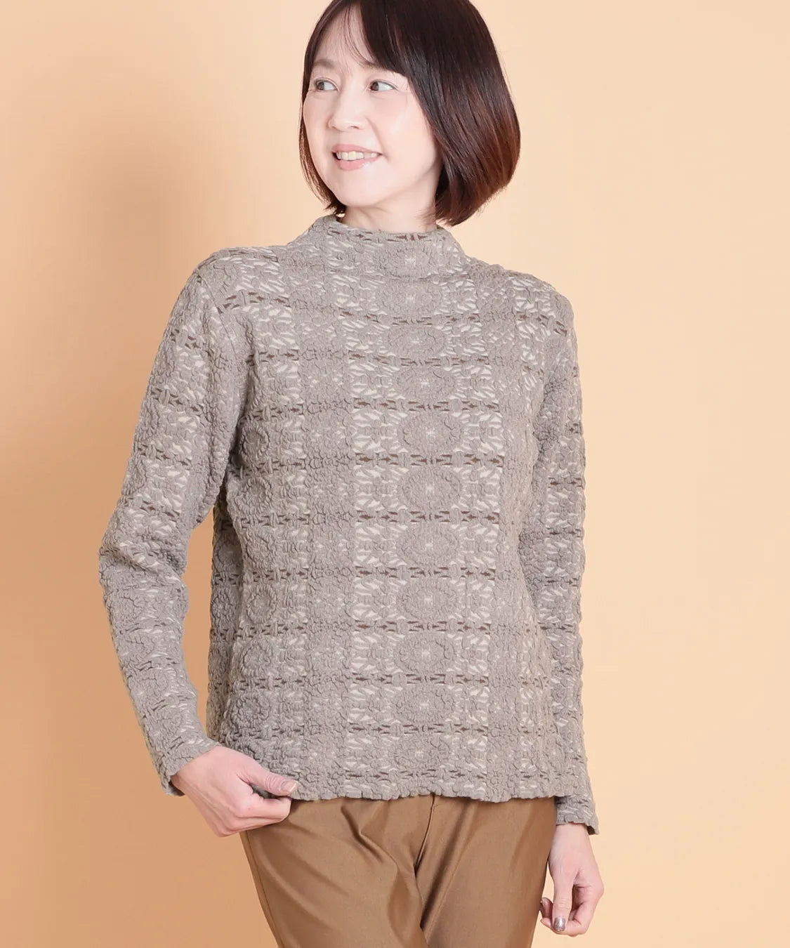 ほどよく高さのあるハイネックデザインが首元をやさしく包み、上品で落ち着いた印象に。