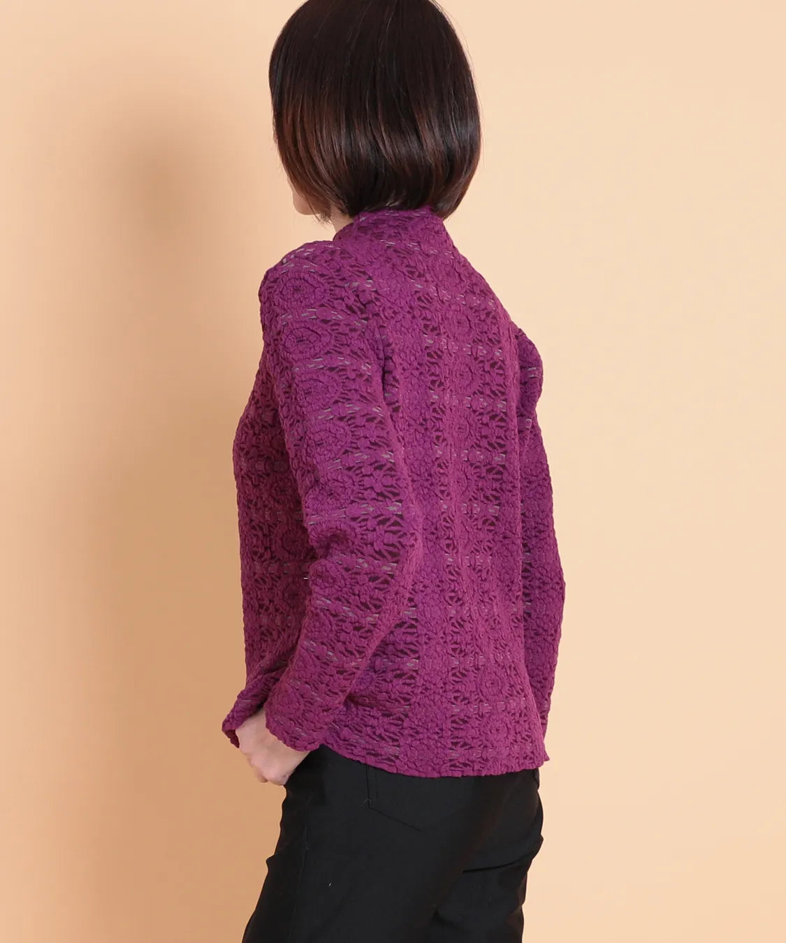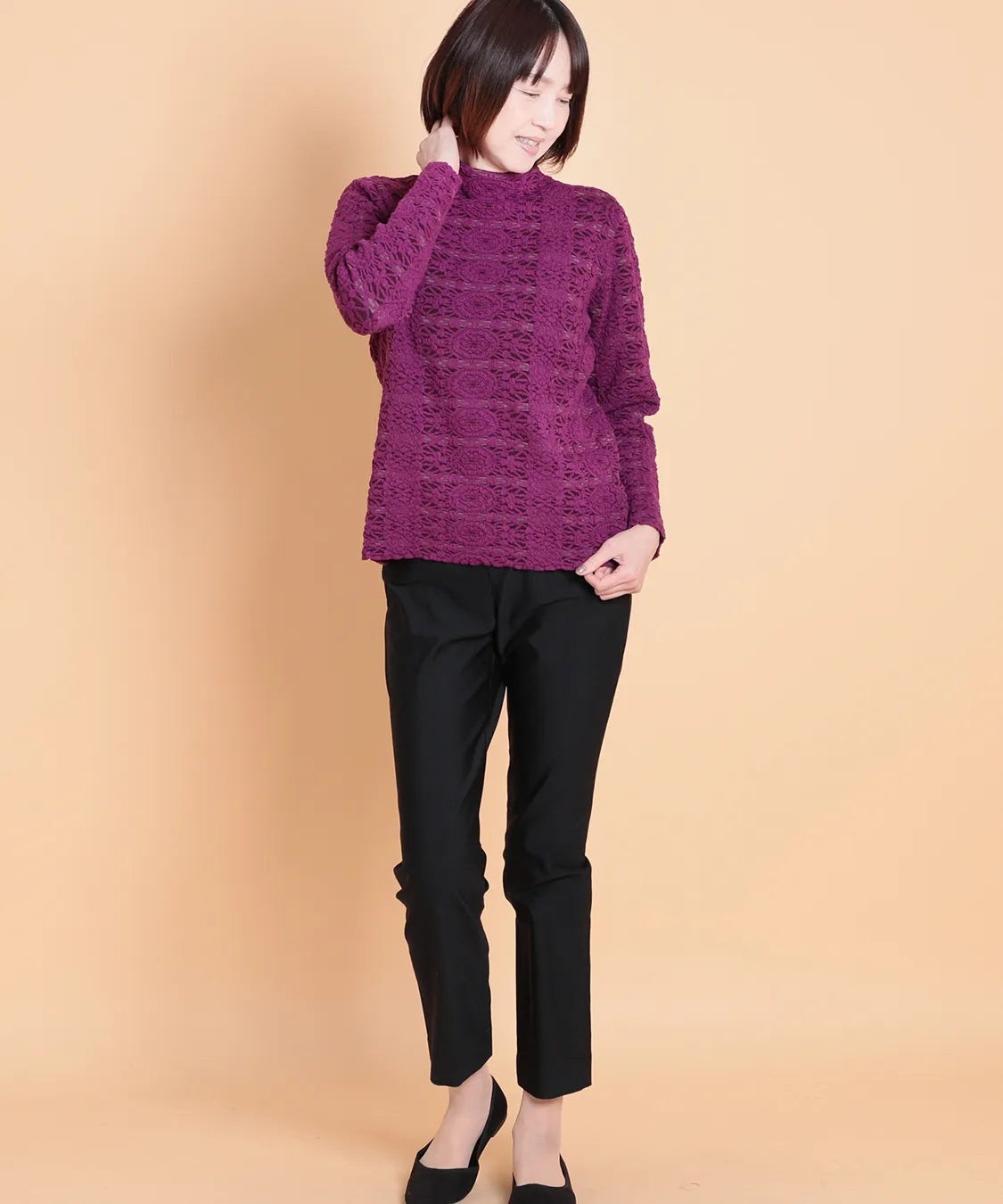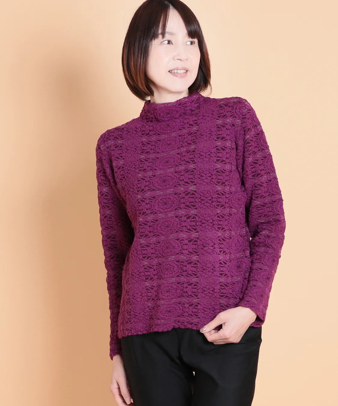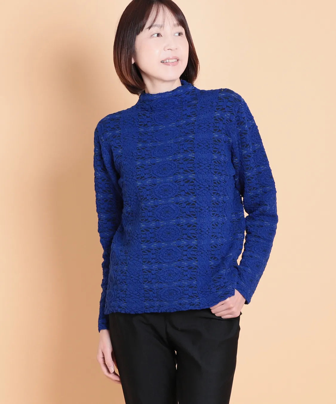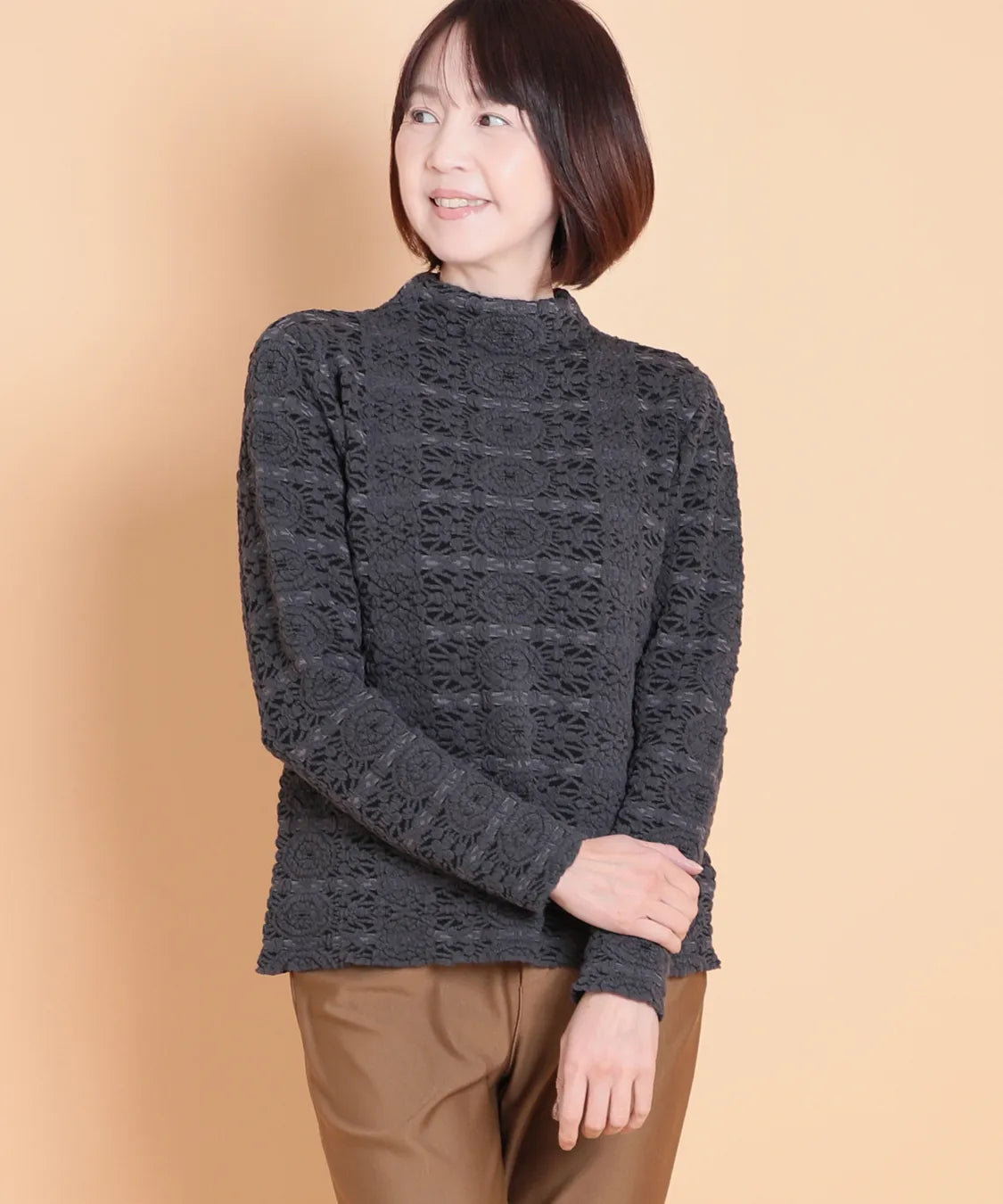 繊細なレース素材が、装いにさりげない華やかさを添える長袖トップスです。