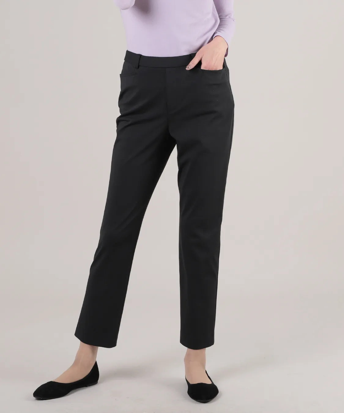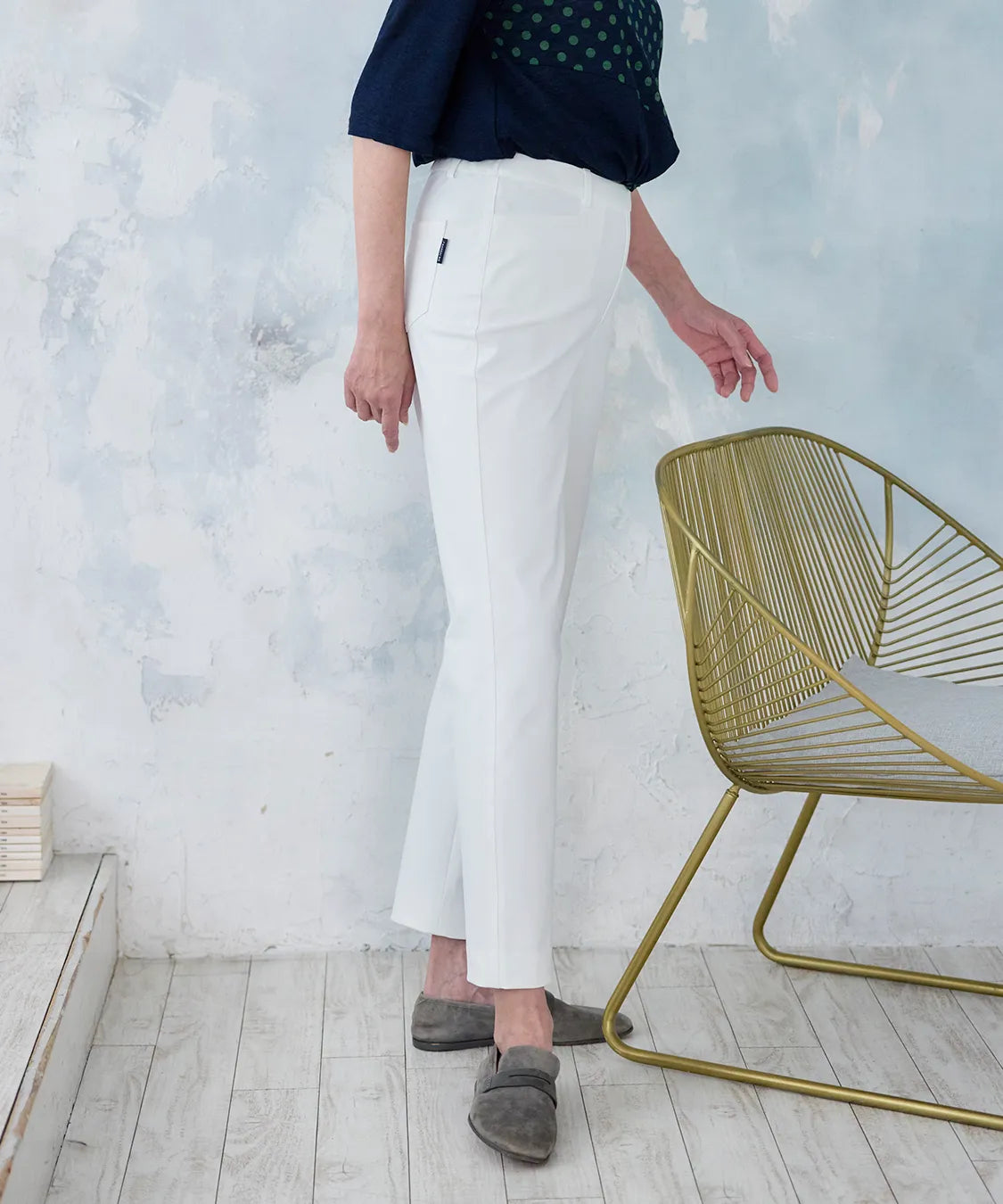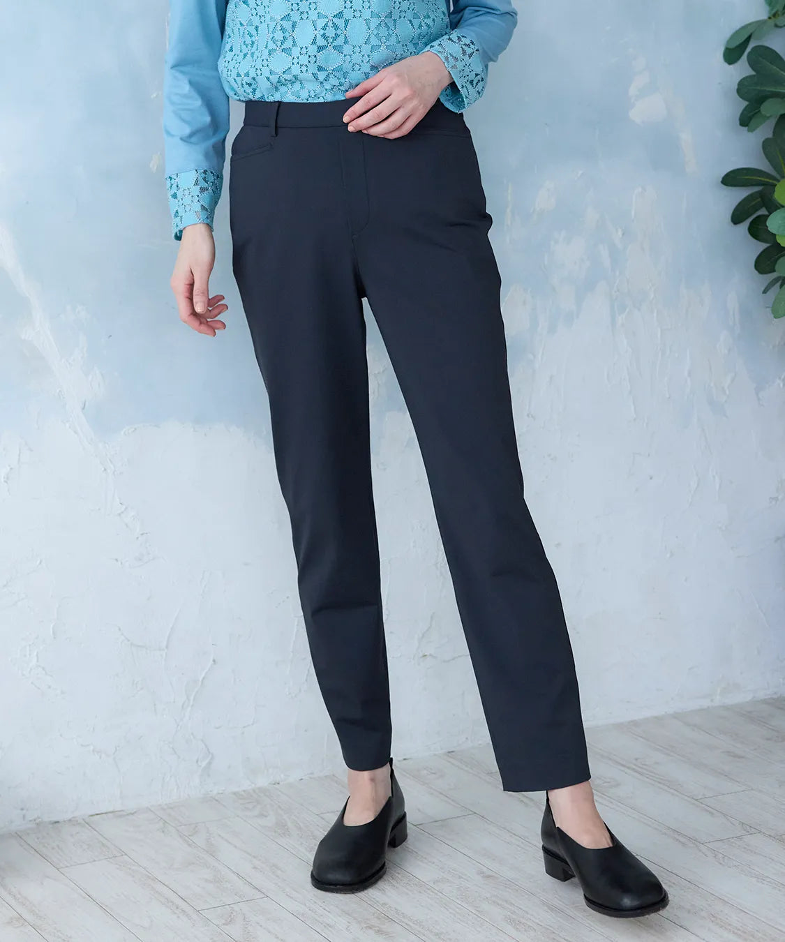 伸縮性の高い素材で動きやすく、春夏シーズンの軽やかな着心地を実現した定番スリムパンツ。後ろウエストのみゴム仕様でストレスなくフィットし、すっきりとした美しいシルエットをキープします。シンプルながら上品なデザインで、通勤から休日まで幅広いコーディネートに馴染む一着です。