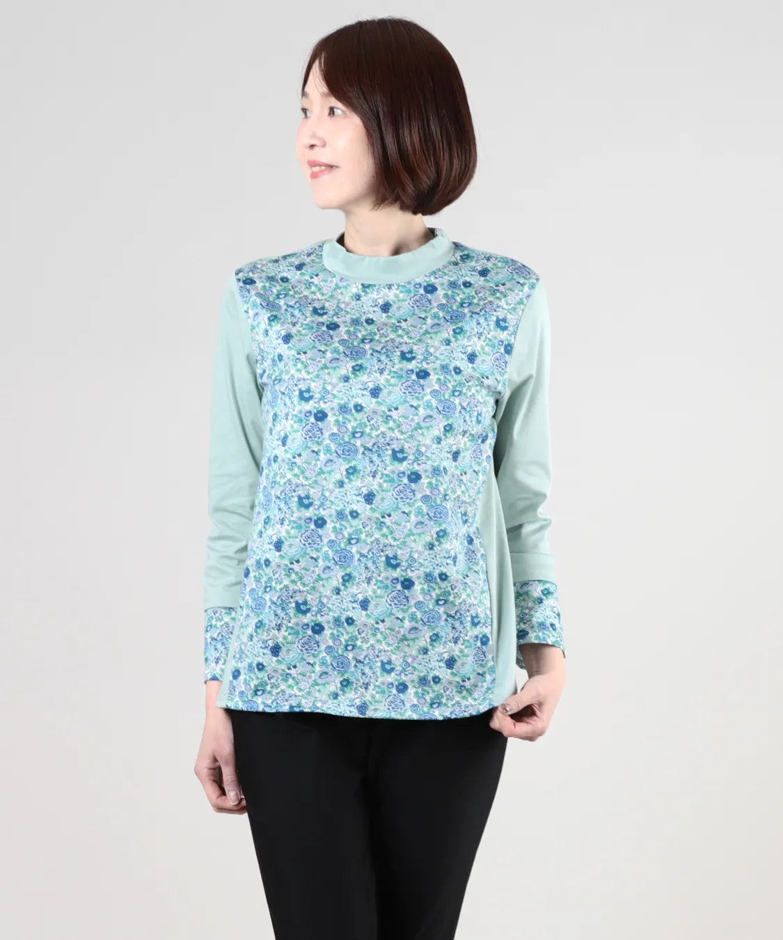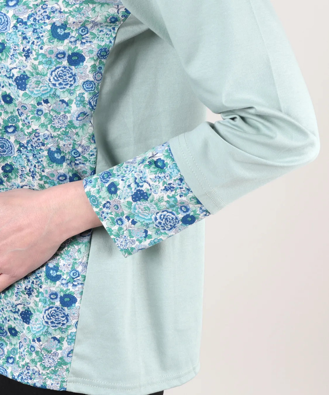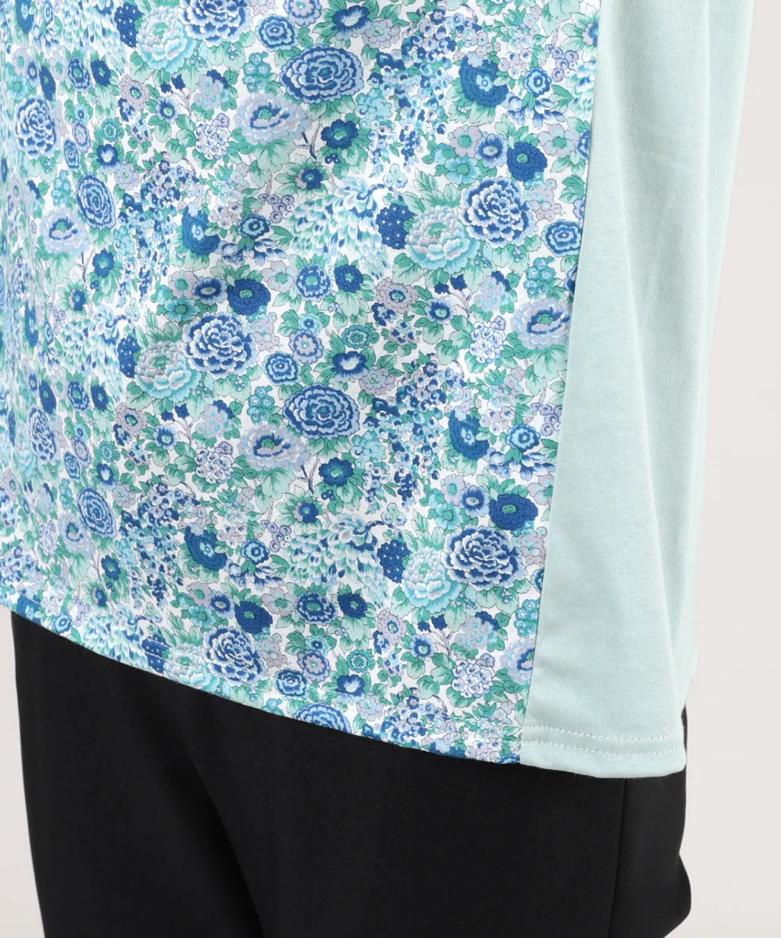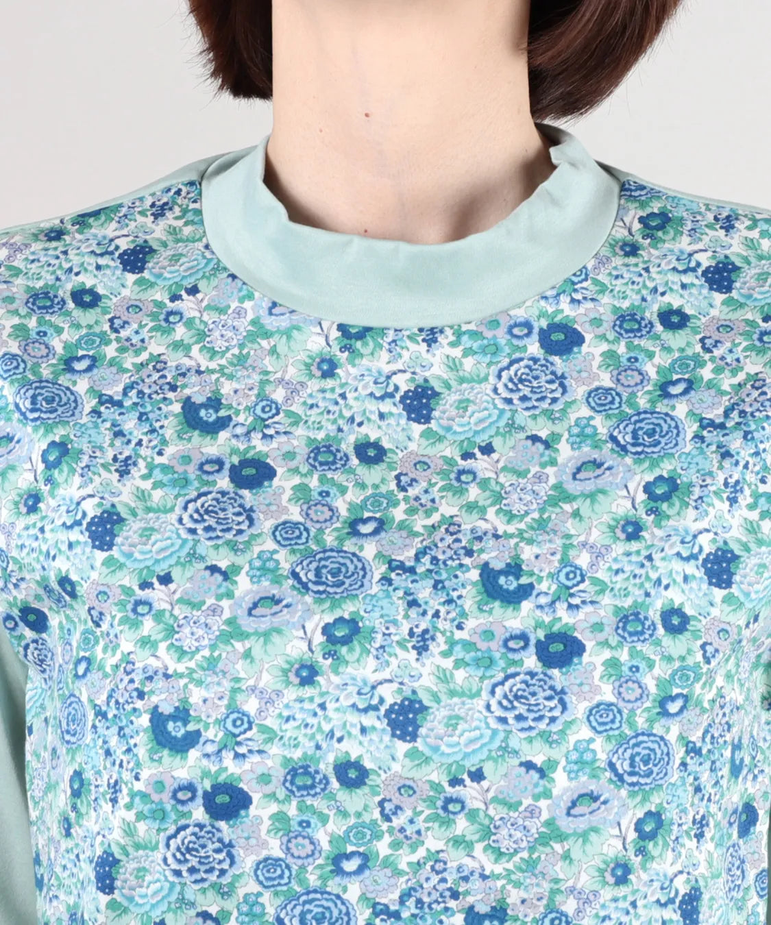 リバティの「エリシアン」柄を前身頃に配した、綿100%のジャージープルオーバー。上質でやわらかな綿素材が肌に心地よく寄り添い、長時間の着用でも快適な着心地です。フラワープリントはリバティが誇る歴史あるアーカイブからインスパイアされ、色鮮やかで華やかな表情を演出します。シンプルなシルエットでありながら、存在感のあるデザインはデイリーコーデを品よく引き立て、通勤から休日まで幅広く活躍。大人の女性にふさわしい上品な一枚です。