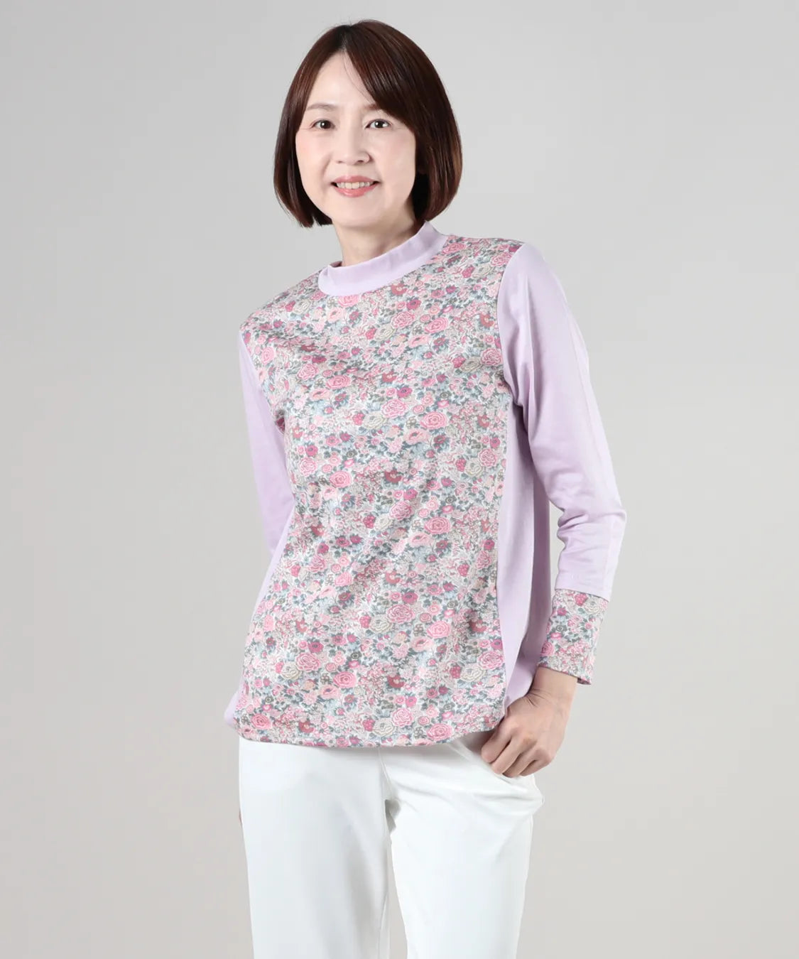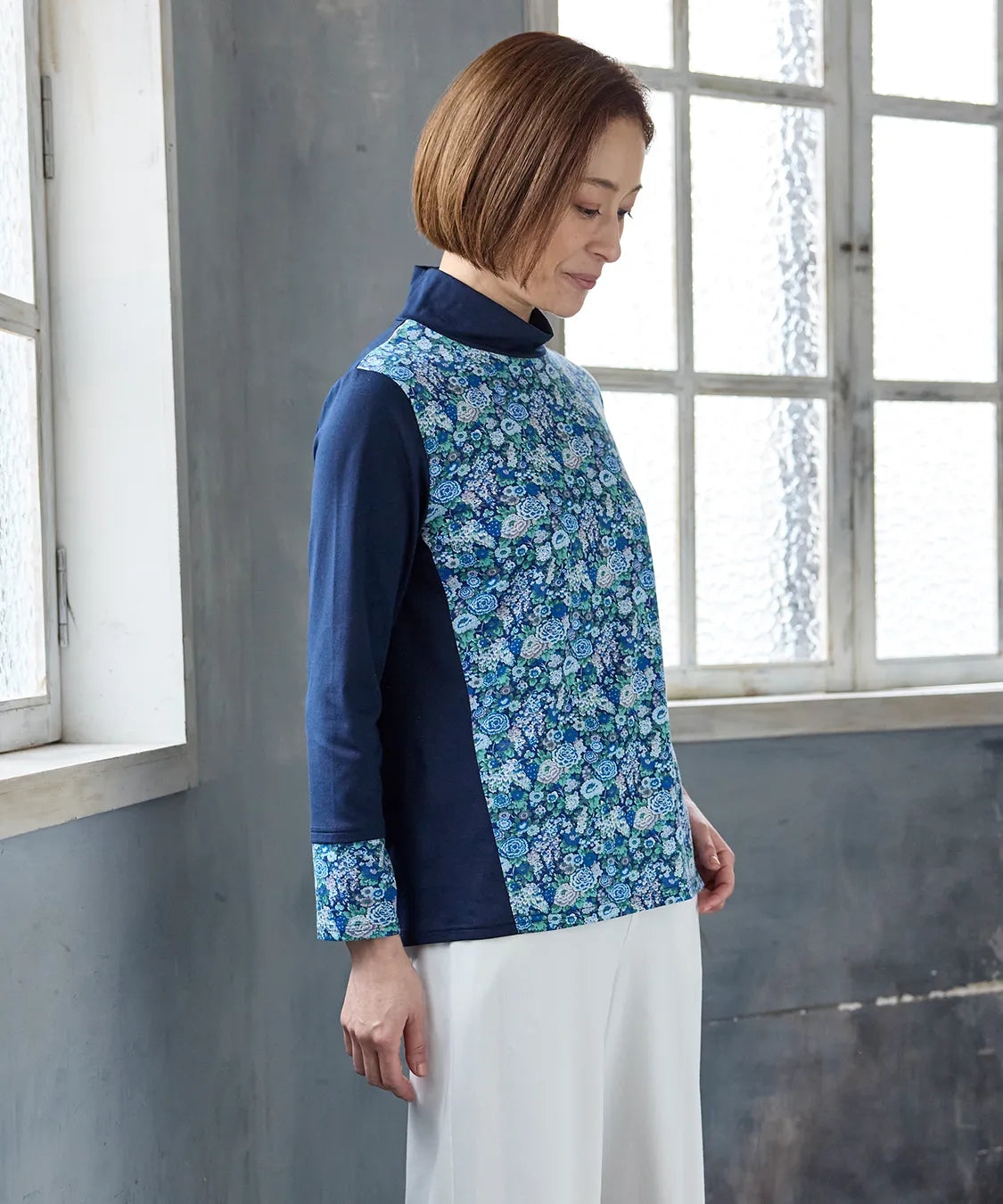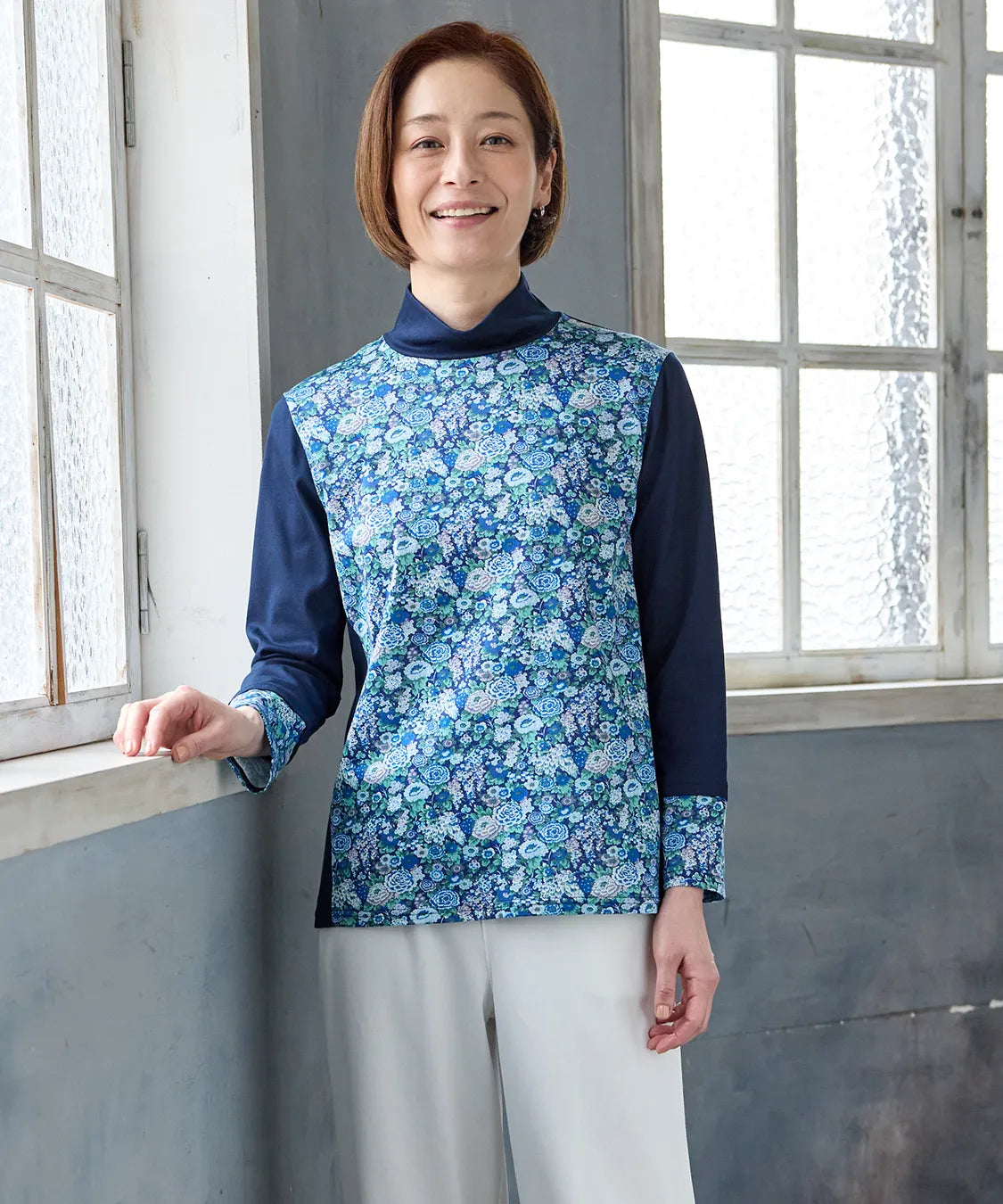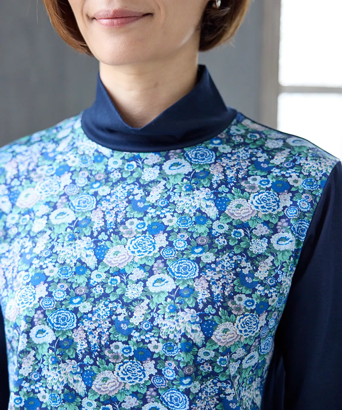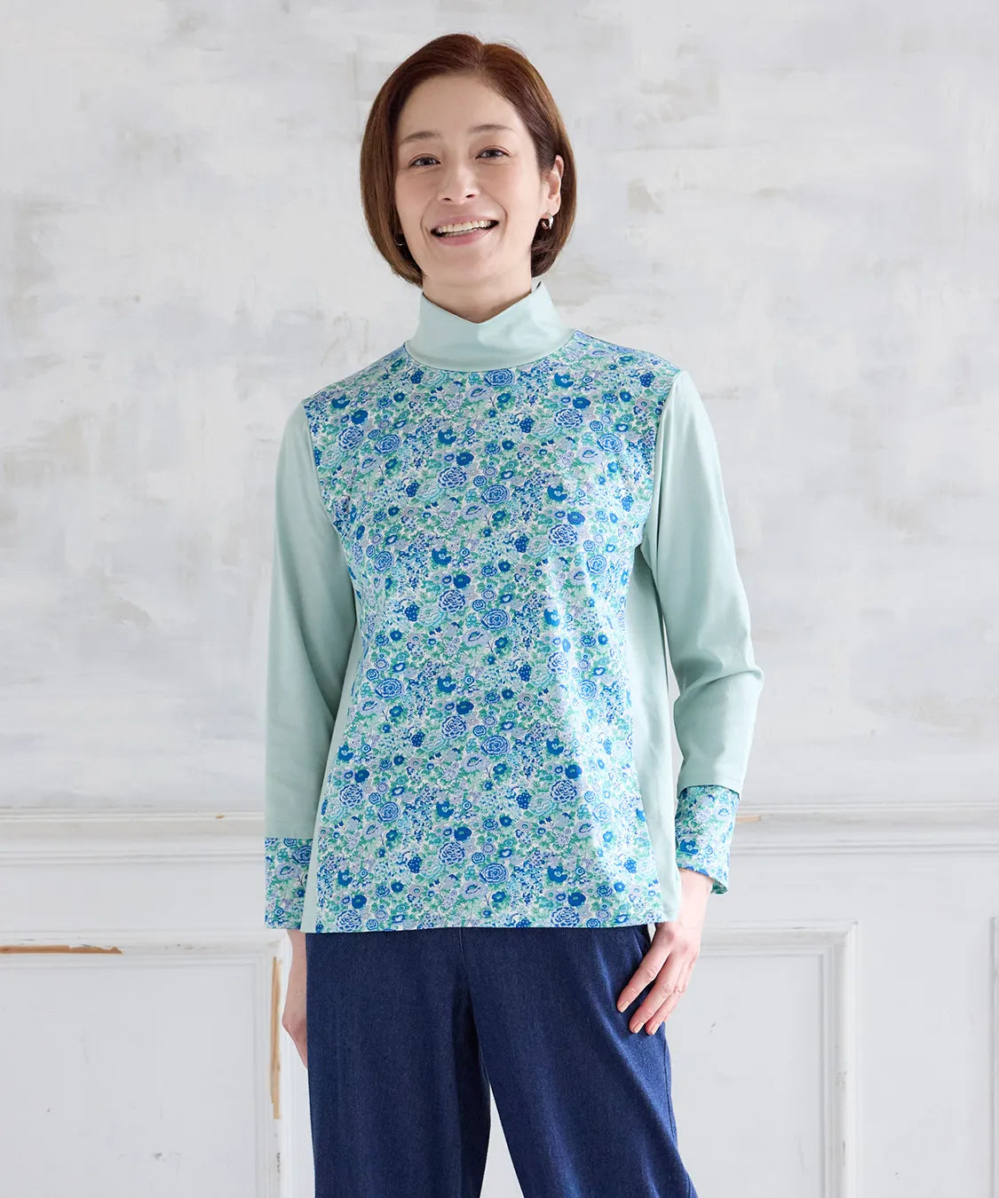 リバティの「エリシアン」柄を前身頃に配した、綿100%のジャージープルオーバー。上質でやわらかな綿素材が肌に心地よく寄り添い、長時間の着用でも快適な着心地です。フラワープリントはリバティが誇る歴史あるアーカイブからインスパイアされ、色鮮やかで華やかな表情を演出します。シンプルなシルエットでありながら、存在感のあるデザインはデイリーコーデを品よく引き立て、通勤から休日まで幅広く活躍。大人の女性にふさわしい上品な一枚です。