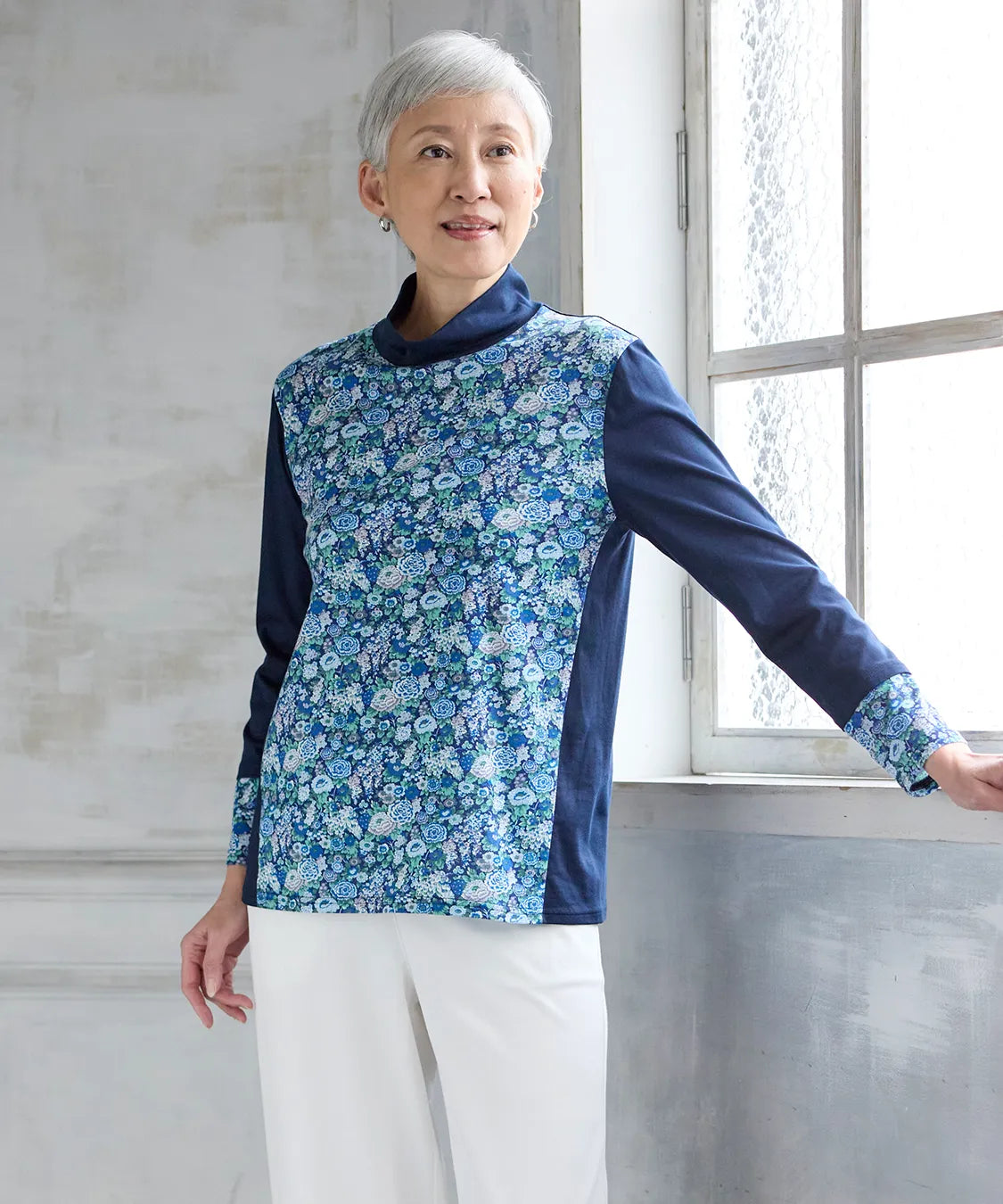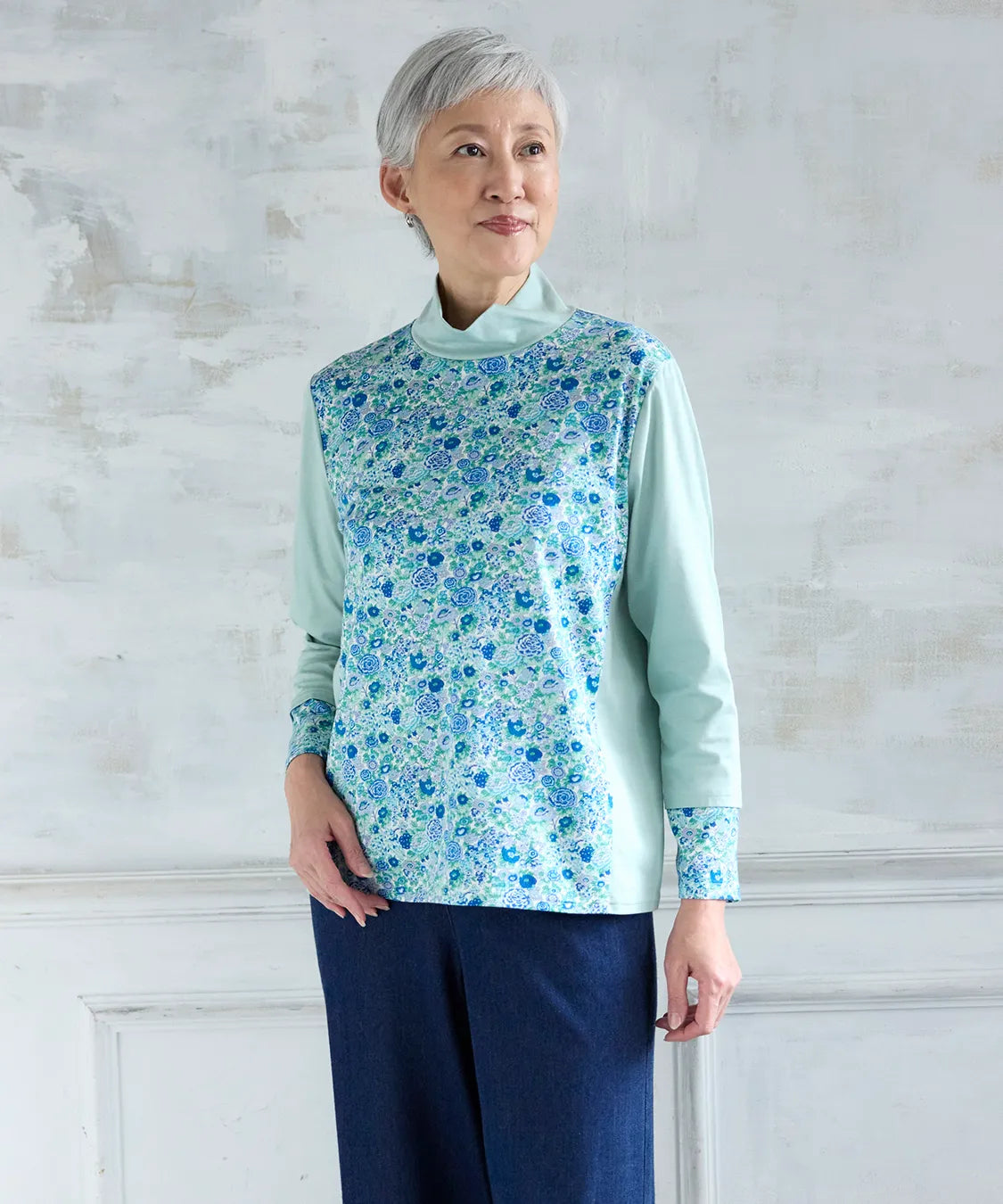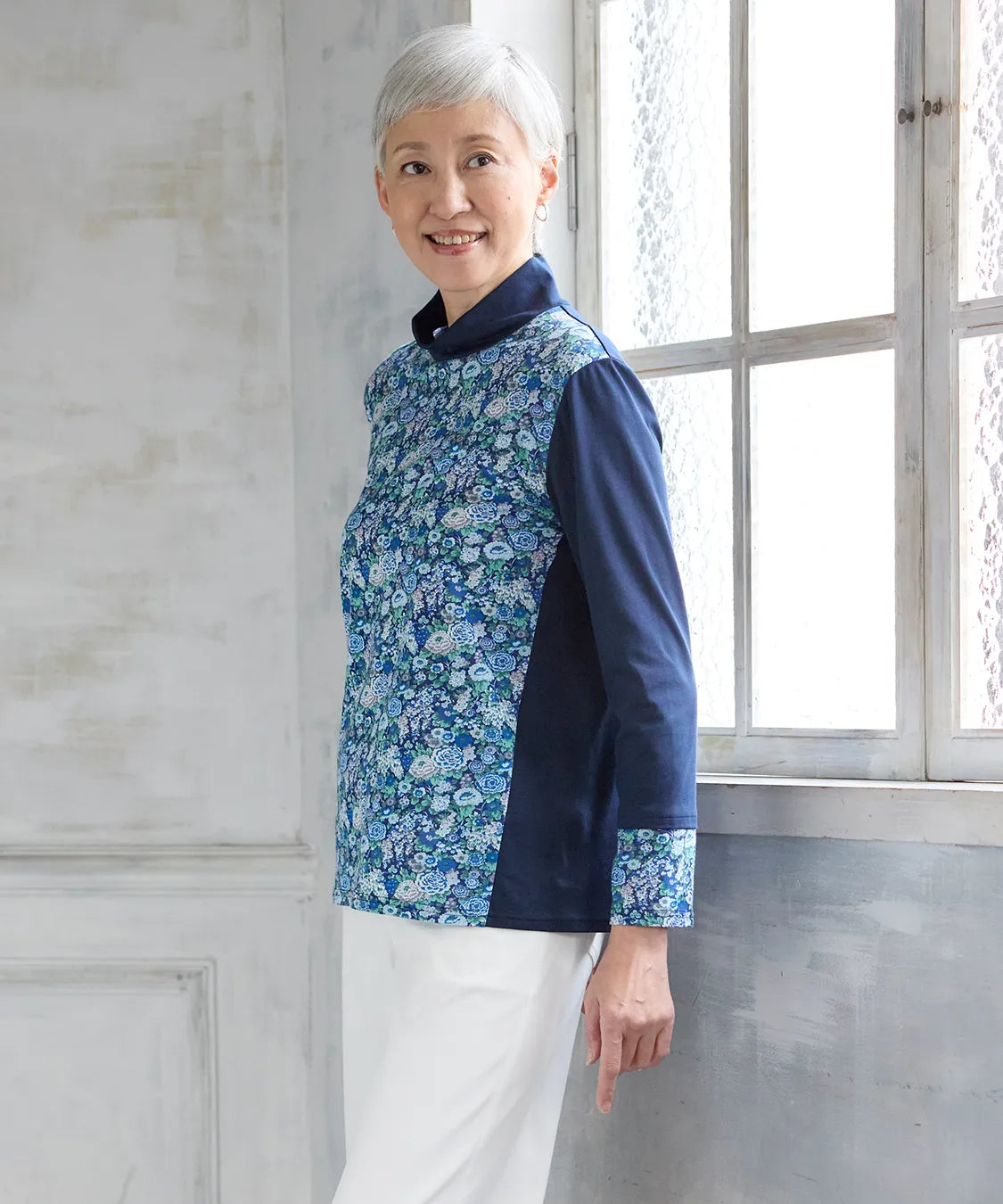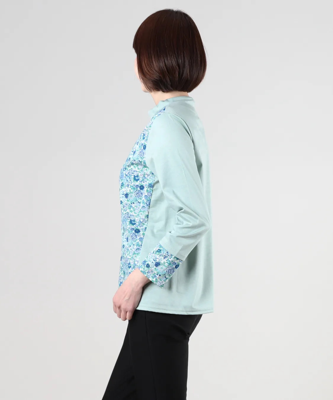 リバティの「エリシアン」柄を前身頃に配した、綿100%のジャージープルオーバー。上質でやわらかな綿素材が肌に心地よく寄り添い、長時間の着用でも快適な着心地です。フラワープリントはリバティが誇る歴史あるアーカイブからインスパイアされ、色鮮やかで華やかな表情を演出します。シンプルなシルエットでありながら、存在感のあるデザインはデイリーコーデを品よく引き立て、通勤から休日まで幅広く活躍。大人の女性にふさわしい上品な一枚です。