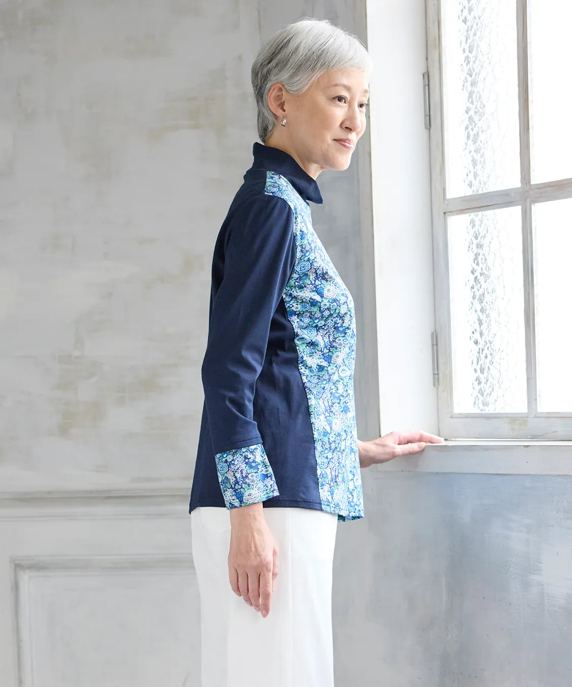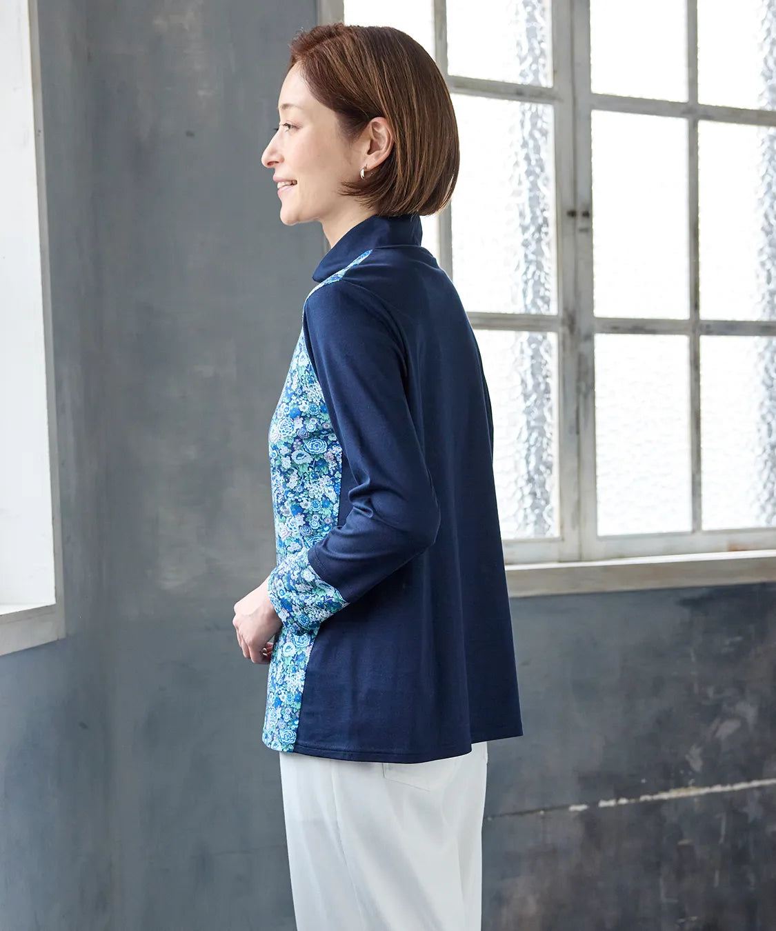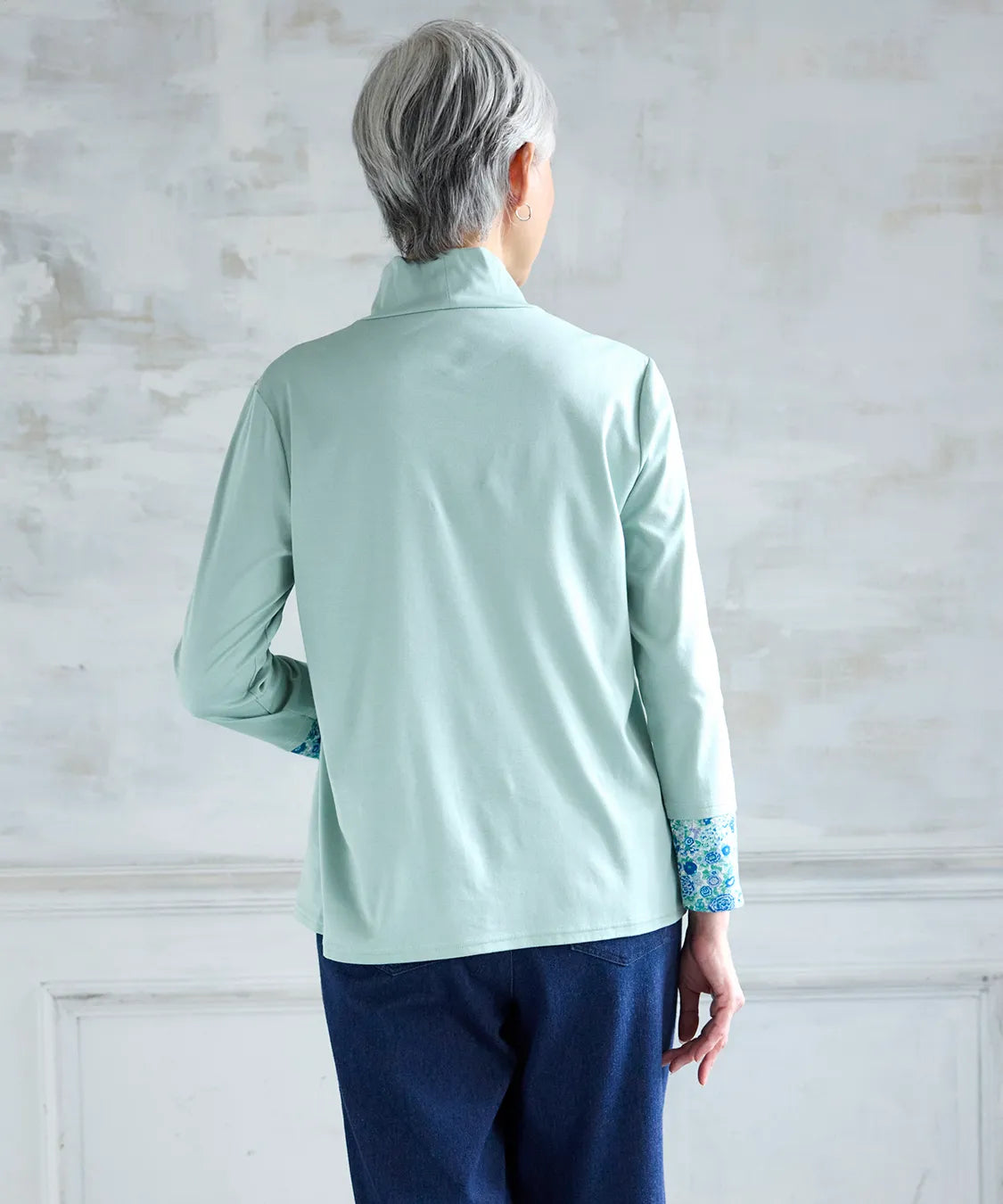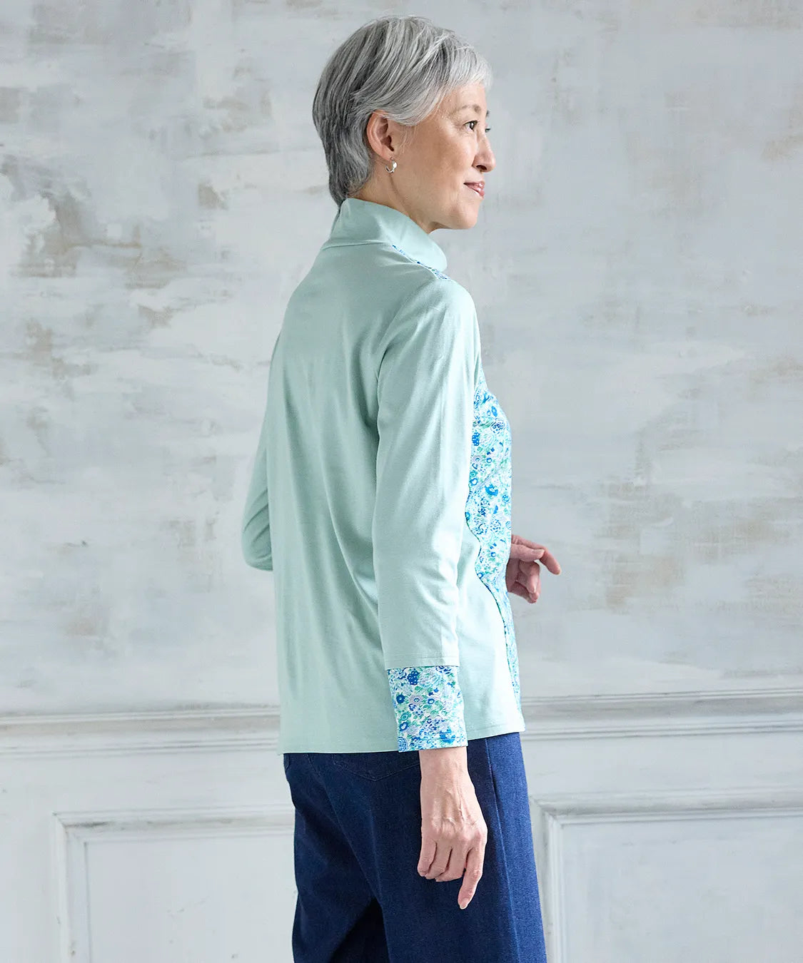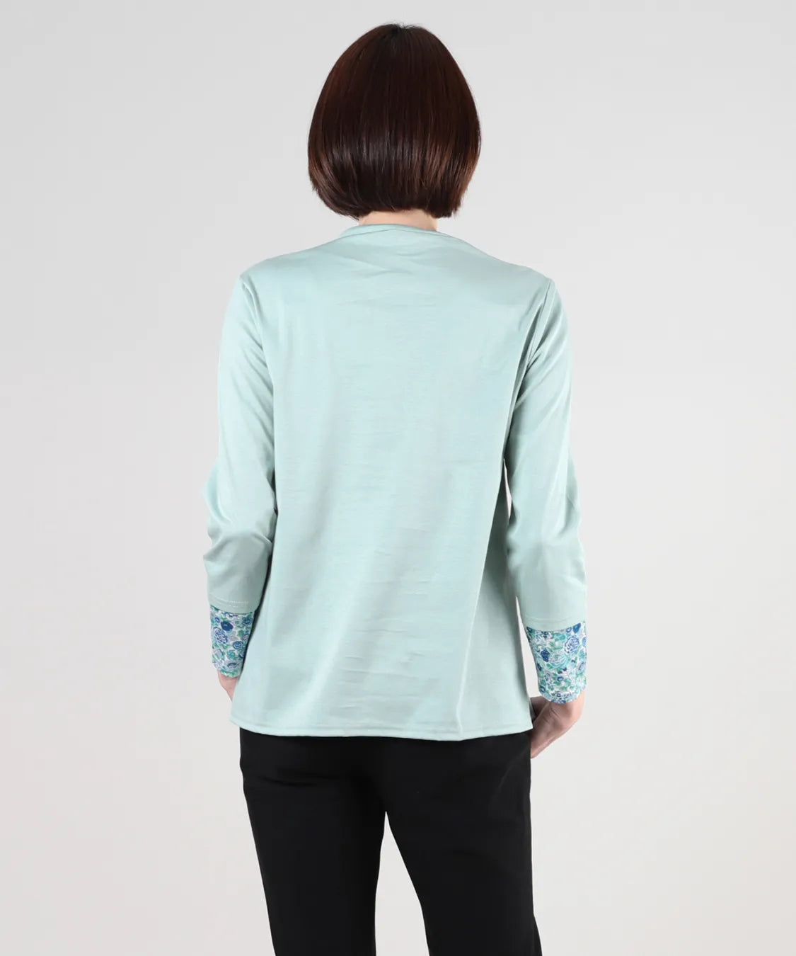 リバティの「エリシアン」柄を前身頃に配した、綿100%のジャージープルオーバー。上質でやわらかな綿素材が肌に心地よく寄り添い、長時間の着用でも快適な着心地です。フラワープリントはリバティが誇る歴史あるアーカイブからインスパイアされ、色鮮やかで華やかな表情を演出します。シンプルなシルエットでありながら、存在感のあるデザインはデイリーコーデを品よく引き立て、通勤から休日まで幅広く活躍。大人の女性にふさわしい上品な一枚です。