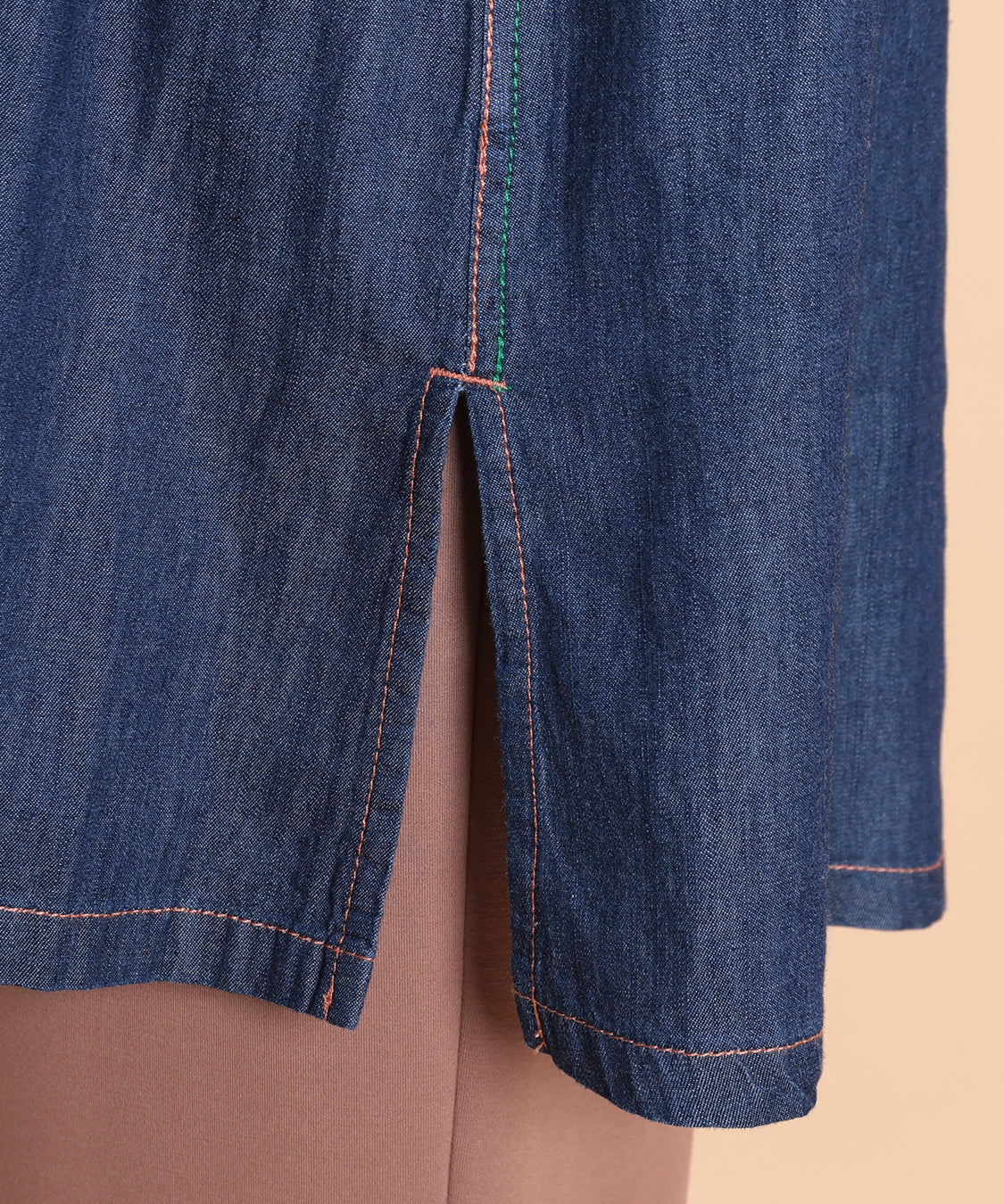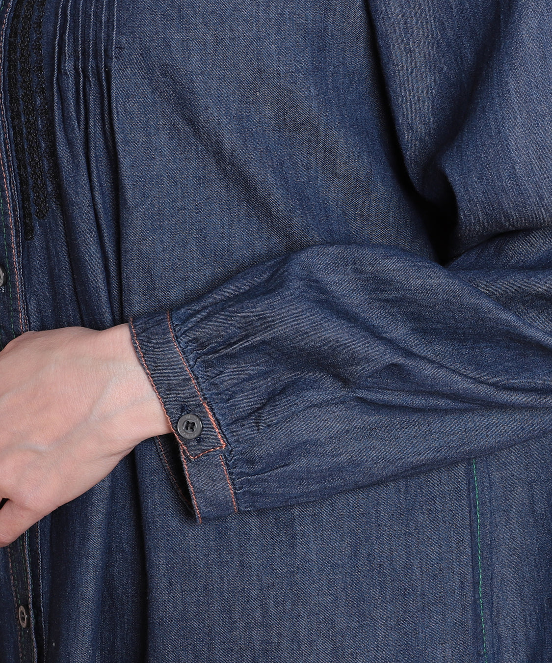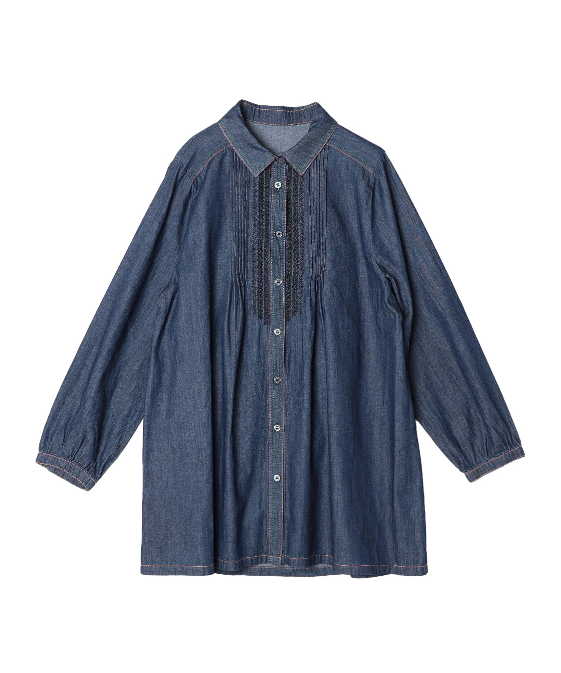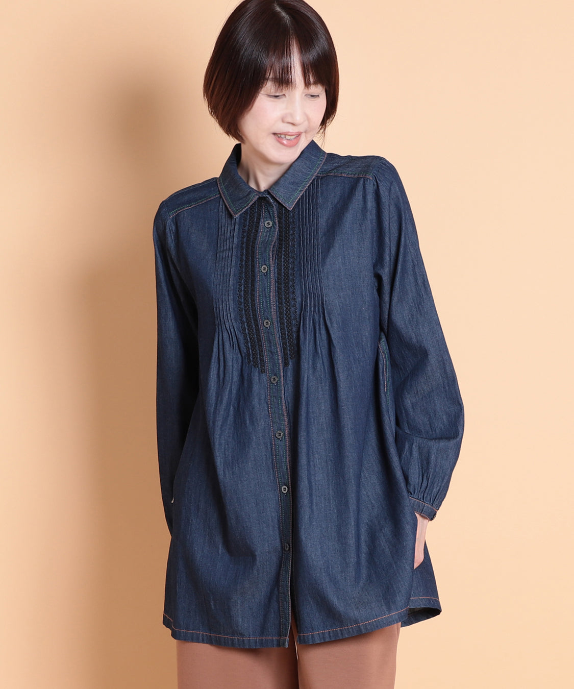 シーズンレスで活躍する軽やかな一着。フロントのピンタックやステッチがさりげなくかわいいアクセントに。カジュアルなデニム素材に程よい女性らしさをプラスしています。100%コットン素材を使用し、肌触りが良く、デイリーに着回しやすい一枚に仕上げました。
