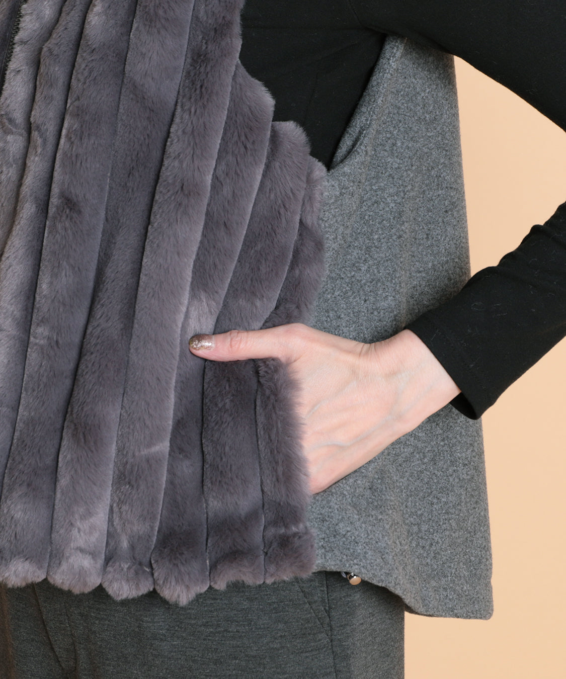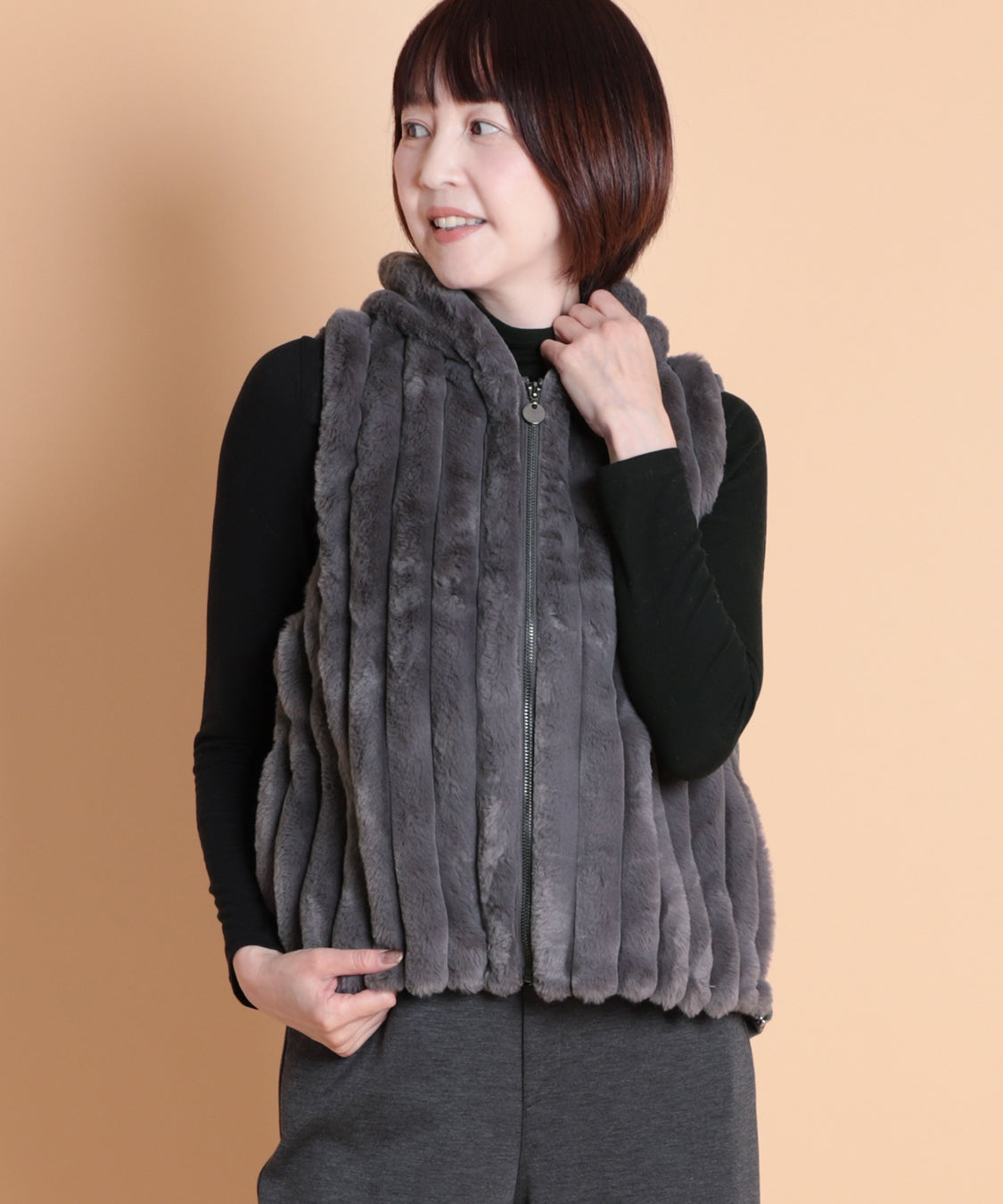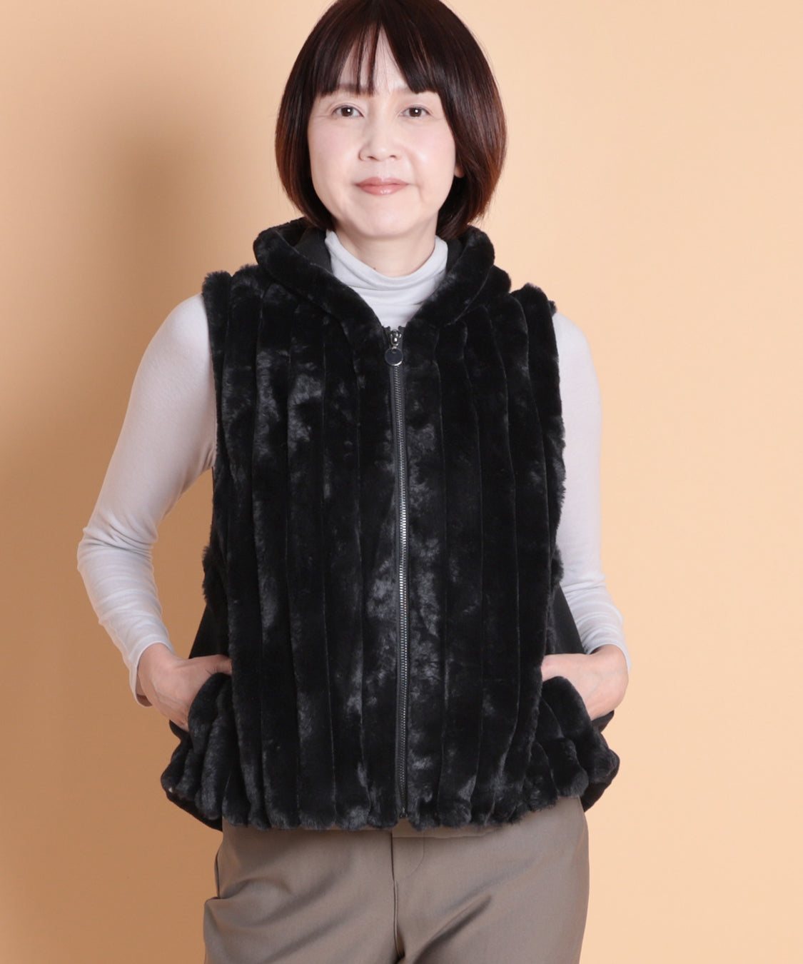 柔らかな肌触りと上品な光沢感が魅力のフェイクファーベスト。 軽量ながらしっかりとした保温性があります。ジップ仕様で着脱も簡単、両サイドには便利なポケット付き。 カジュアルにもエレガントにも合わせやすい万能アイテムです。