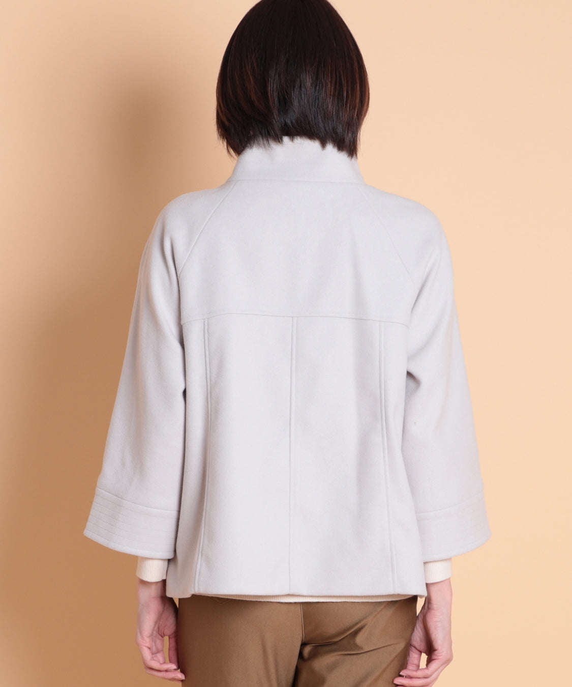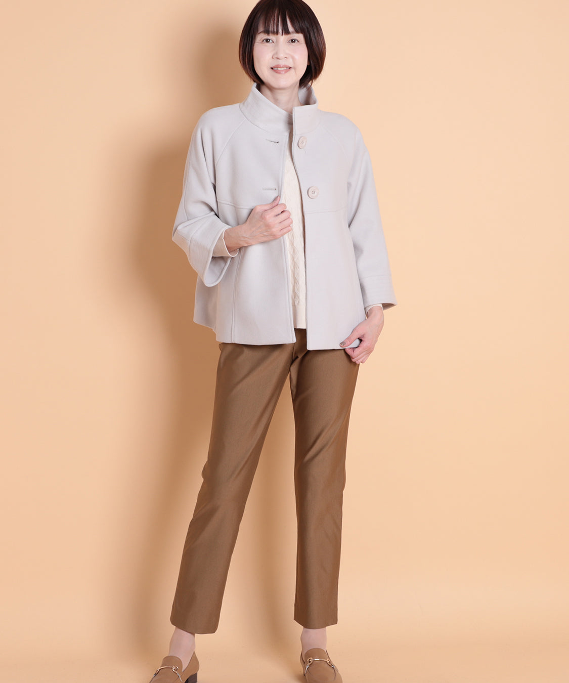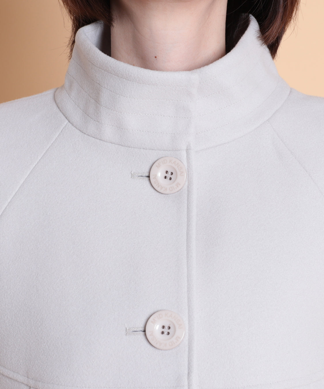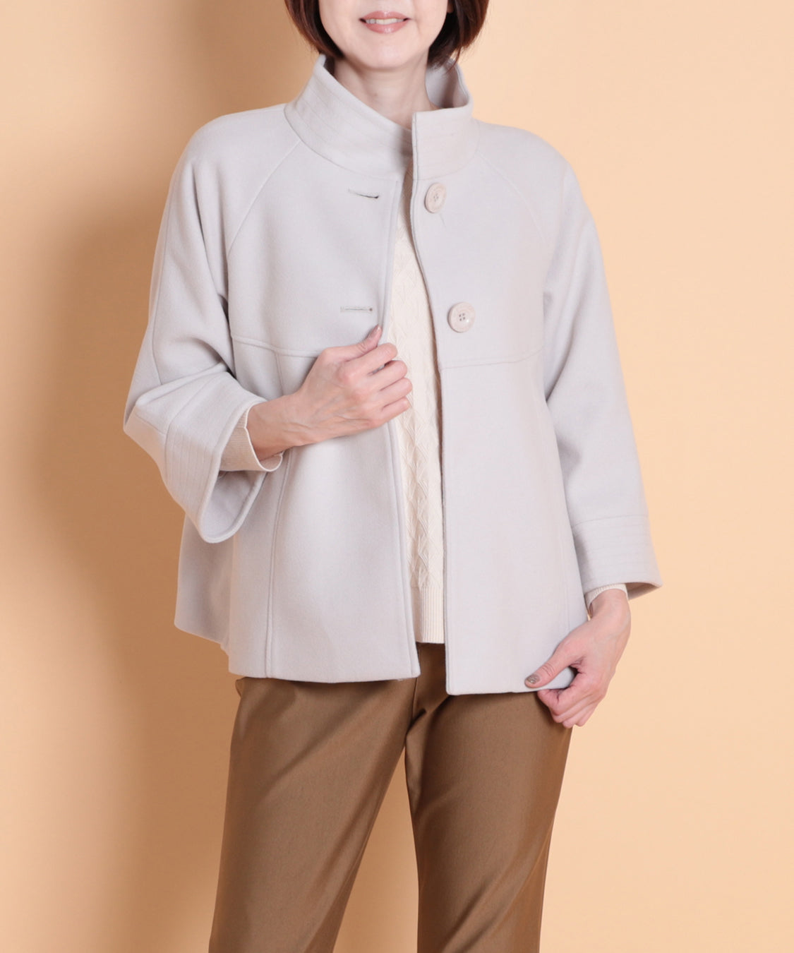 大きめの2ボタンが上品なアクセントを添える、のスタンドカラージャケットです。程よく広がるAラインシルエットがエレガントな印象。胸元に曲線的な切り替えを入れ、立体的な表情をプラスしました。