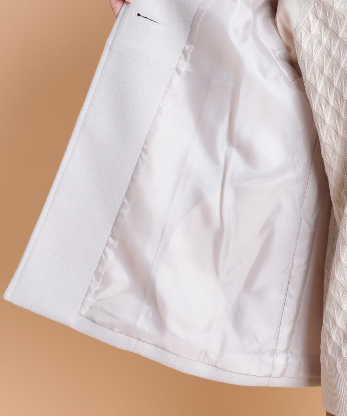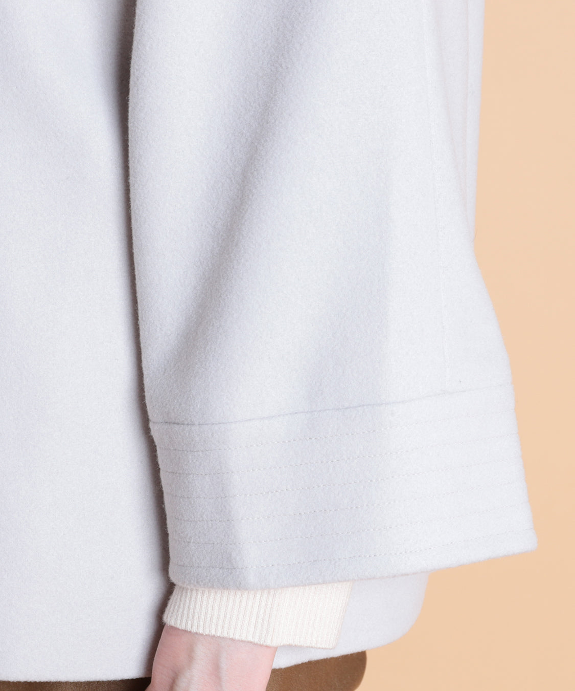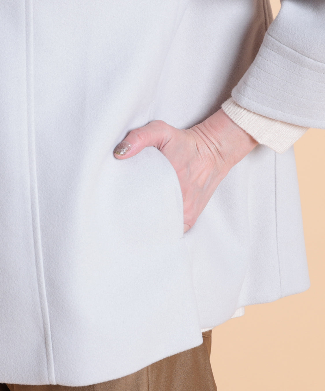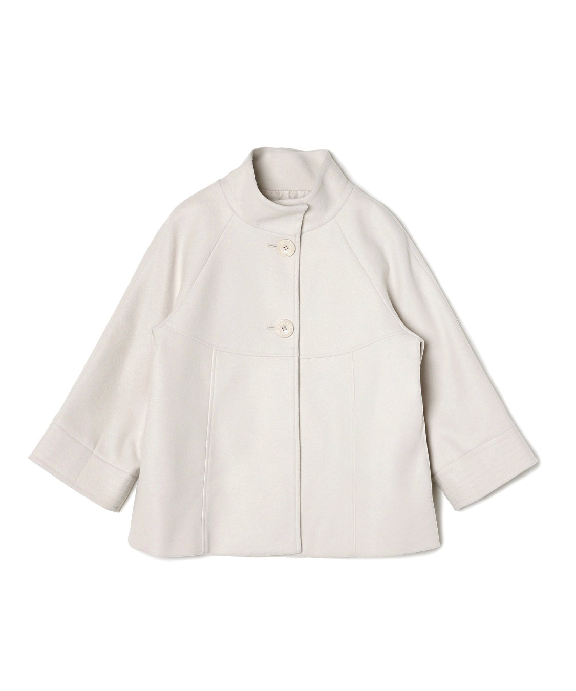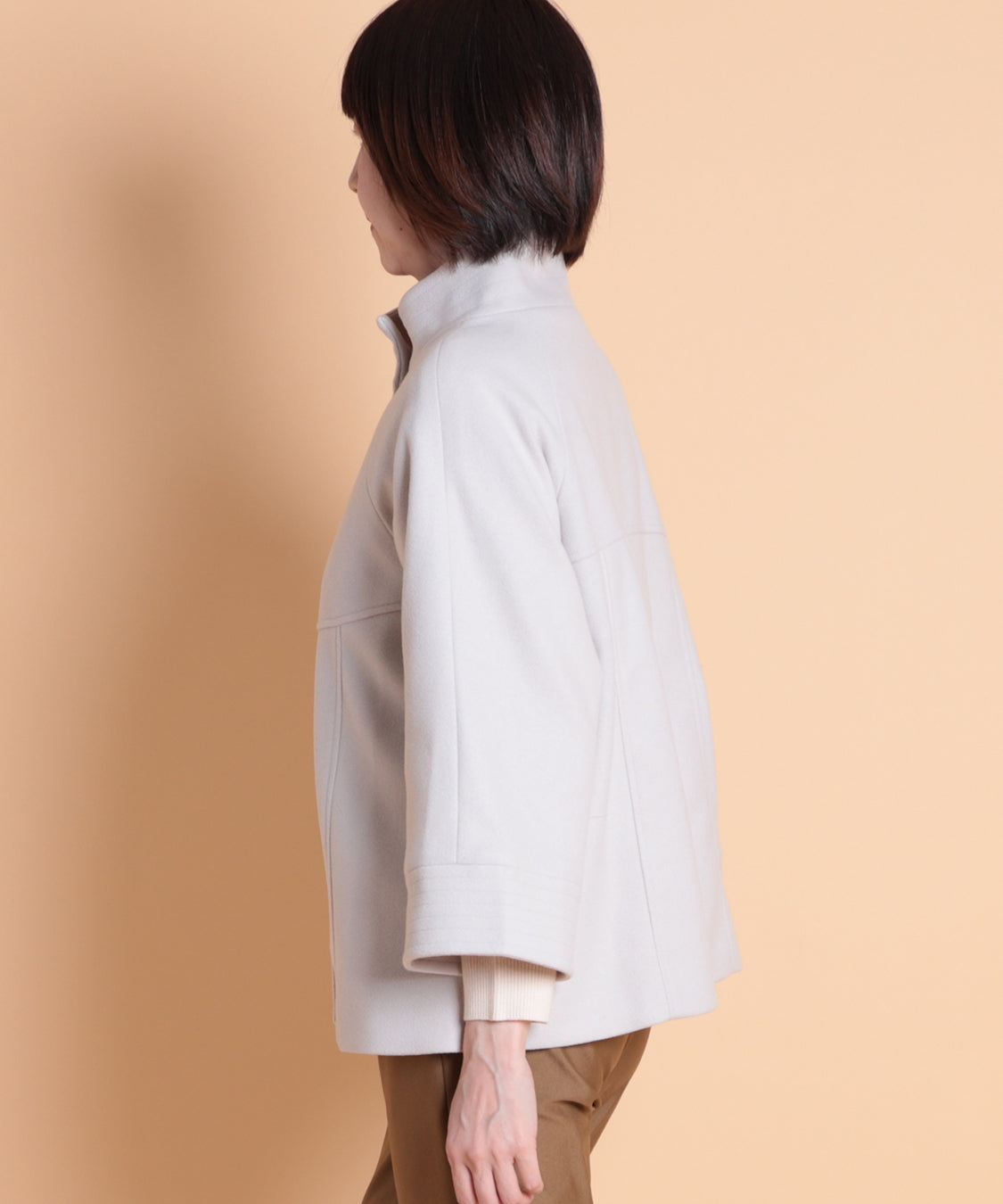 大きめの2ボタンが上品なアクセントを添える、のスタンドカラージャケットです。程よく広がるAラインシルエットがエレガントな印象。胸元に曲線的な切り替えを入れ、立体的な表情をプラスしました。