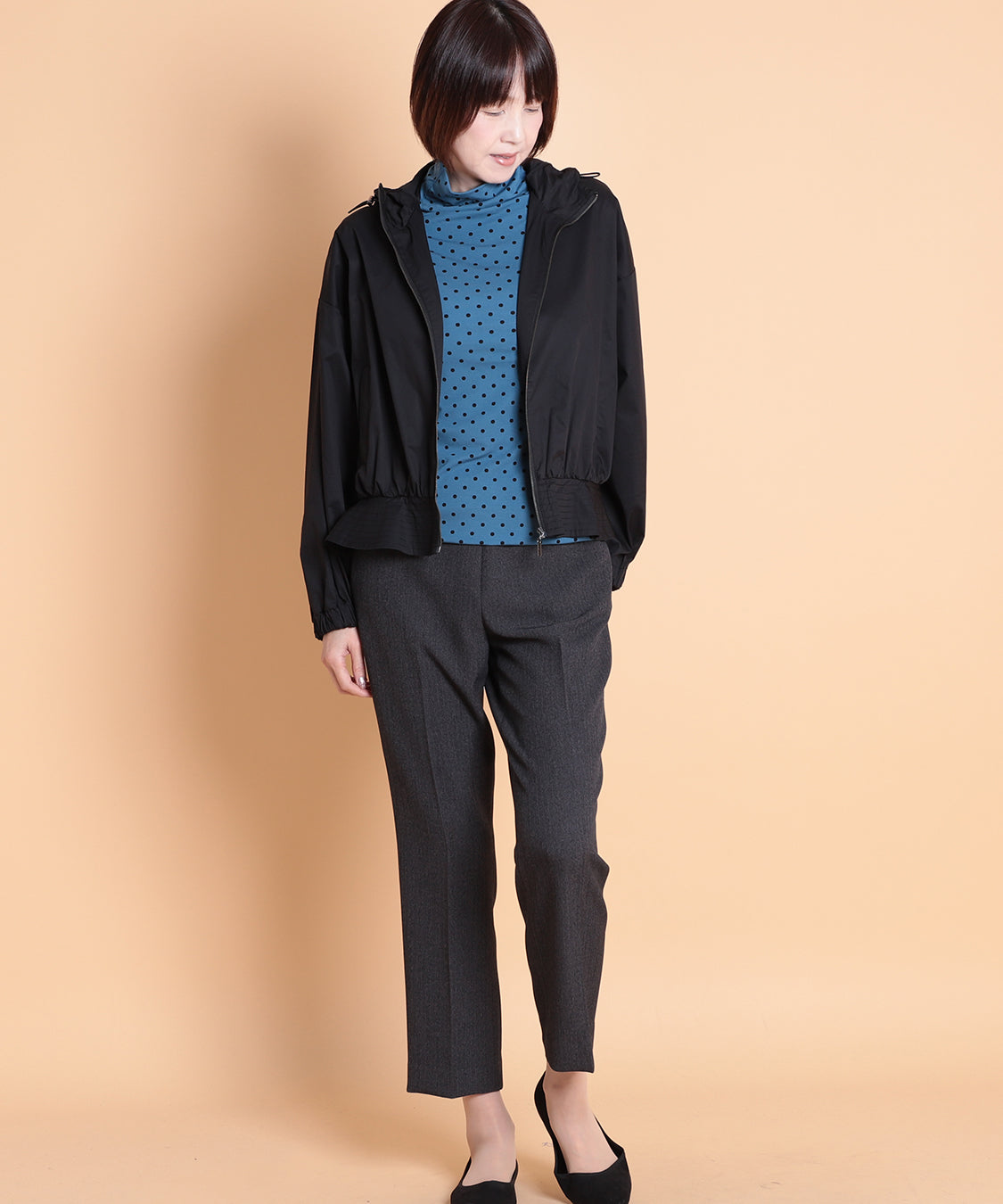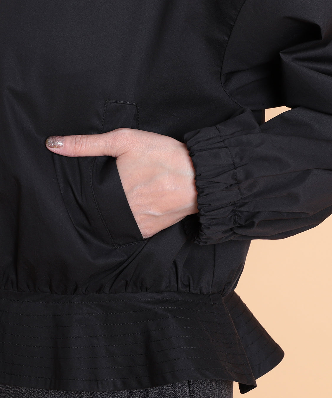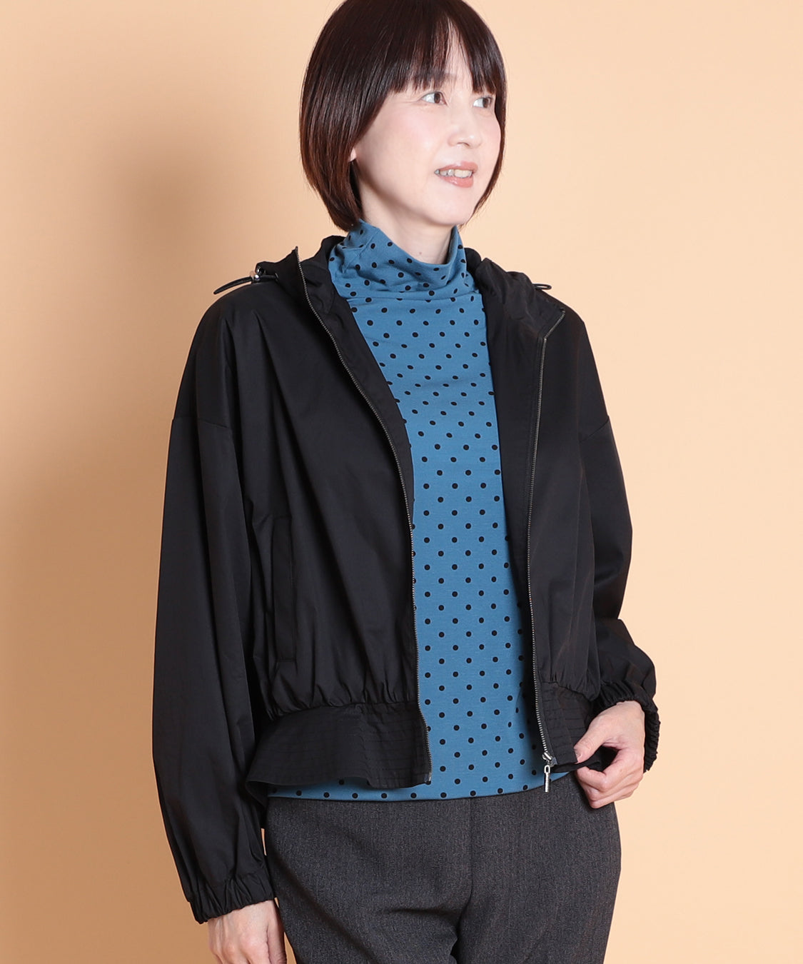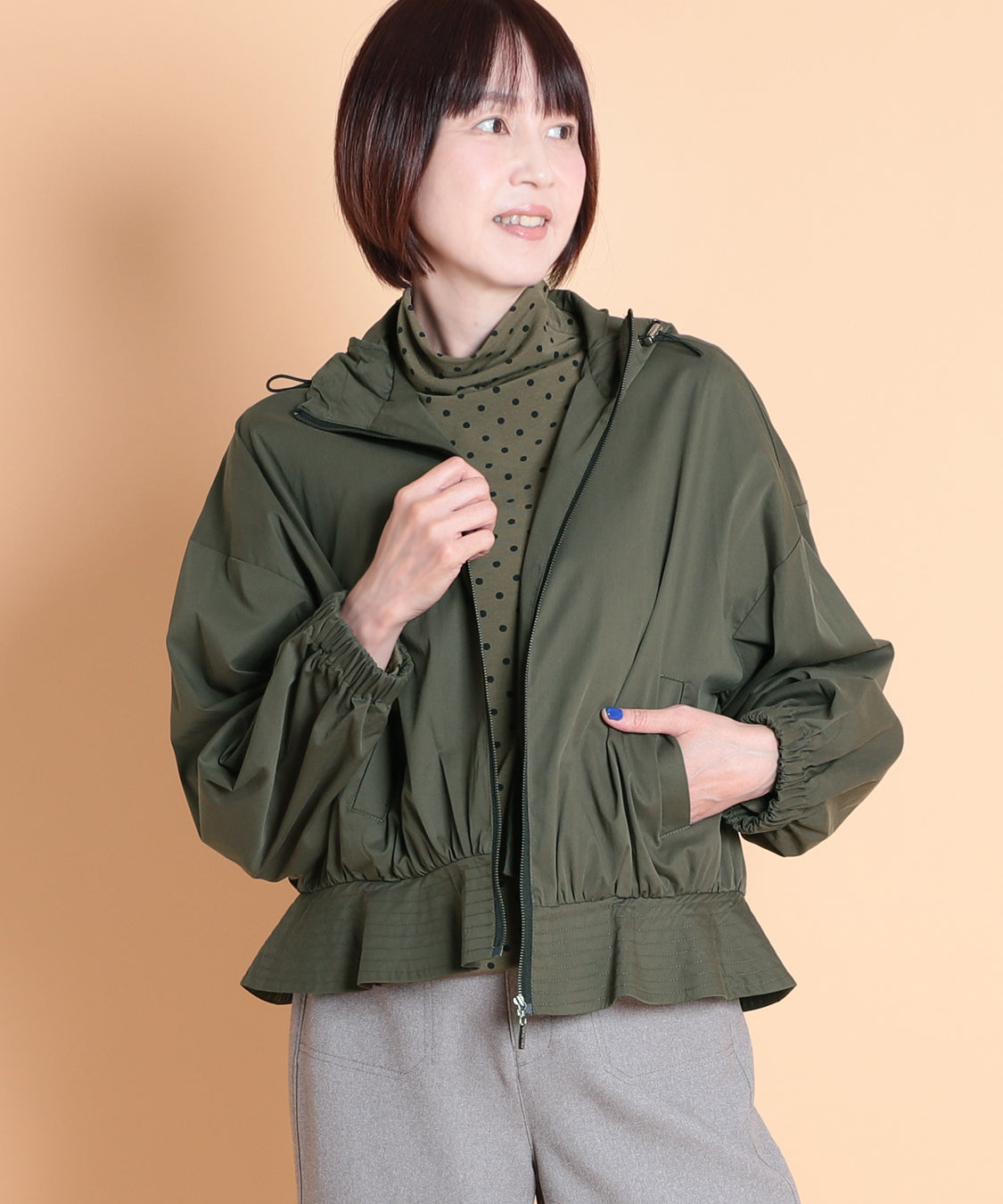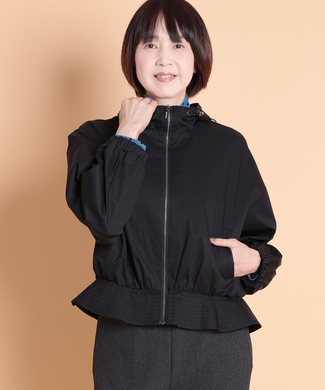 季節の代わり目に大活躍するフード付きペプラムパーカー