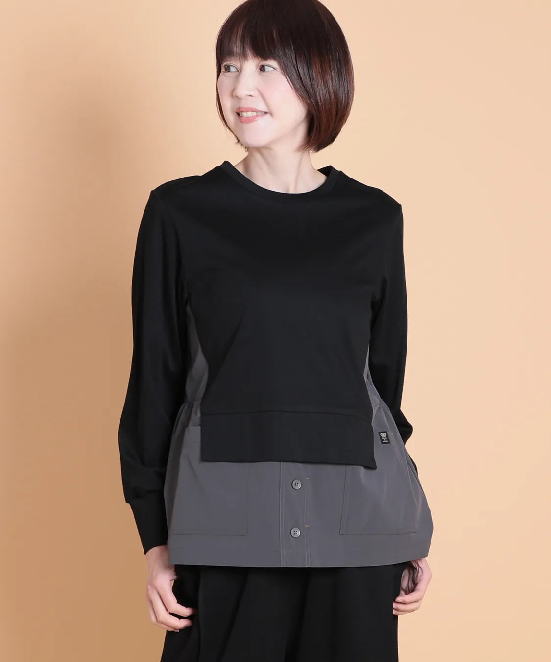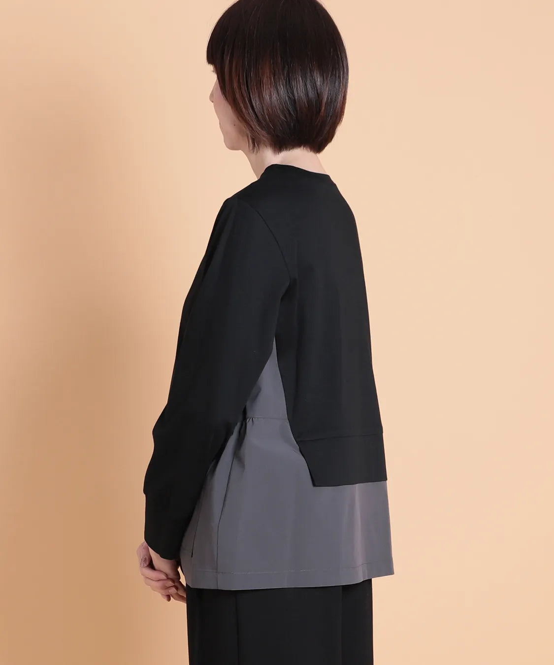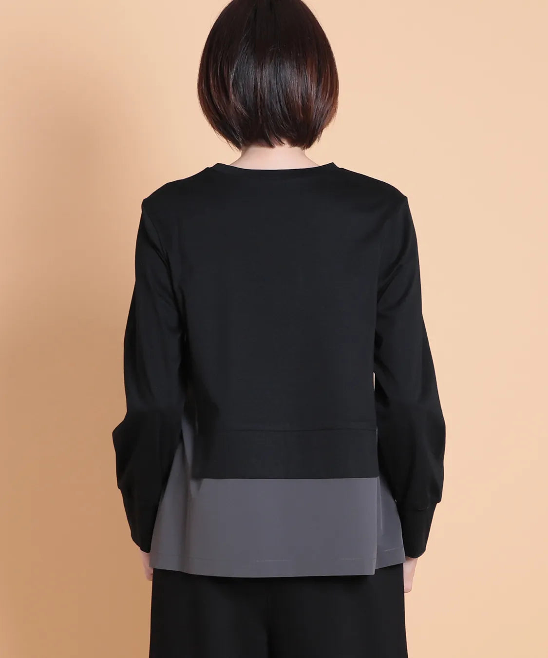 カジュアルなカットソーに光沢感のあるタフタ素材を裾に切り替えることで、他にはない個性的な一枚に仕上げました。