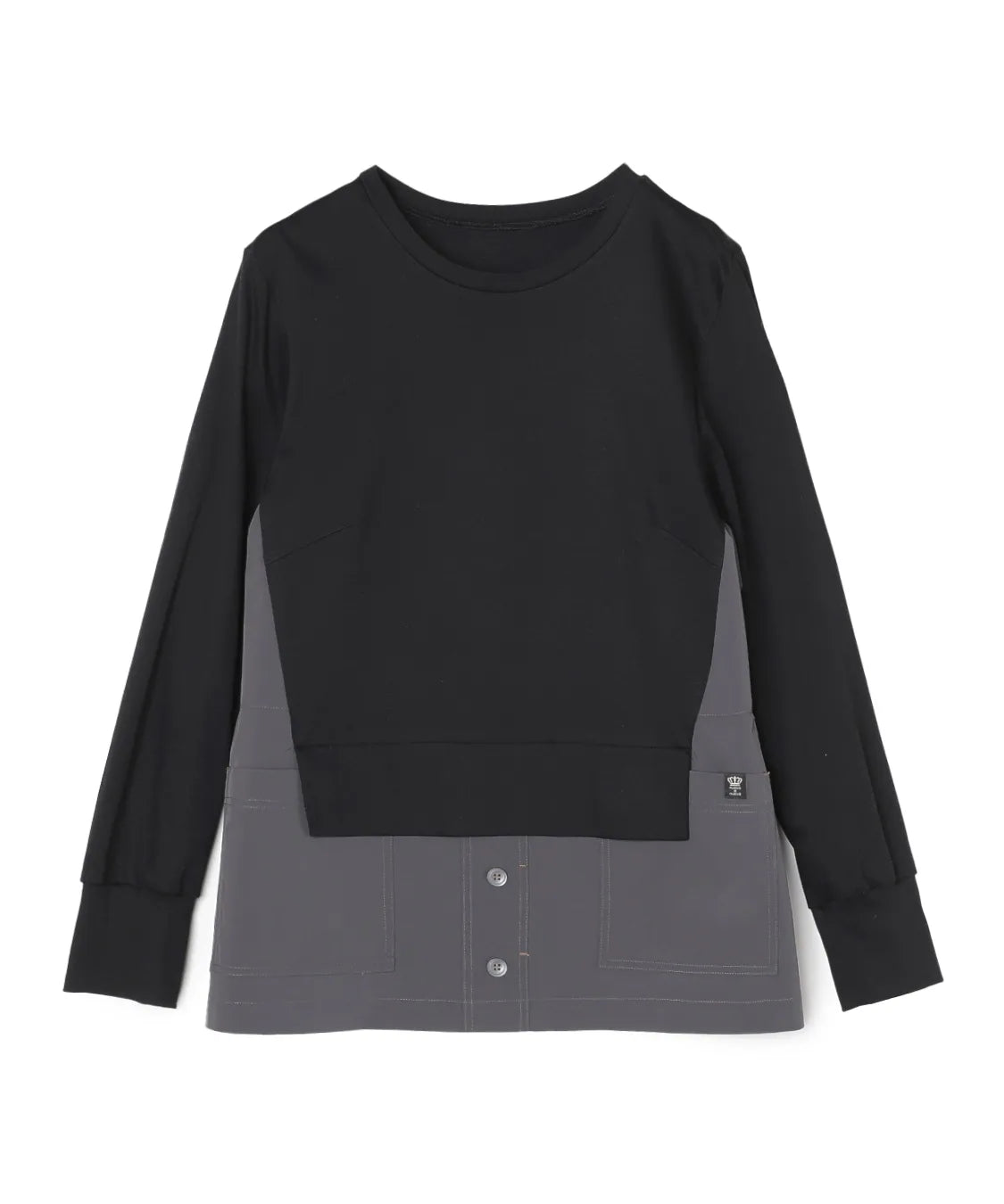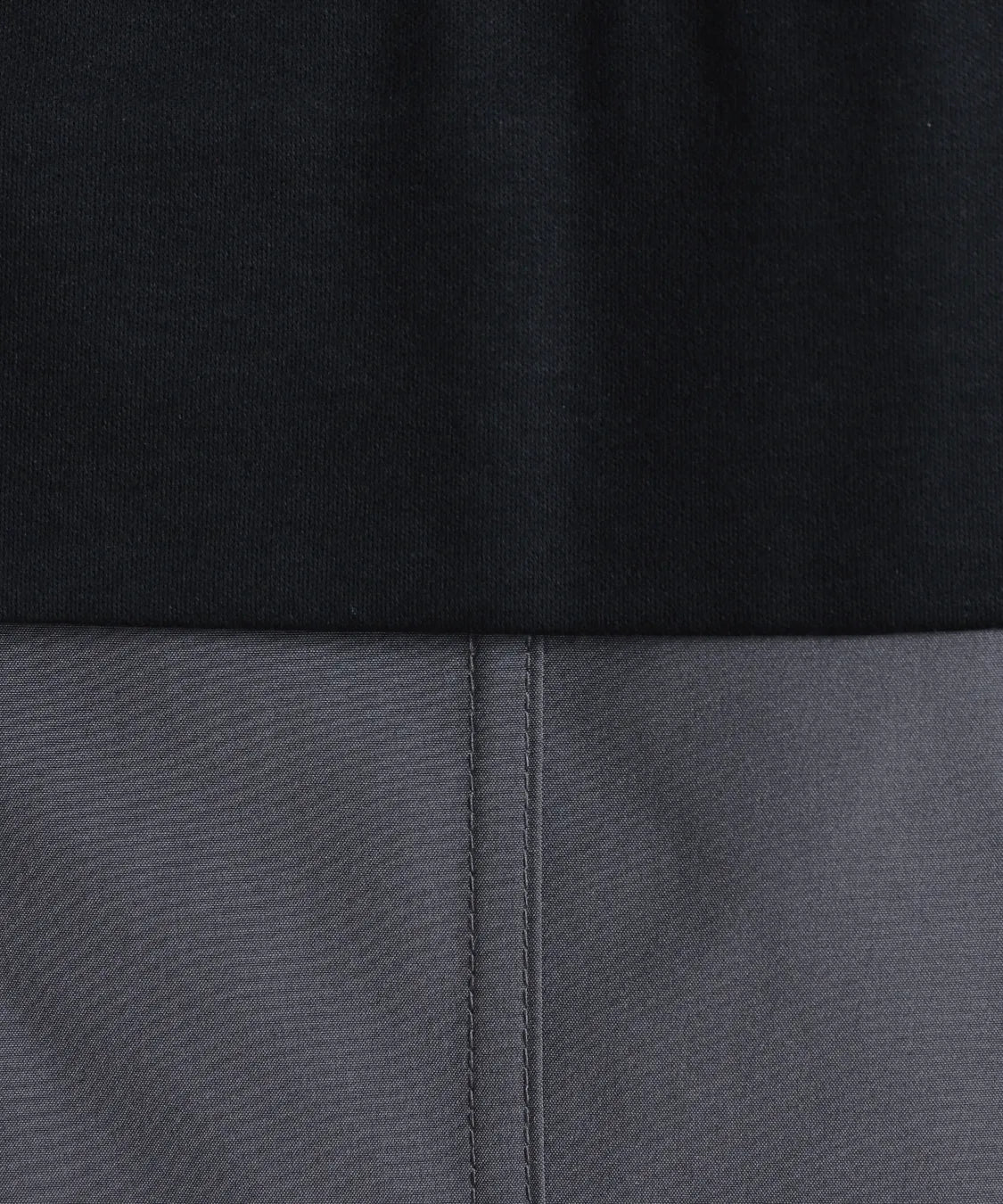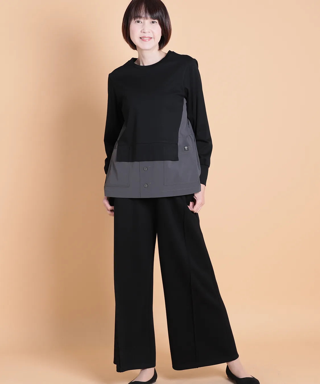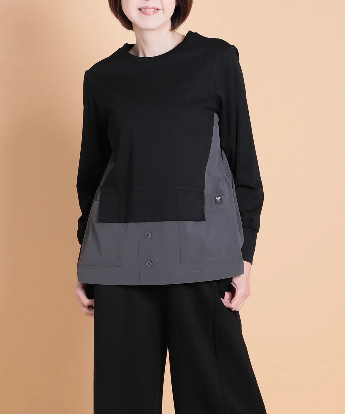 カジュアルなカットソーに光沢感のあるタフタ素材を裾に切り替えることで、他にはない個性的な一枚に仕上げました。