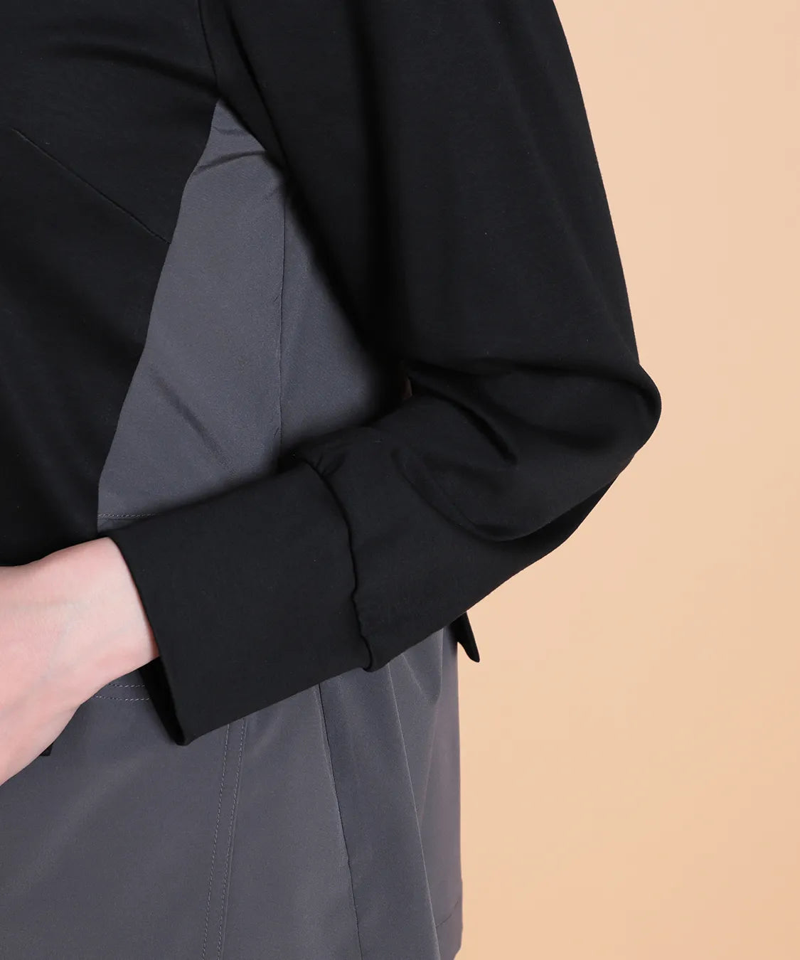 異素材の切り替え部分がグレーで、モノトーンの配色が洗練された雰囲気を演出。