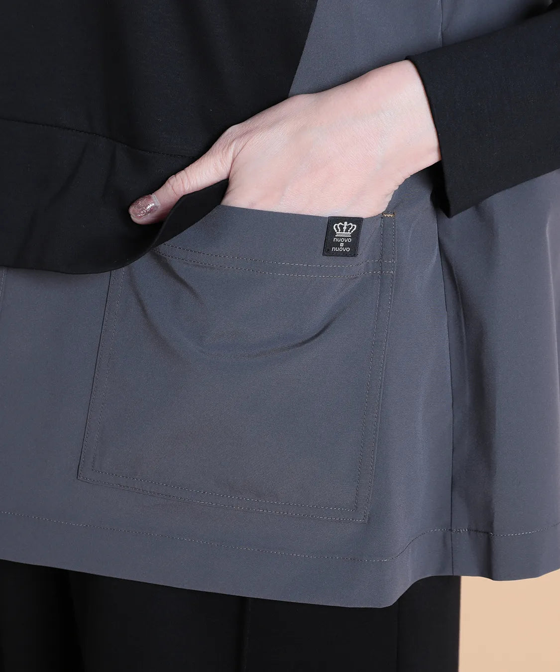別布部分はポリエステル100%のタフタ素材で、上品な光沢感と適度な張り感があり、異素材ミックスが際立つデザインです。