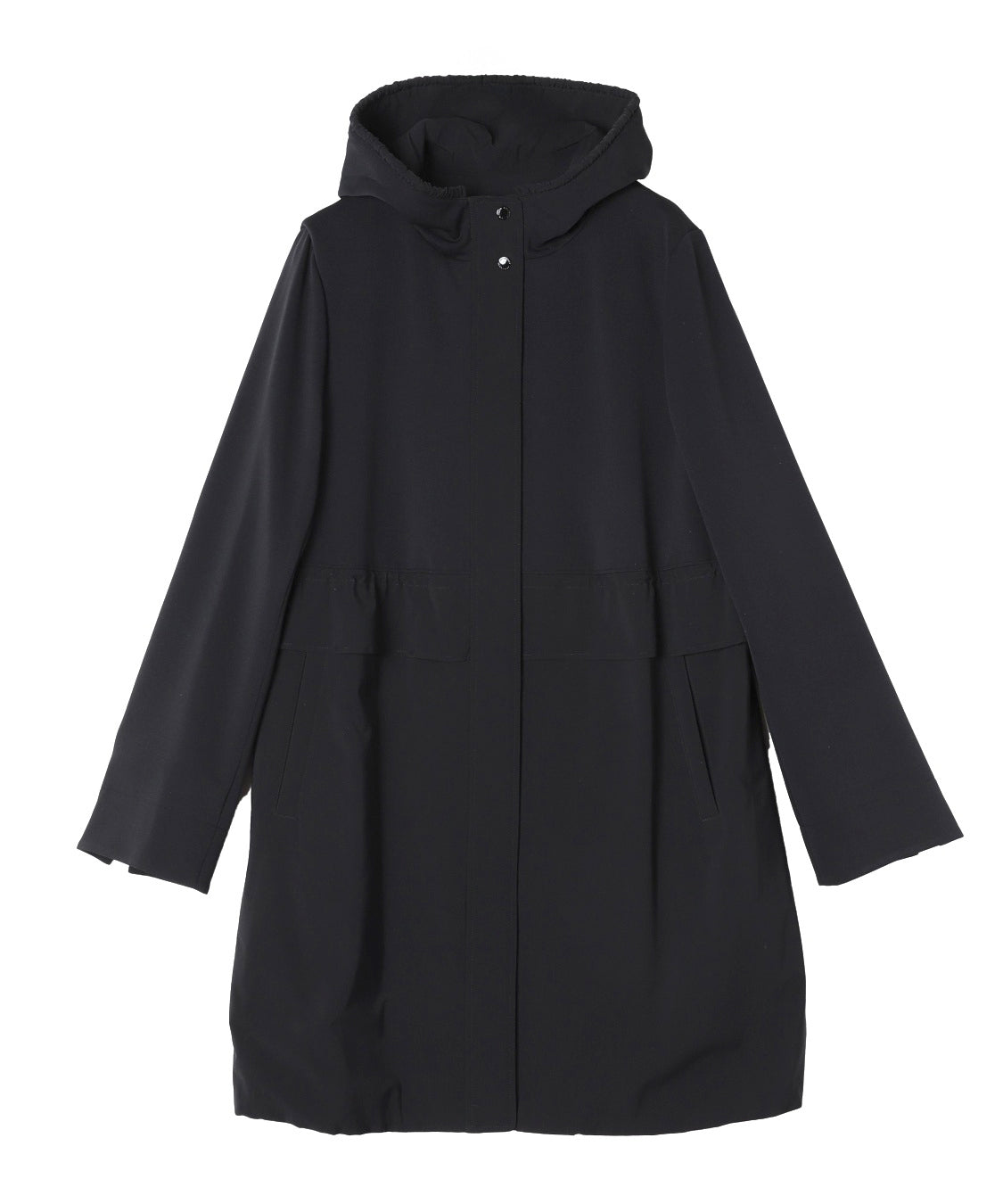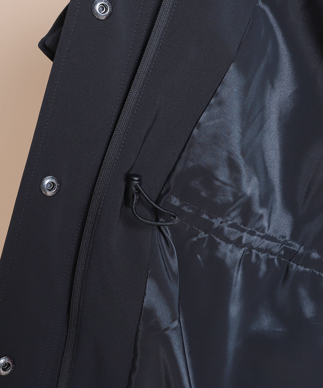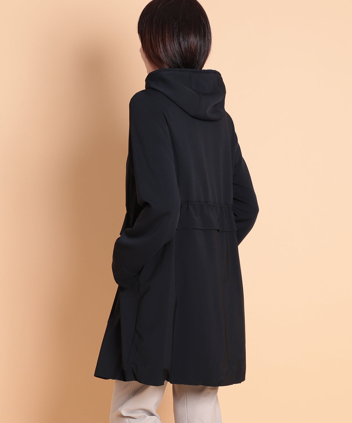 軽いポリエステル素材を使用したライトコート。ウエストと裾部分にはドロストのデザインを入れて、ひもで引っ張って絞ることで表情が変えられます。肌寒い時に着回せるアウターで1枚持っておくと便利なアイテムです。