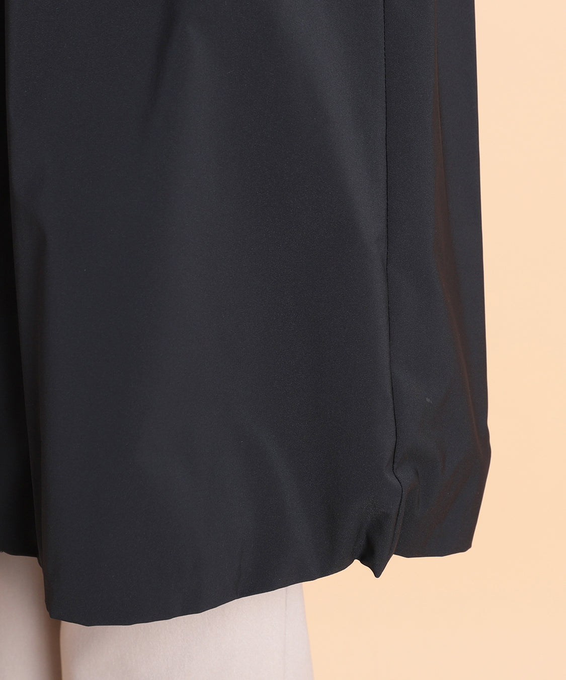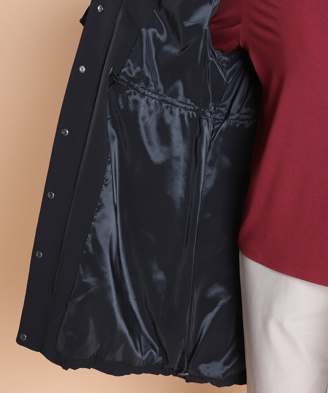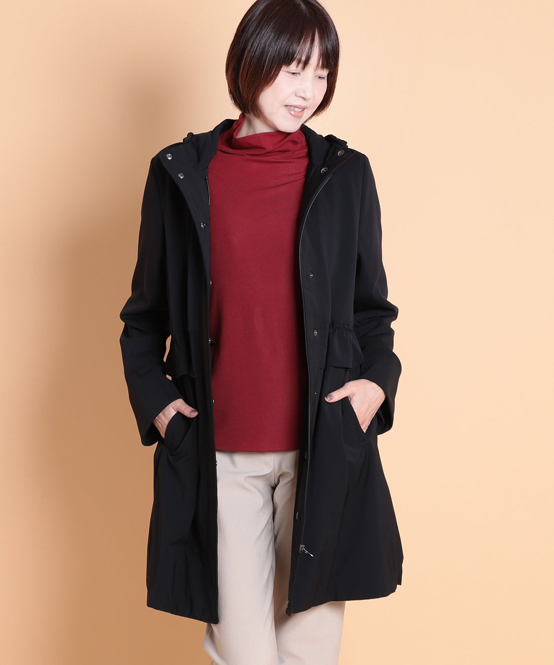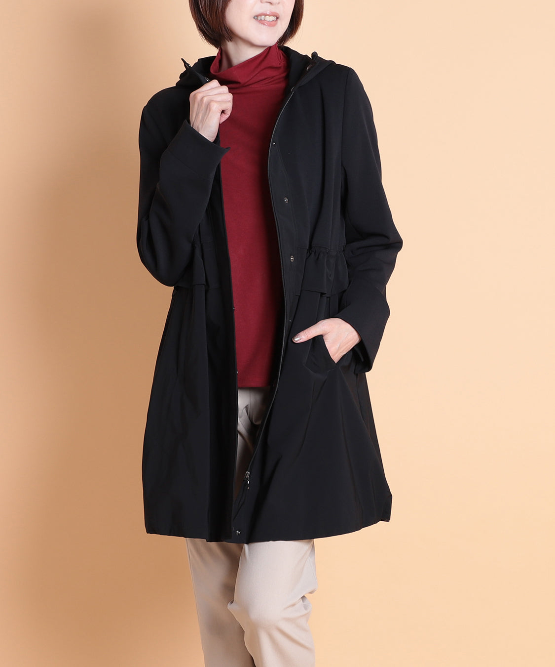 軽いポリエステル素材を使用したライトコート。ウエストと裾部分にはドロストのデザインを入れて、ひもで引っ張って絞ることで表情が変えられます。肌寒い時に着回せるアウターで1枚持っておくと便利なアイテムです。