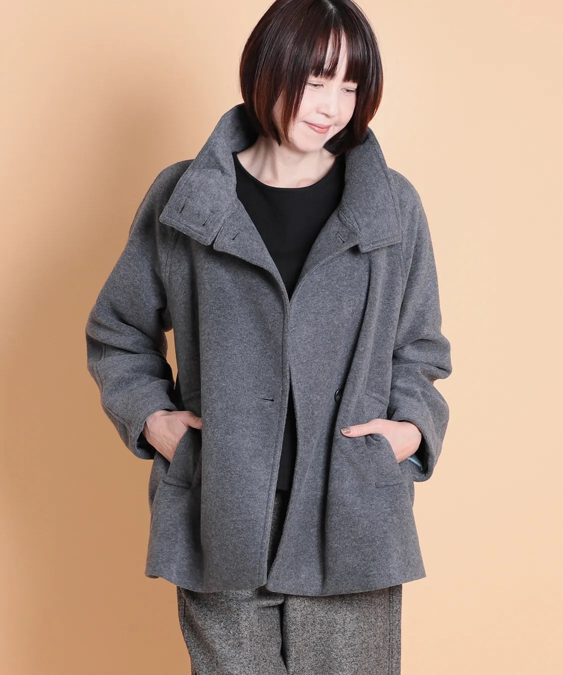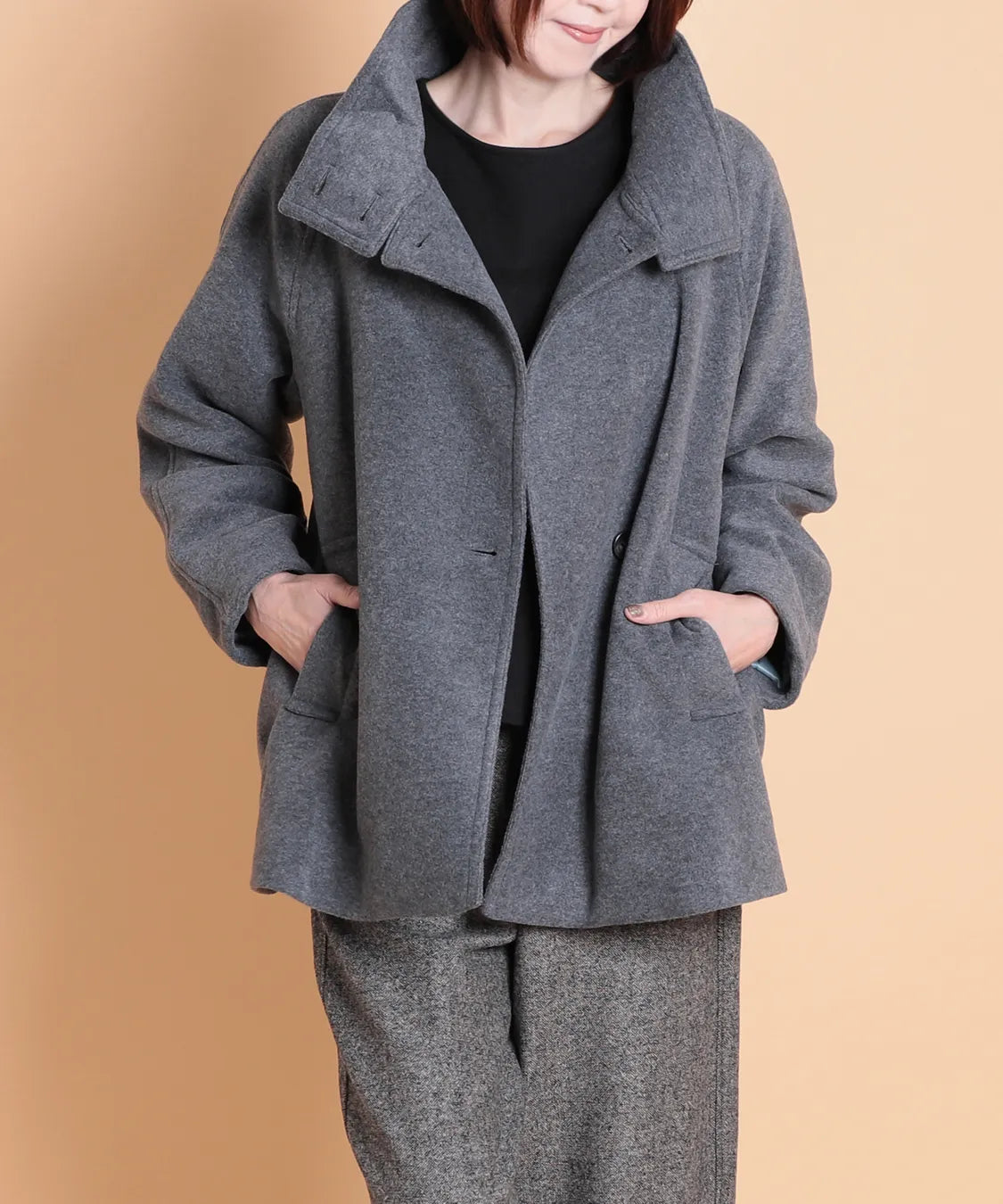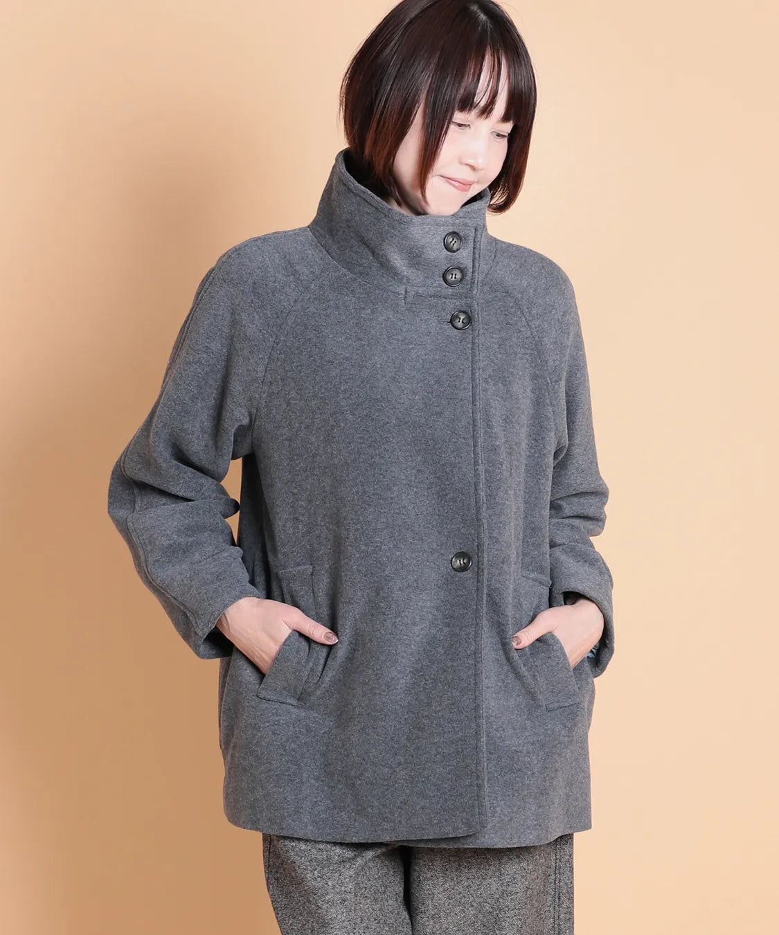 軽くてやわらかな風合いが魅力のスタンドカラージャケット。高めに立ち上がる襟が首元までしっかり包み込み、寒い季節も快適に過ごせます。フロントはボタンデザインで上品な印象に仕上げながら、着脱もスムーズです。